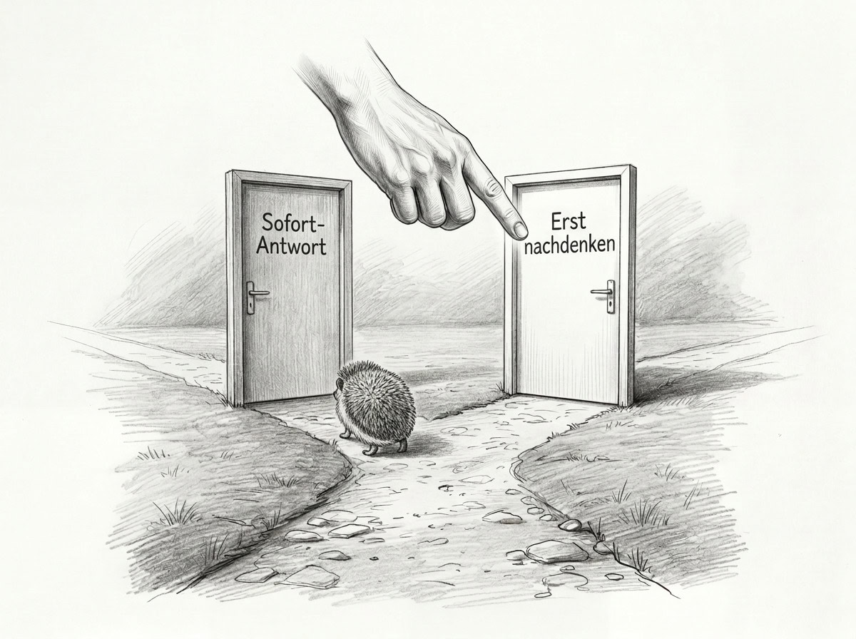 Provokationen statt Hinweise. Drosos und Kollegen von Microsoft Research haben 2025 untersucht, was passiert, wenn KI-Systeme nicht nur Vorschläge machen, sondern diese gleichzeitig in Frage stellen. Ihre „Provocations“ sind kurze Textimpulse, die Schwächen, Risiken und Alternativen zu KI-Empfehlungen aufzeigen. In einem Experiment mit 24 Teilnehmern bei KI-gestützten Entscheidungsaufgaben zeigten sie: Provokationen aktivieren metakognitives und kritisches Denken auf mehreren Ebenen. Der entscheidende Unterschied zum Nudge: Eine Provokation sagt nicht „Prüf das“. Sie sagt „Hier ist ein konkreter Grund, warum das falsch sein könnte.“ Das ist unbequemer und deshalb wirksamer.