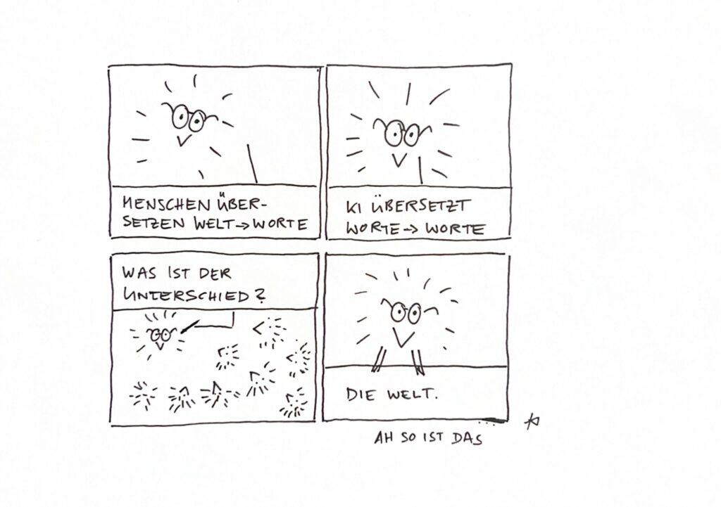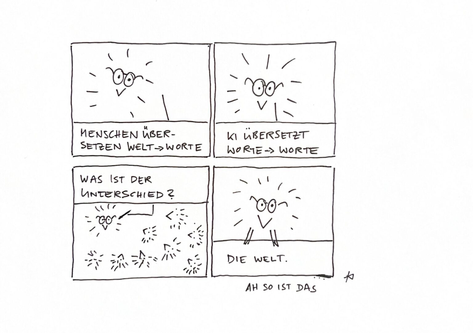 ChatGPT kann brillante Texte schreiben. Claude erklärt komplexe Zusammenhänge. Midjourney malt fotorealistische Bilder. Und trotzdem passiert in unseren Seminaren immer wieder dasselbe: Teilnehmer lassen sich hundert Kampagnen-Ideen generieren, und setzen keine einzige davon um. Nicht aus Faulheit. Sondern weil sie spüren, dass etwas fehlt. Dieses „Etwas“ hat einen Namen, der älter ist als ChatGPT: das Symbol Grounding Problem. Illustration von Vroni Hackl Der Comic oben bringt es auf den Punkt. Menschen übersetzen die Welt in