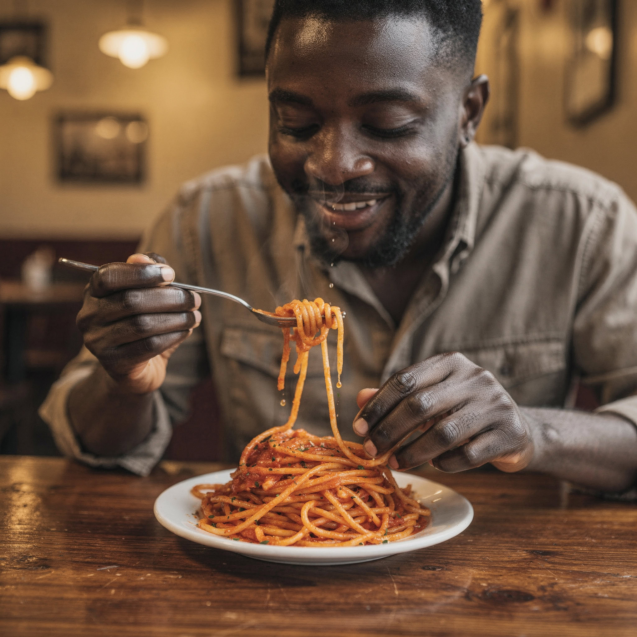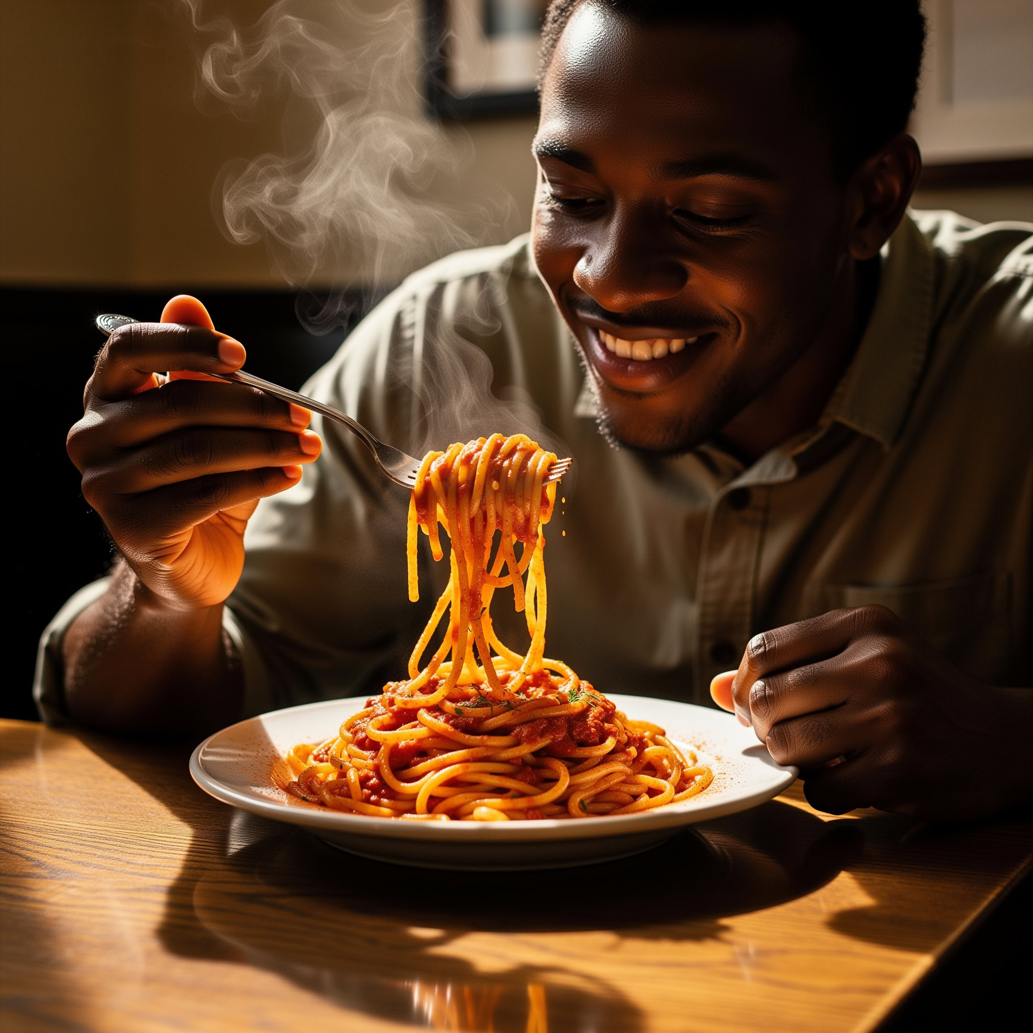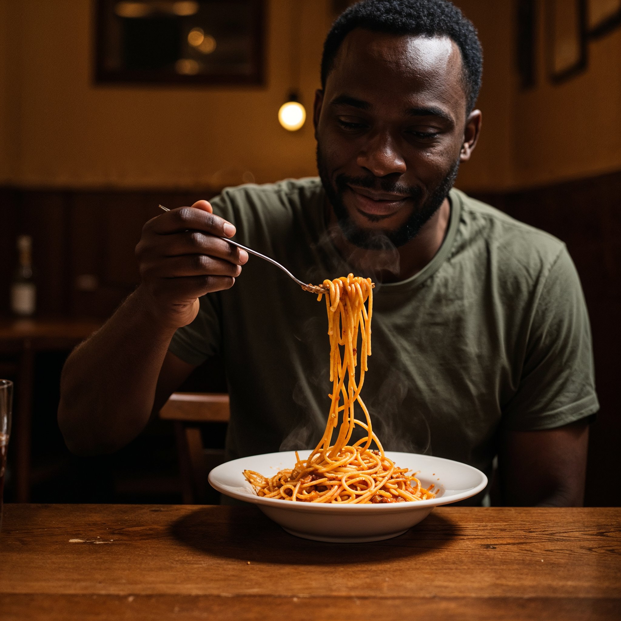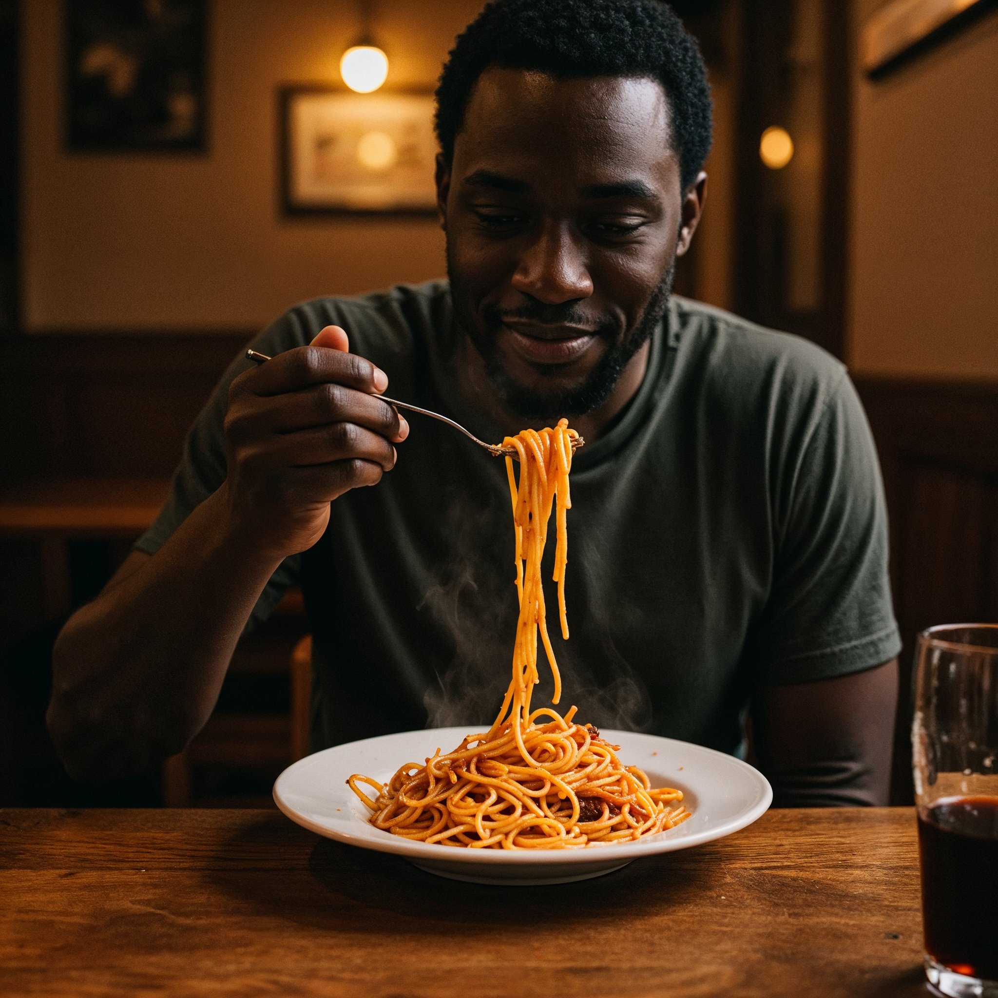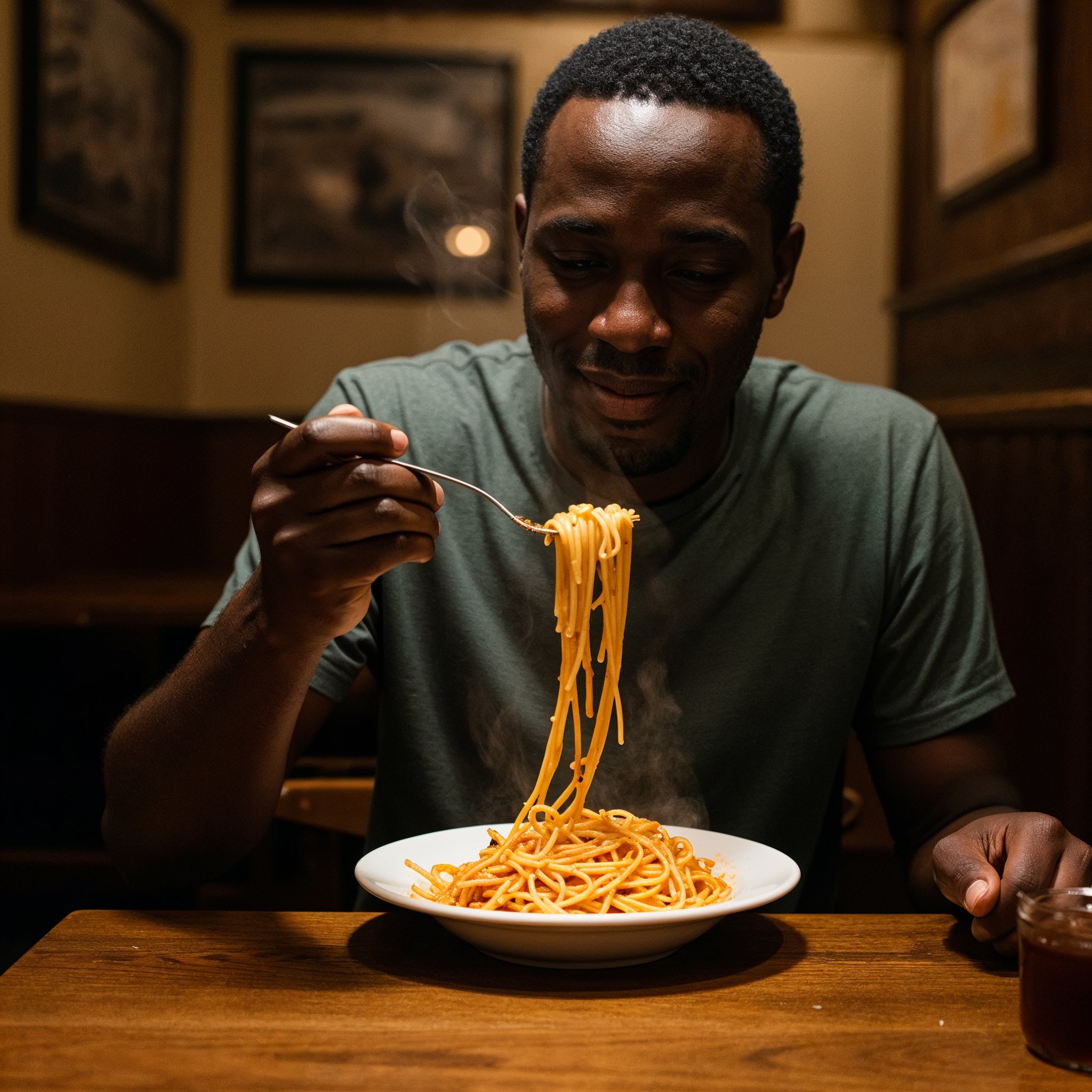 A photo of a Black man eating spaghetti with a fork in a small, cozy bistro. The man sits at a wooden table, twirling spaghetti around his fork with practiced ease, smiling slightly in a relaxed and natural manner. The plate of spaghetti is steaming, rich in texture and color, with subtle glistening from the sauce. Warm ambient lighting fills the scene, casting soft reflections on the table and emphasizing the texture of the noodles, skin, and fabric of his casual shirt. The mood is authentic and intimate, capturing a moment of quiet enjoyment. 50mm lens, shallow depth of field, cinematic tone, natural lighting, close-up shot, eye-level view.