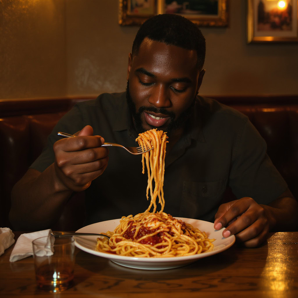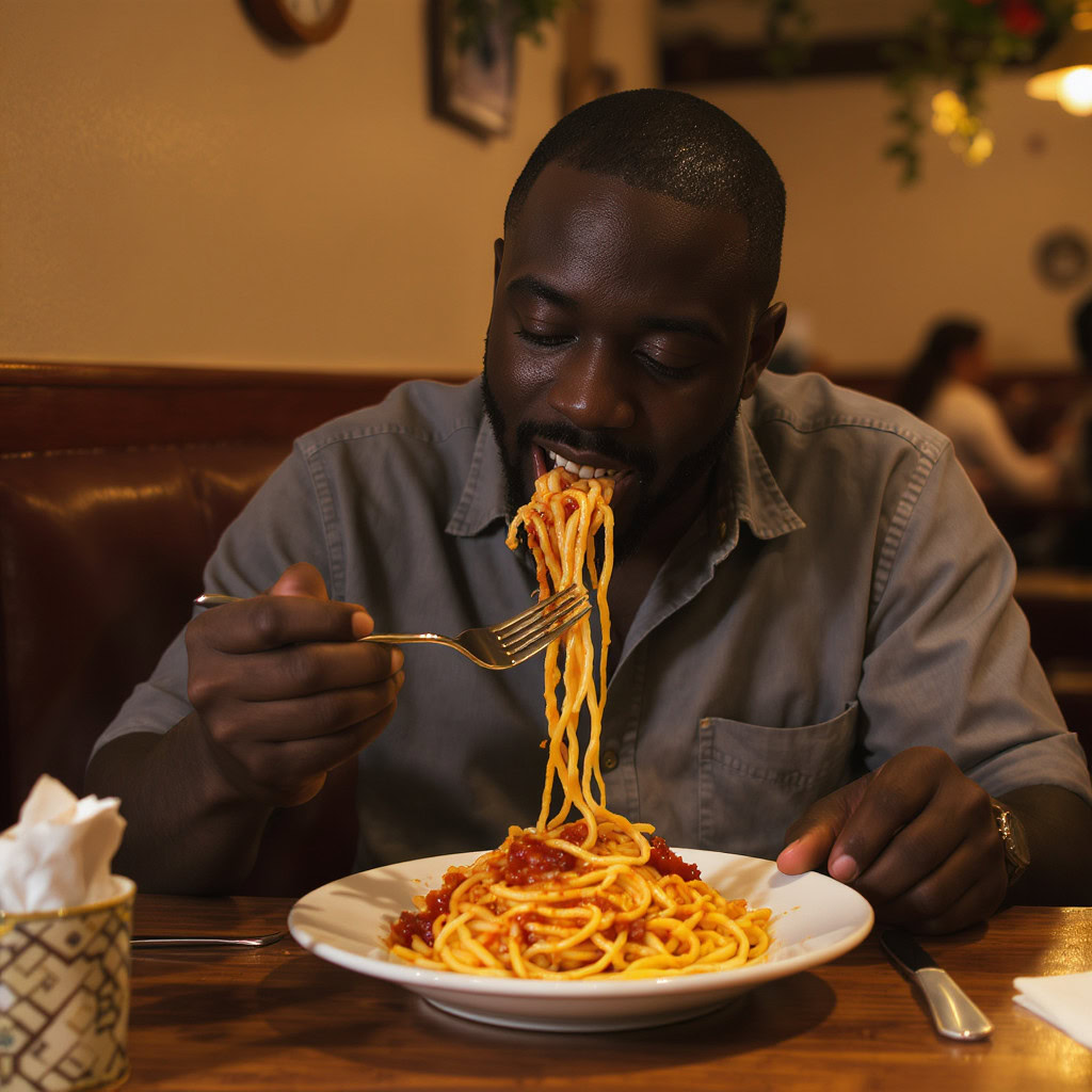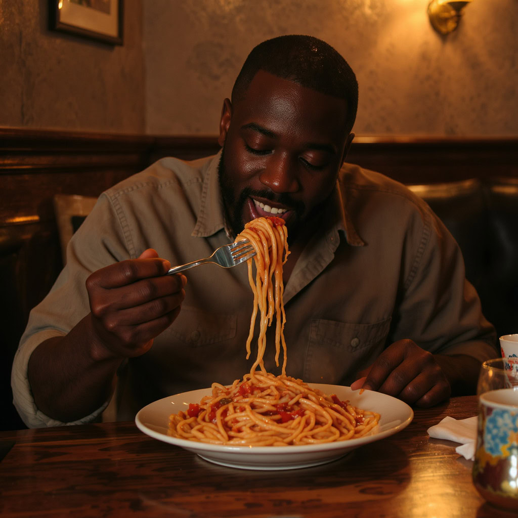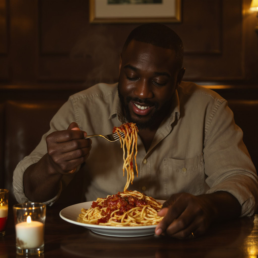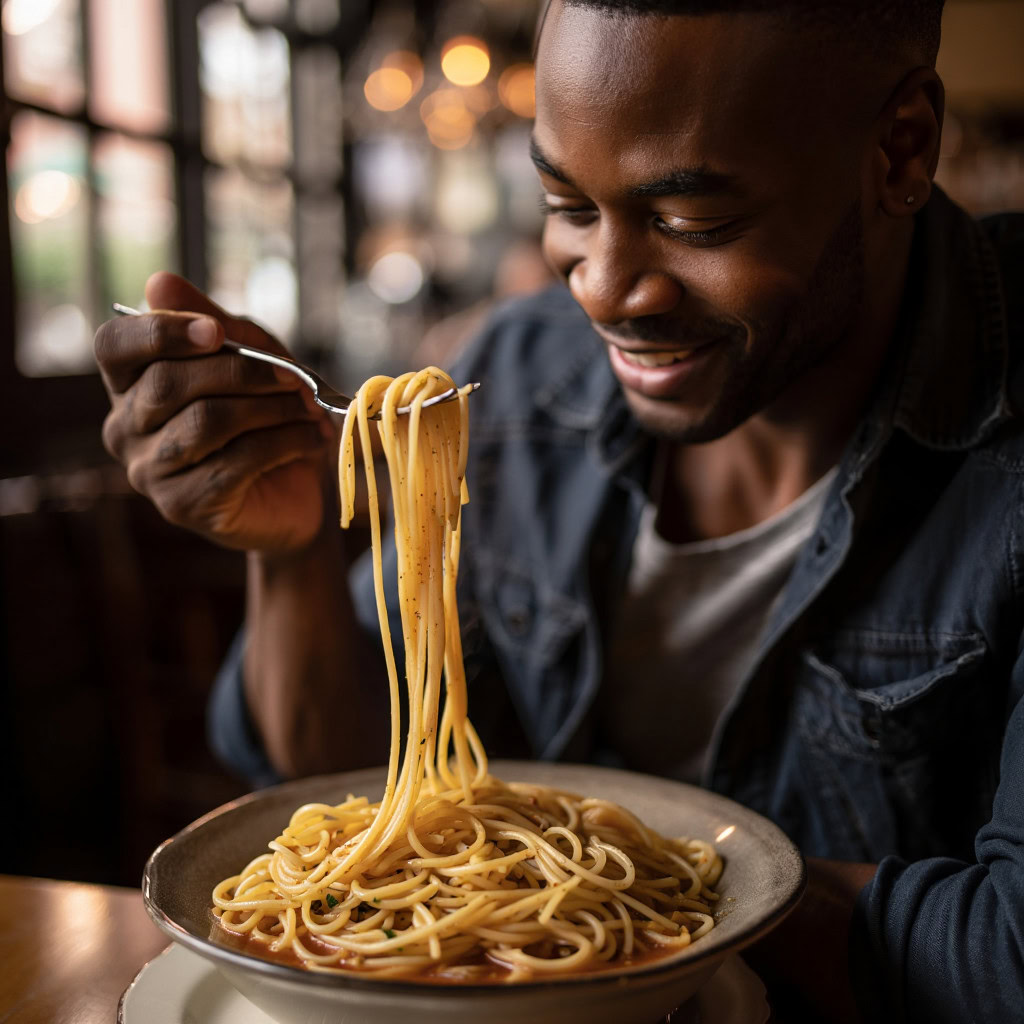 A photo of a Black man eating spaghetti with a fork in a small, cozy bistro. The man sits at a wooden table, twirling spaghetti around his fork with practiced ease, smiling slightly in a relaxed and natural manner. The plate of spaghetti is steaming, rich in texture and color, with subtle glistening from the sauce. Warm ambient lighting fills the scene, casting soft reflections on the table and emphasizing the texture of the noodles, skin, and fabric of his casual shirt. The mood is authentic and intimate, capturing a moment of quiet enjoyment. 50mm lens, shallow depth of field, cinematic tone, natural lighting, close-up shot, eye-level view.