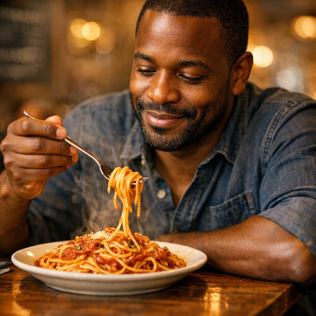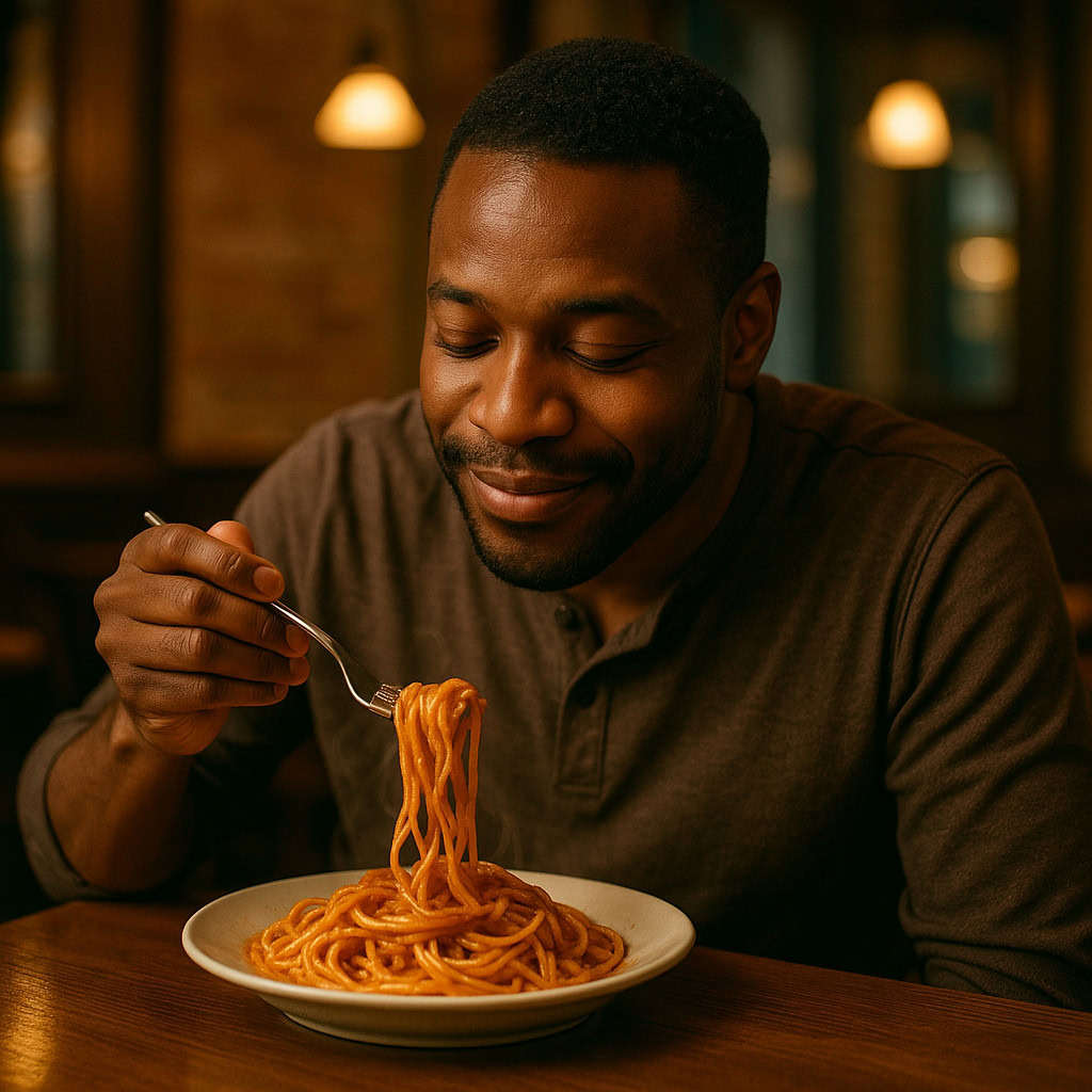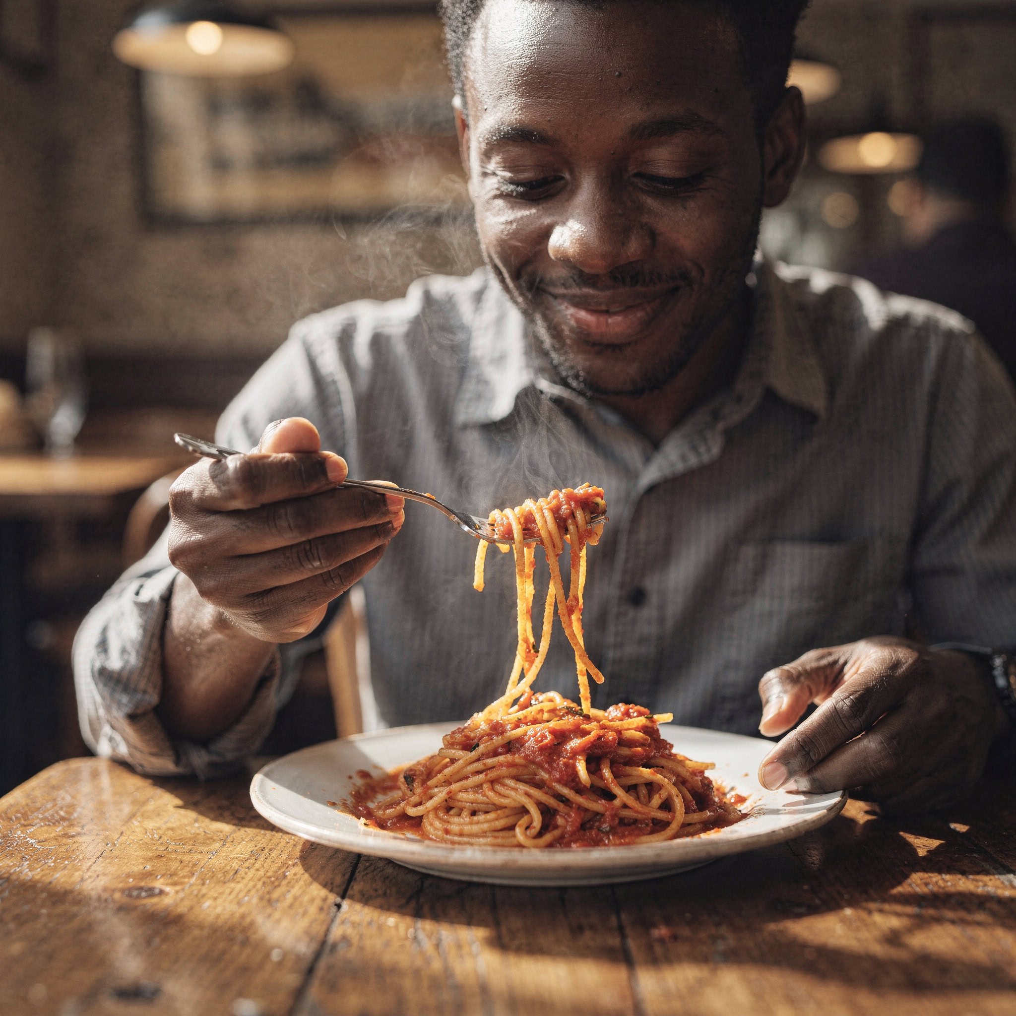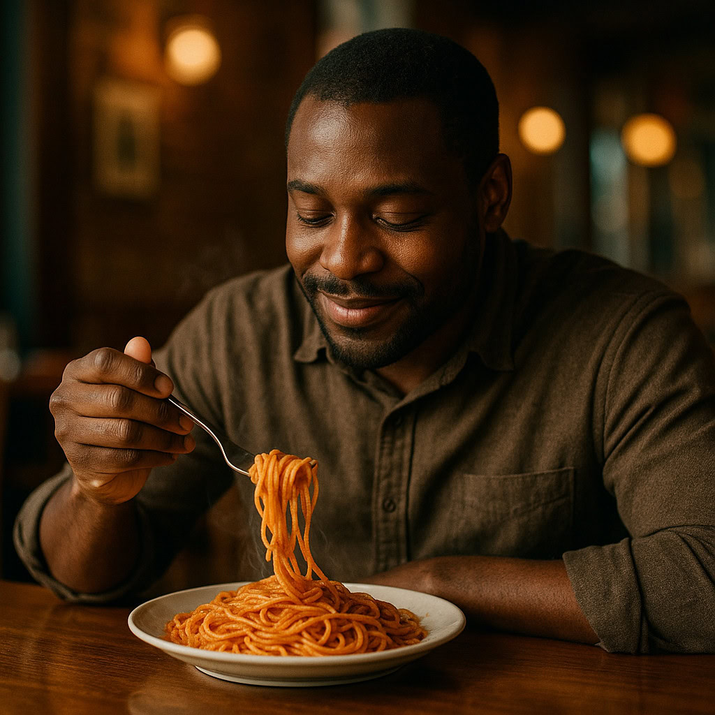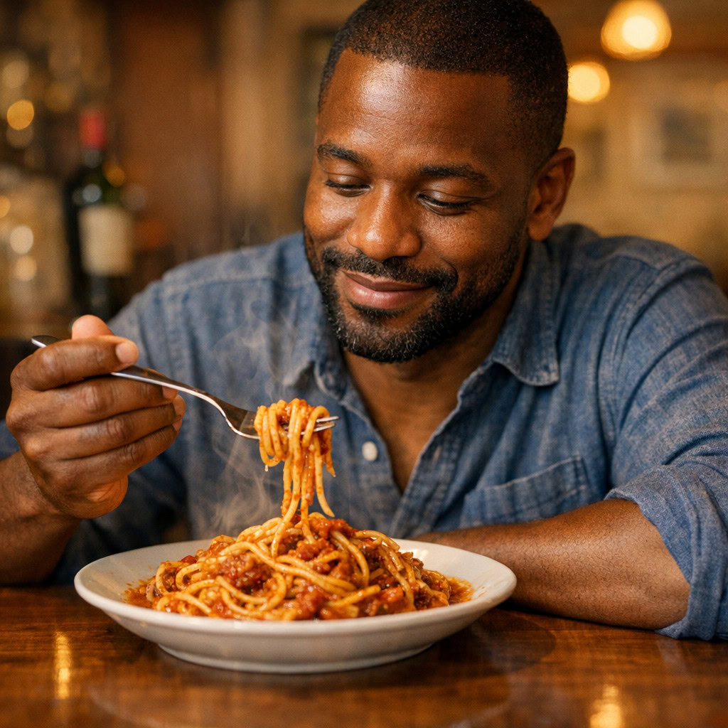 A photo of a Black man eating spaghetti with a fork in a small, cozy bistro. The man sits at a wooden table, twirling spaghetti around his fork with practiced ease, smiling slightly in a relaxed and natural manner. The plate of spaghetti is steaming, rich in texture and color, with subtle glistening from the sauce. Warm ambient lighting fills the scene, casting soft reflections on the table and emphasizing the texture of the noodles, skin, and fabric of his casual shirt. The mood is authentic and intimate, capturing a moment of quiet enjoyment. 50mm lens, shallow depth of field, cinematic tone, natural lighting, close-up shot, eye-level view.