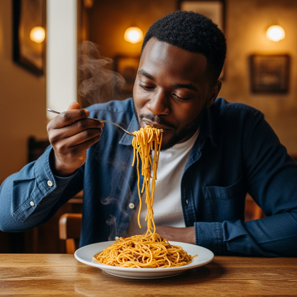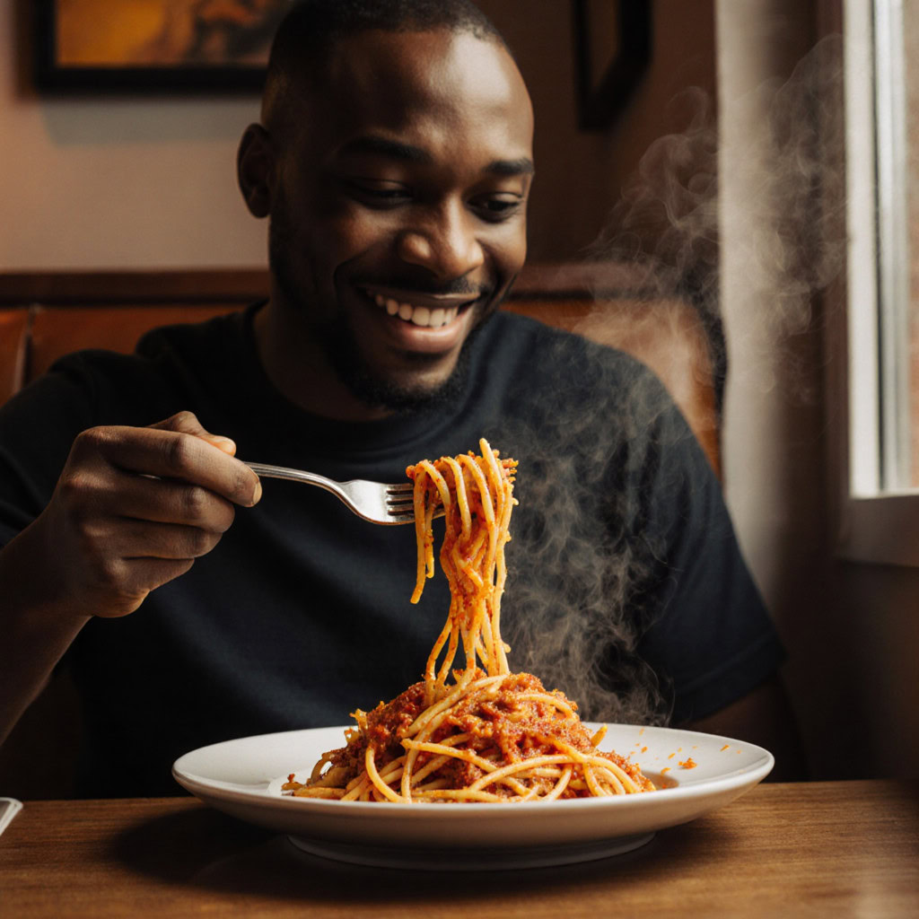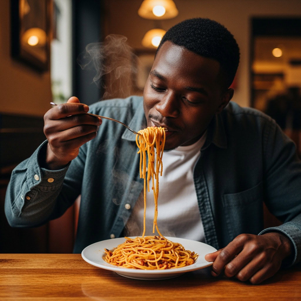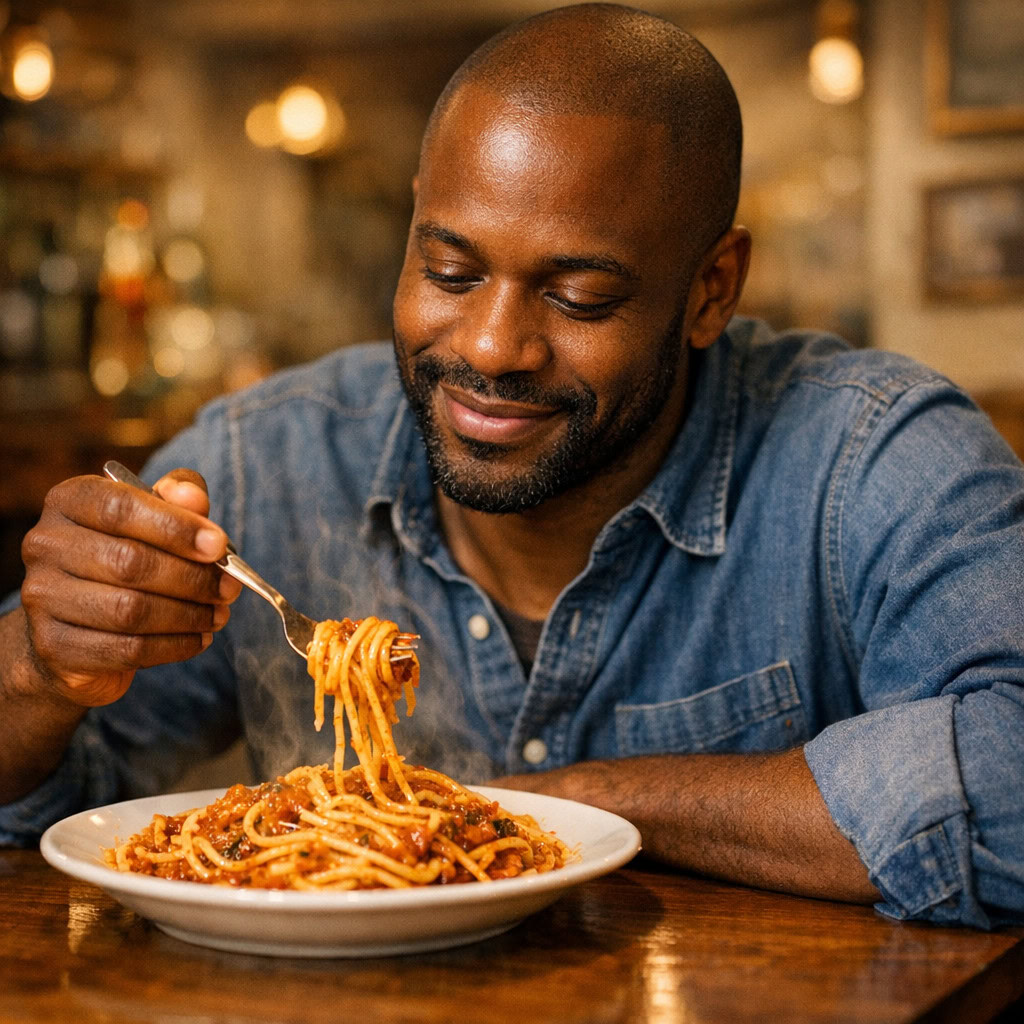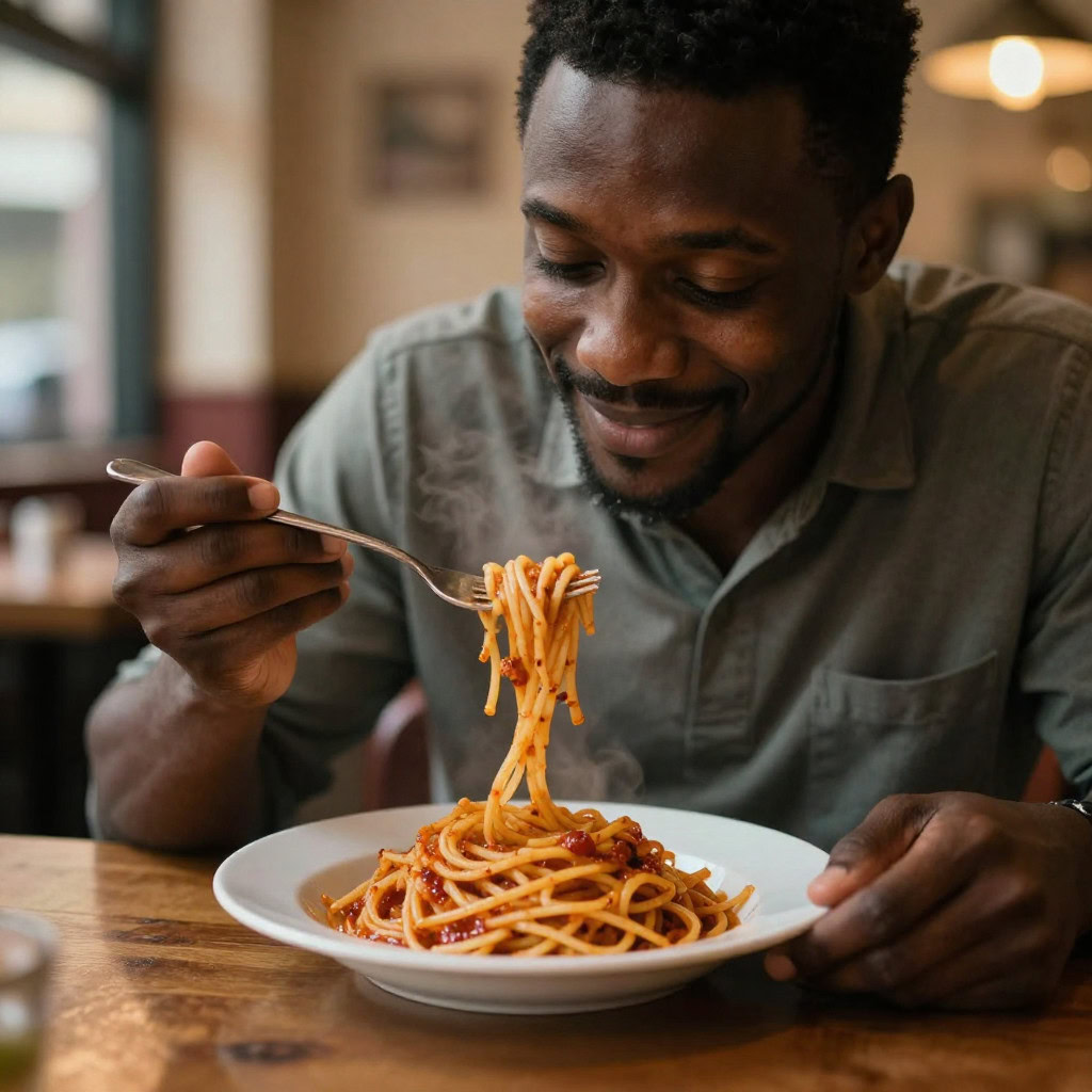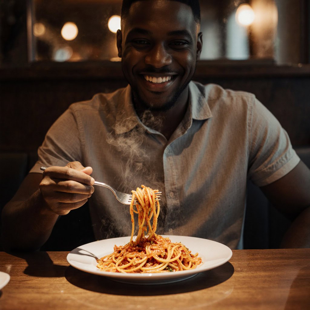 A photo of a Black man eating spaghetti with a fork in a small, cozy bistro. The man sits at a wooden table, twirling spaghetti around his fork with practiced ease, smiling slightly in a relaxed and natural manner. The plate of spaghetti is steaming, rich in texture and color, with subtle glistening from the sauce. Warm ambient lighting fills the scene, casting soft reflections on the table and emphasizing the texture of the noodles, skin, and fabric of his casual shirt. The mood is authentic and intimate, capturing a moment of quiet enjoyment. 50mm lens, shallow depth of field, cinematic tone, natural lighting, close-up shot, eye-level view.