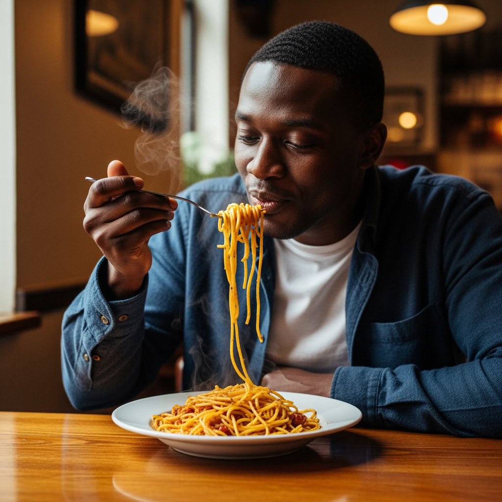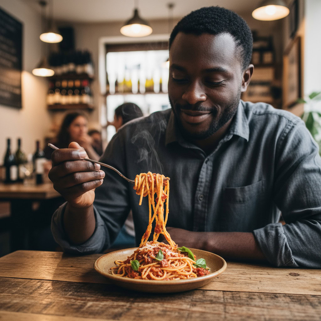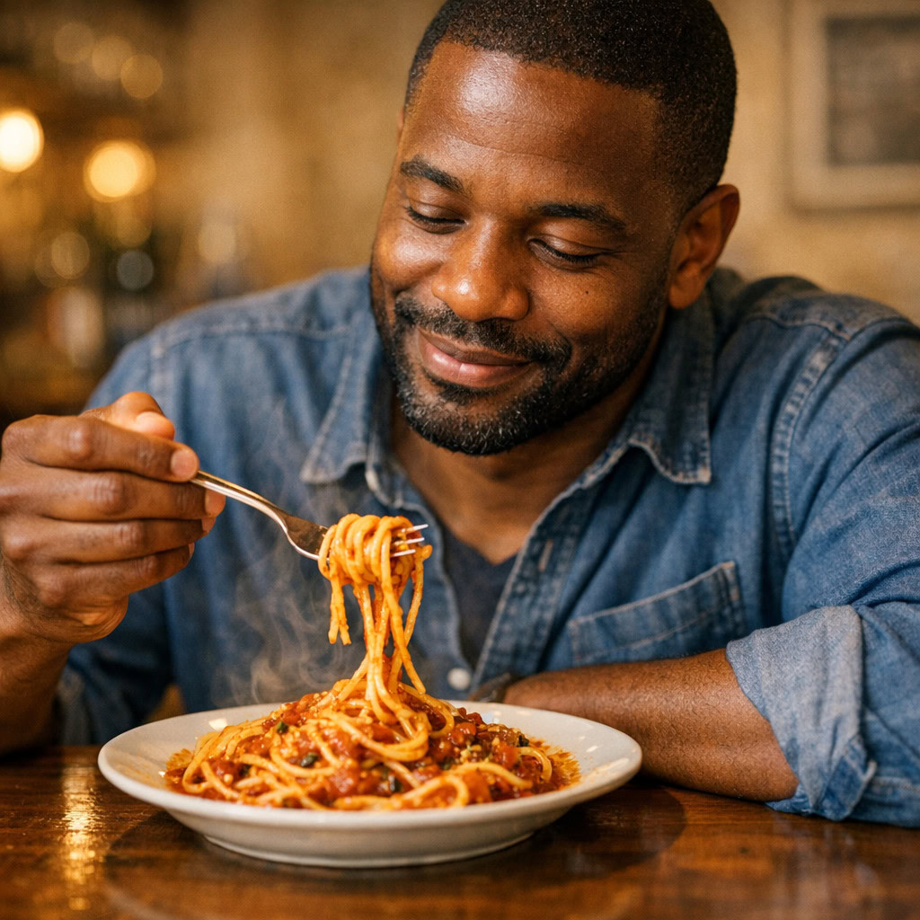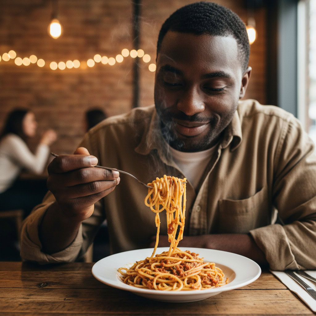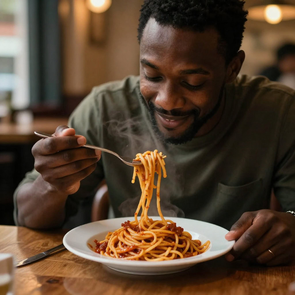 A photo of a Black man eating spaghetti with a fork in a small, cozy bistro. The man sits at a wooden table, twirling spaghetti around his fork with practiced ease, smiling slightly in a relaxed and natural manner. The plate of spaghetti is steaming, rich in texture and color, with subtle glistening from the sauce. Warm ambient lighting fills the scene, casting soft reflections on the table and emphasizing the texture of the noodles, skin, and fabric of his casual shirt. The mood is authentic and intimate, capturing a moment of quiet enjoyment. 50mm lens, shallow depth of field, cinematic tone, natural lighting, close-up shot, eye-level view.