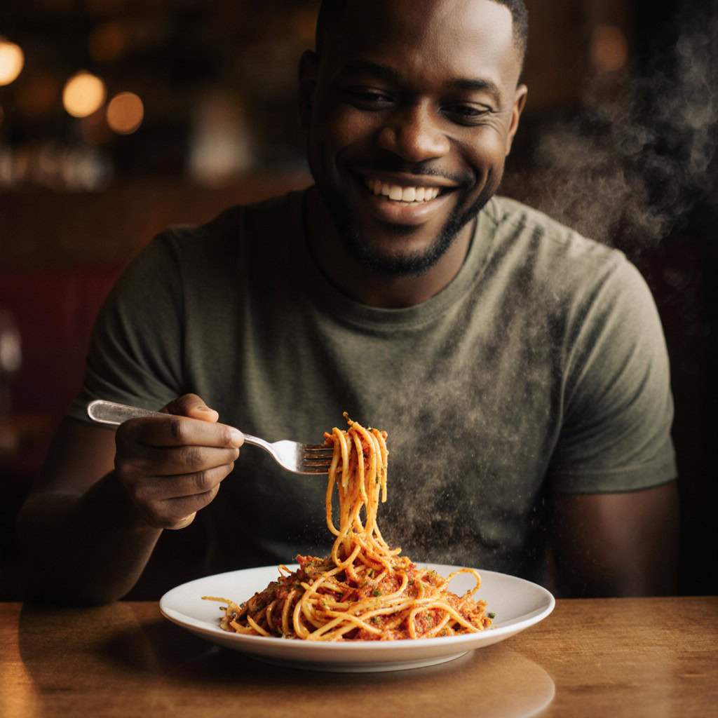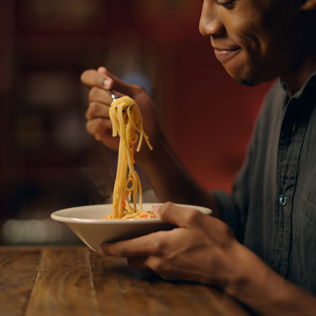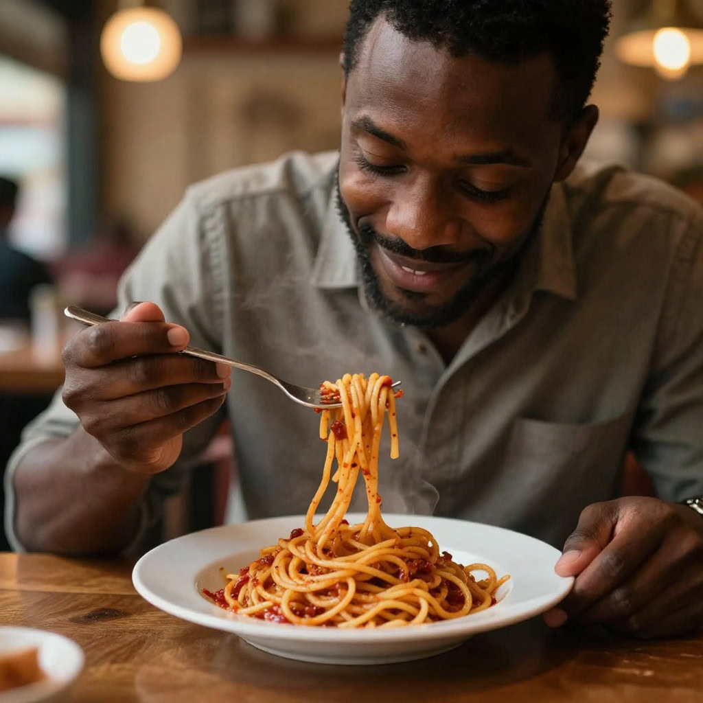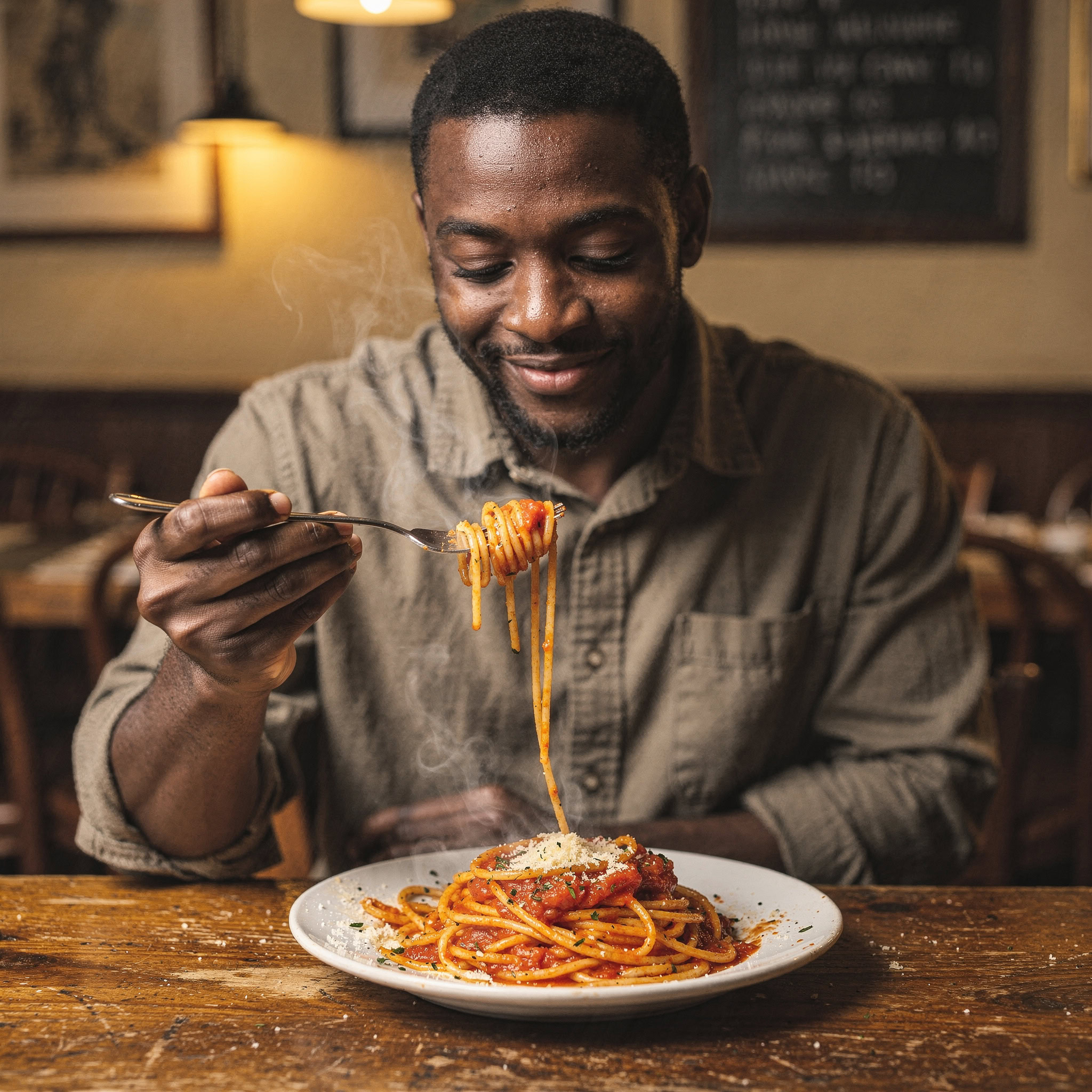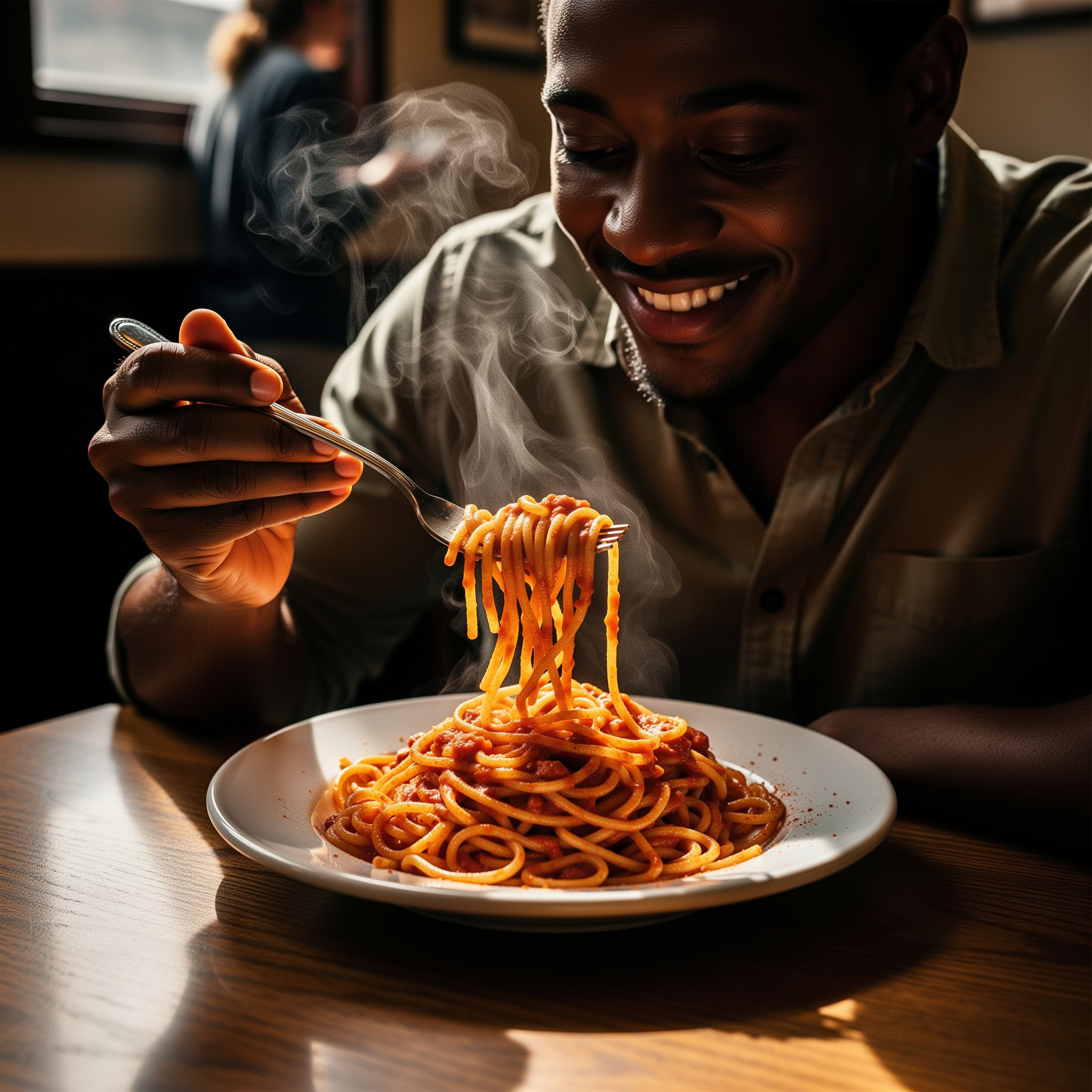 A photo of a Black man eating spaghetti with a fork in a small, cozy bistro. The man sits at a wooden table, twirling spaghetti around his fork with practiced ease, smiling slightly in a relaxed and natural manner. The plate of spaghetti is steaming, rich in texture and color, with subtle glistening from the sauce. Warm ambient lighting fills the scene, casting soft reflections on the table and emphasizing the texture of the noodles, skin, and fabric of his casual shirt. The mood is authentic and intimate, capturing a moment of quiet enjoyment. 50mm lens, shallow depth of field, cinematic tone, natural lighting, close-up shot, eye-level view.