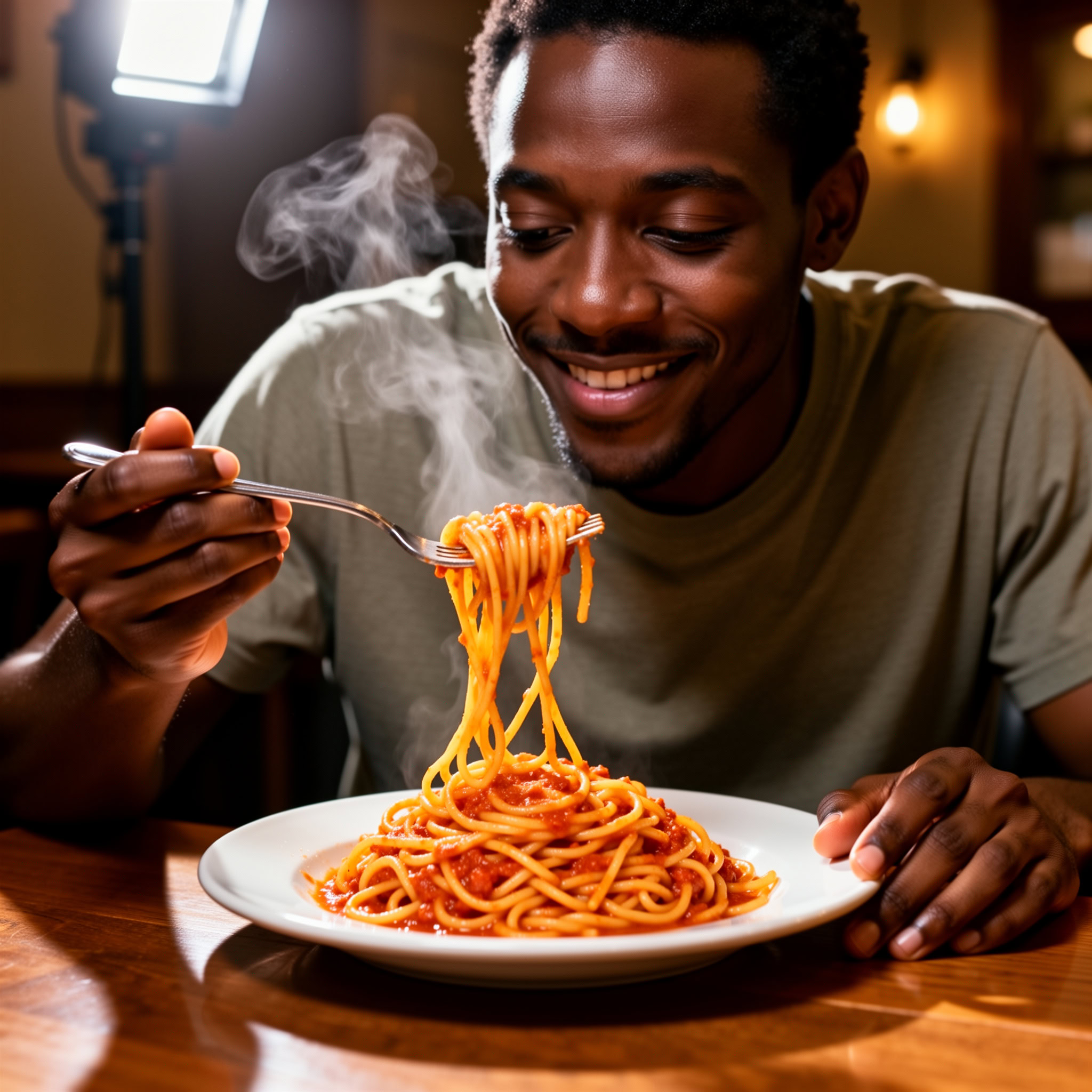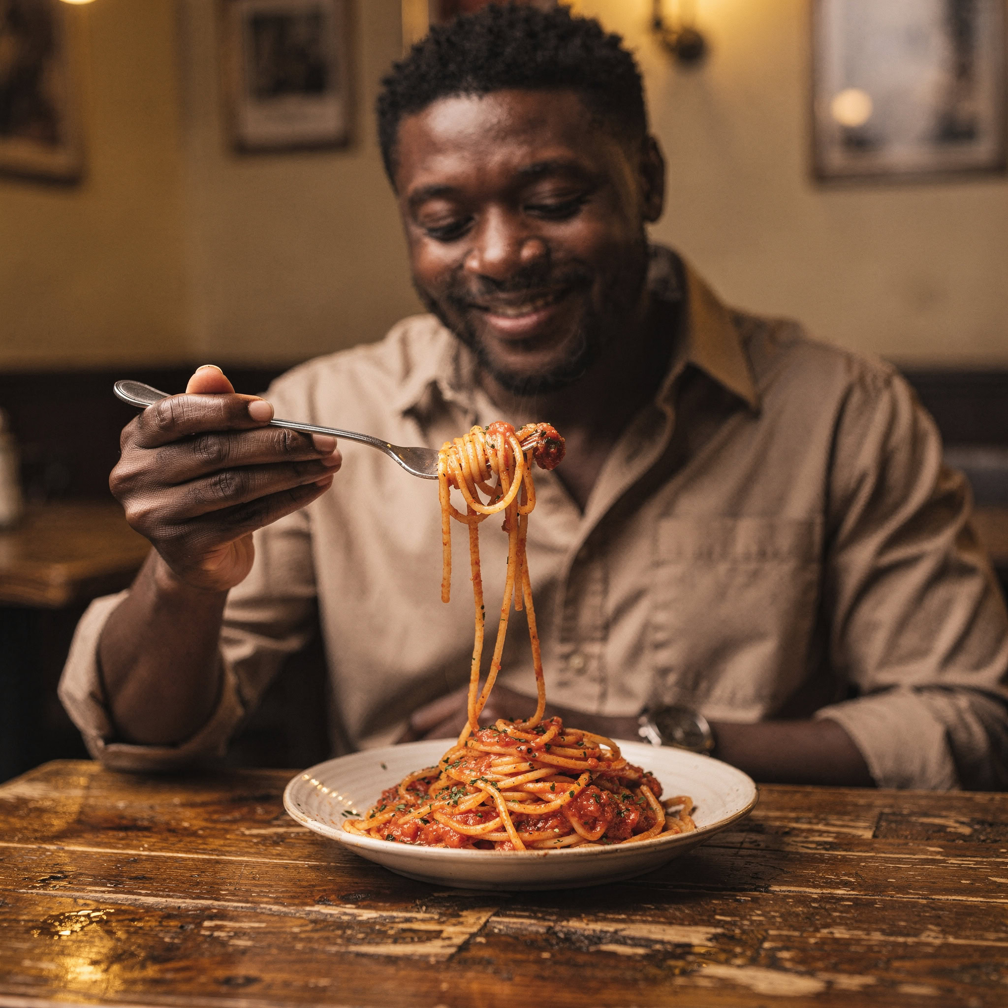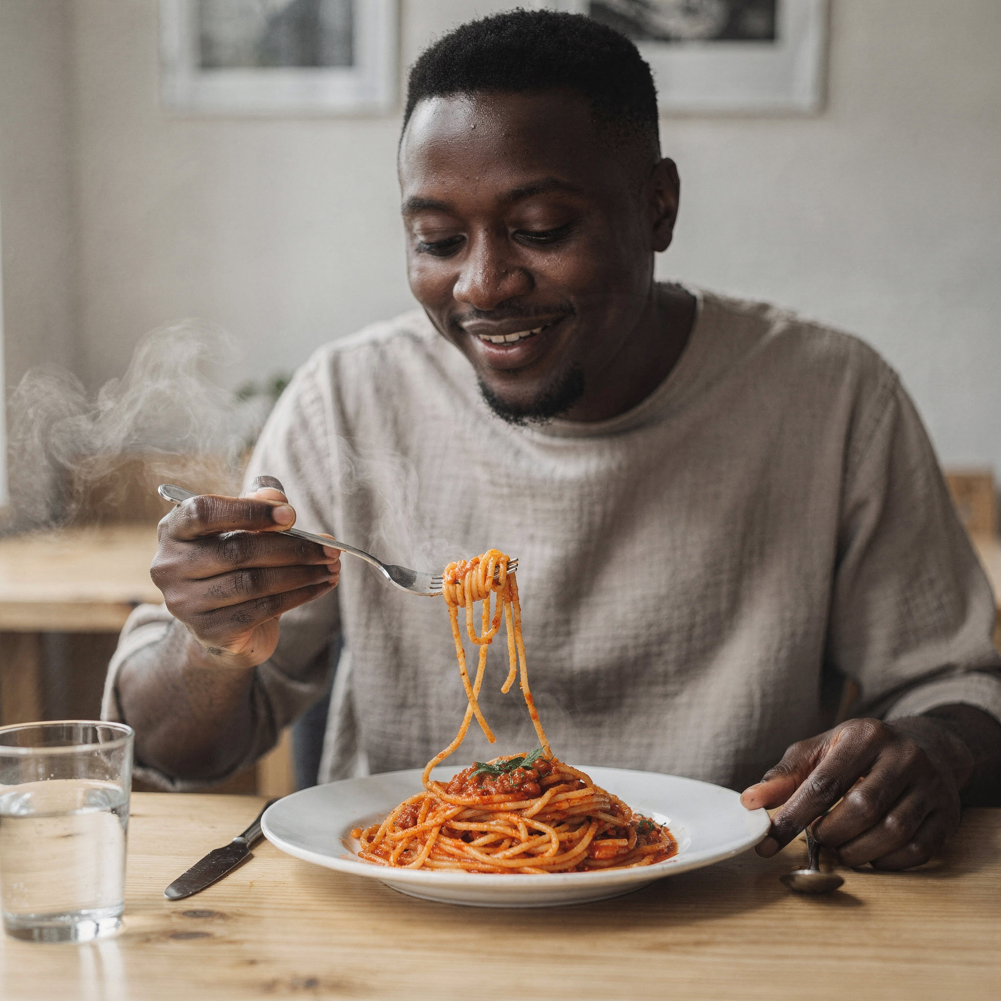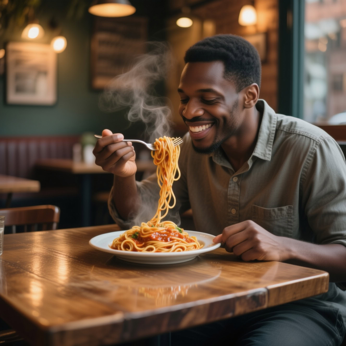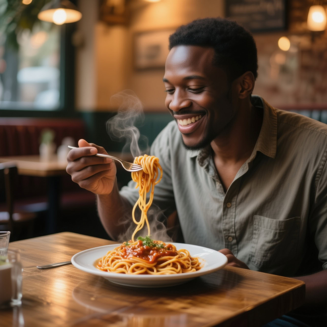 A photo of a Black man eating spaghetti with a fork in a small, cozy bistro. The man sits at a wooden table, twirling spaghetti around his fork with practiced ease, smiling slightly in a relaxed and natural manner. The plate of spaghetti is steaming, rich in texture and color, with subtle glistening from the sauce. Warm ambient lighting fills the scene, casting soft reflections on the table and emphasizing the texture of the noodles, skin, and fabric of his casual shirt. The mood is authentic and intimate, capturing a moment of quiet enjoyment. 50mm lens, shallow depth of field, cinematic tone, natural lighting, close-up shot, eye-level view.