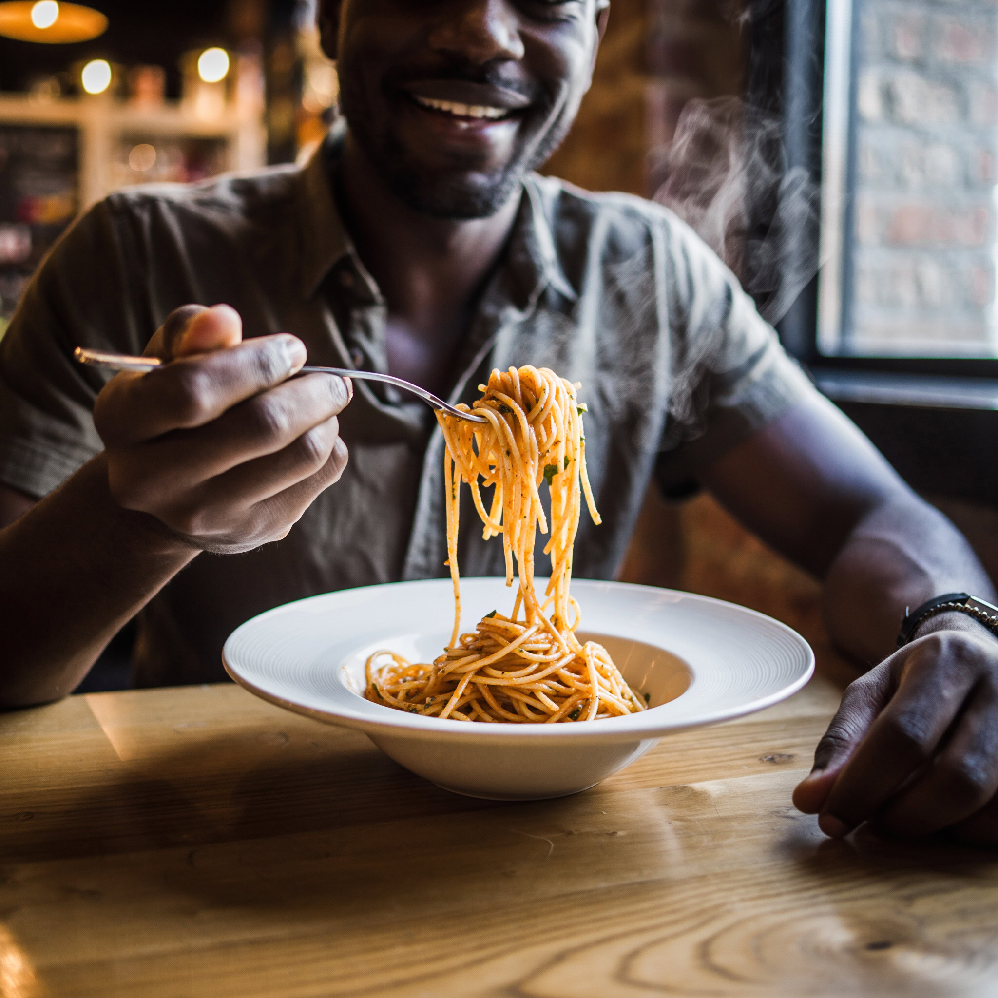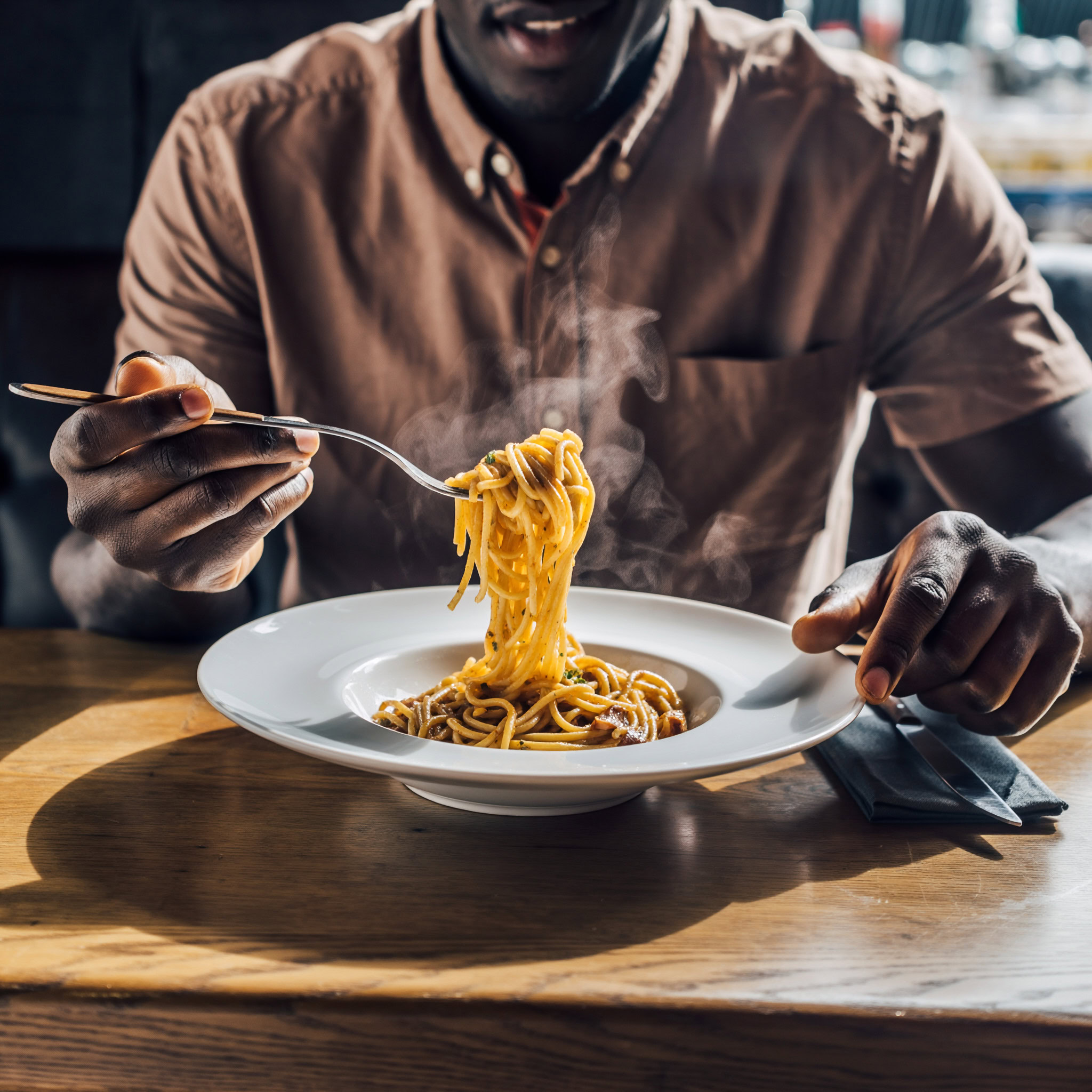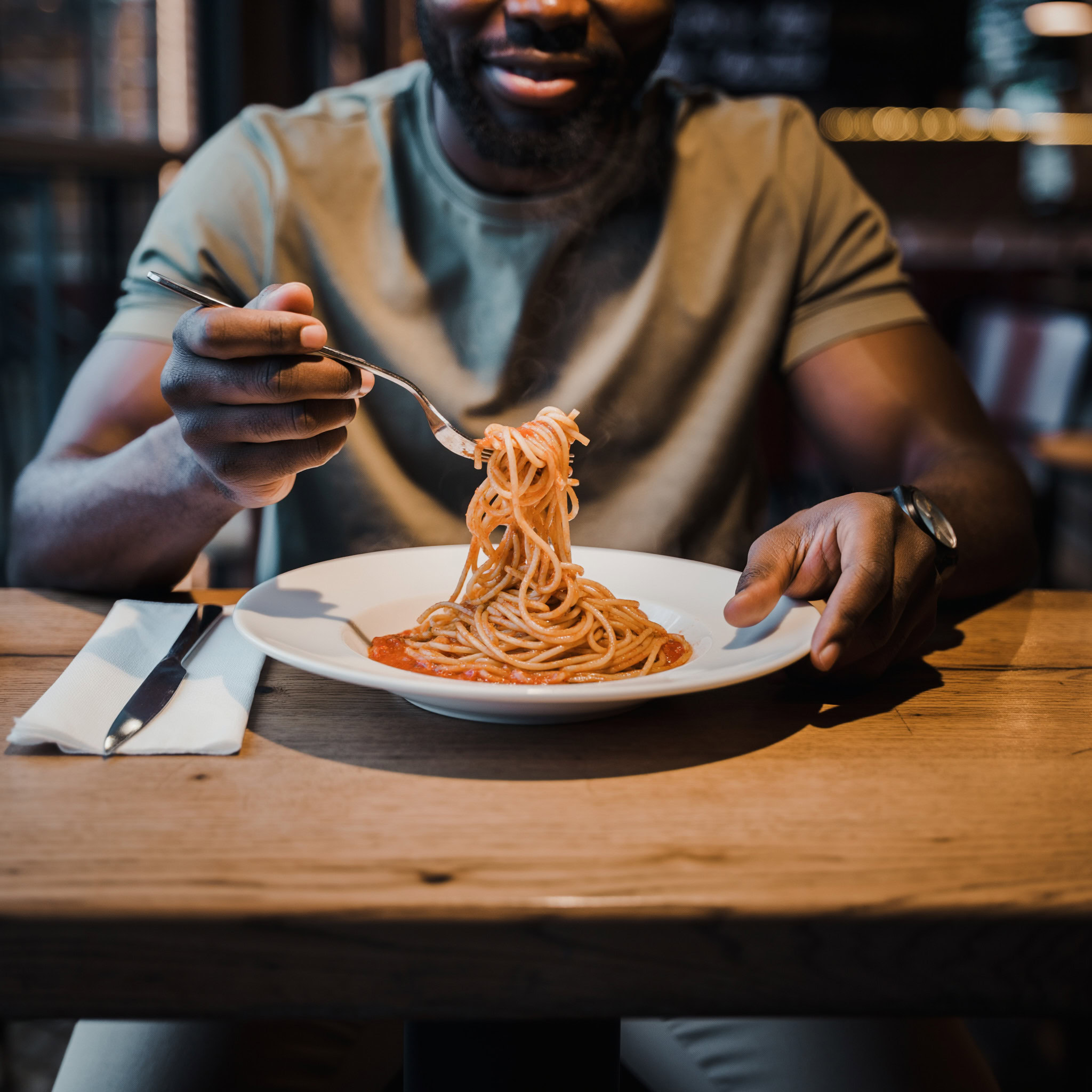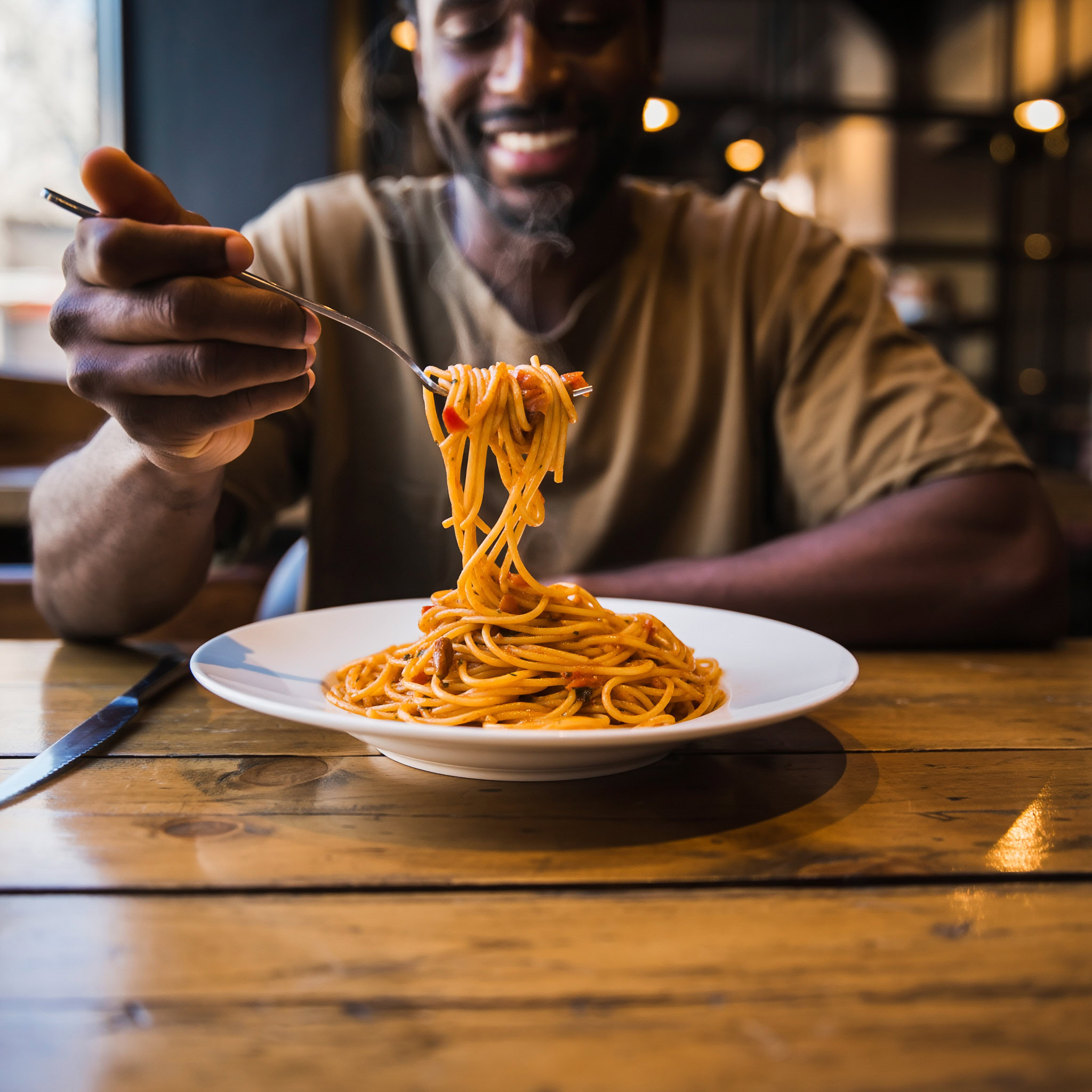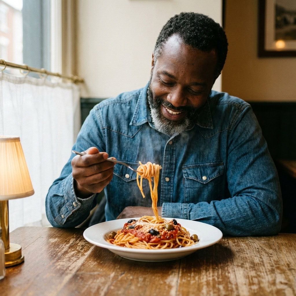 A photo of a Black man eating spaghetti with a fork in a small, cozy bistro. The man sits at a wooden table, twirling spaghetti around his fork with practiced ease, smiling slightly in a relaxed and natural manner. The plate of spaghetti is steaming, rich in texture and color, with subtle glistening from the sauce. Warm ambient lighting fills the scene, casting soft reflections on the table and emphasizing the texture of the noodles, skin, and fabric of his casual shirt. The mood is authentic and intimate, capturing a moment of quiet enjoyment. 50mm lens, shallow depth of field, cinematic tone, natural lighting, close-up shot, eye-level view.