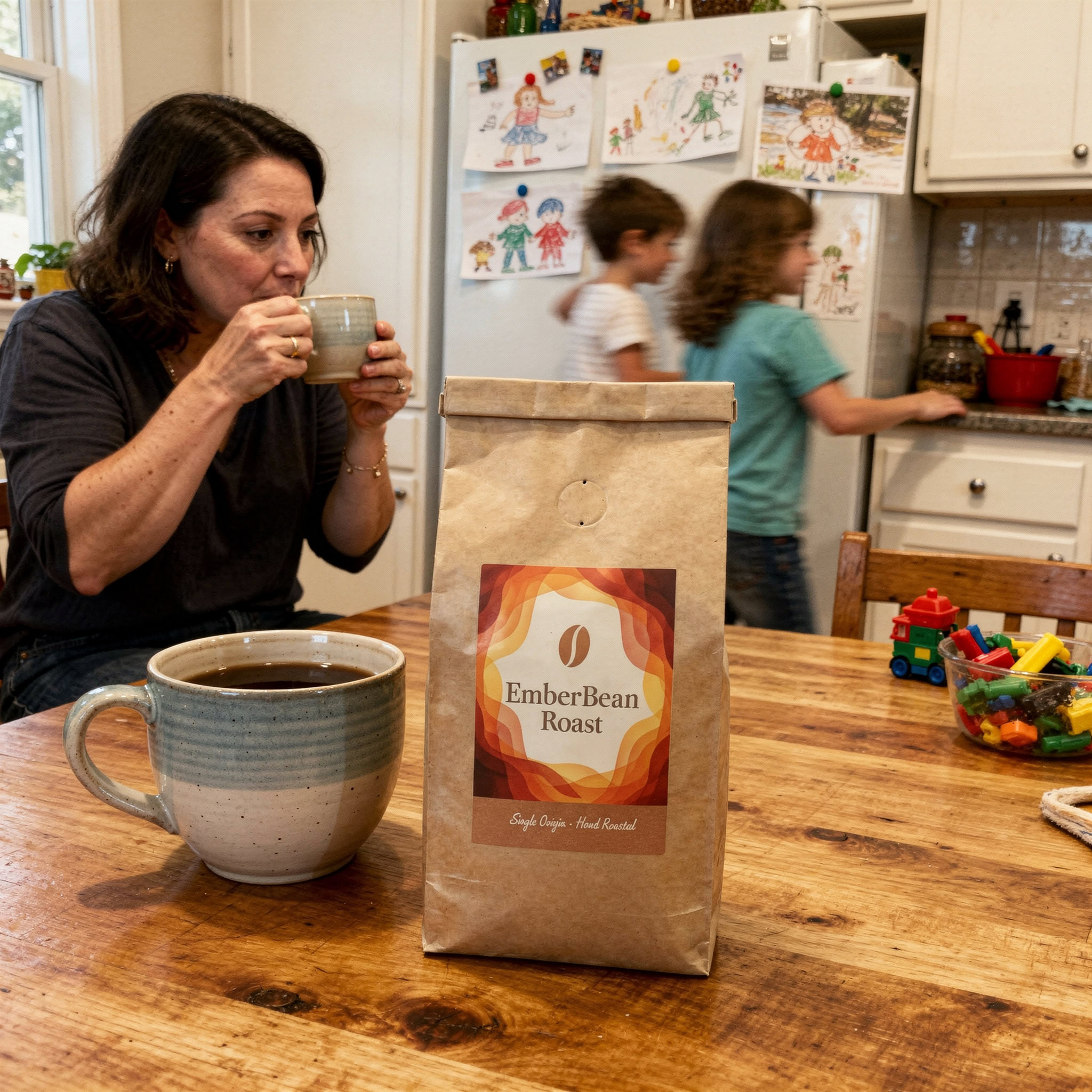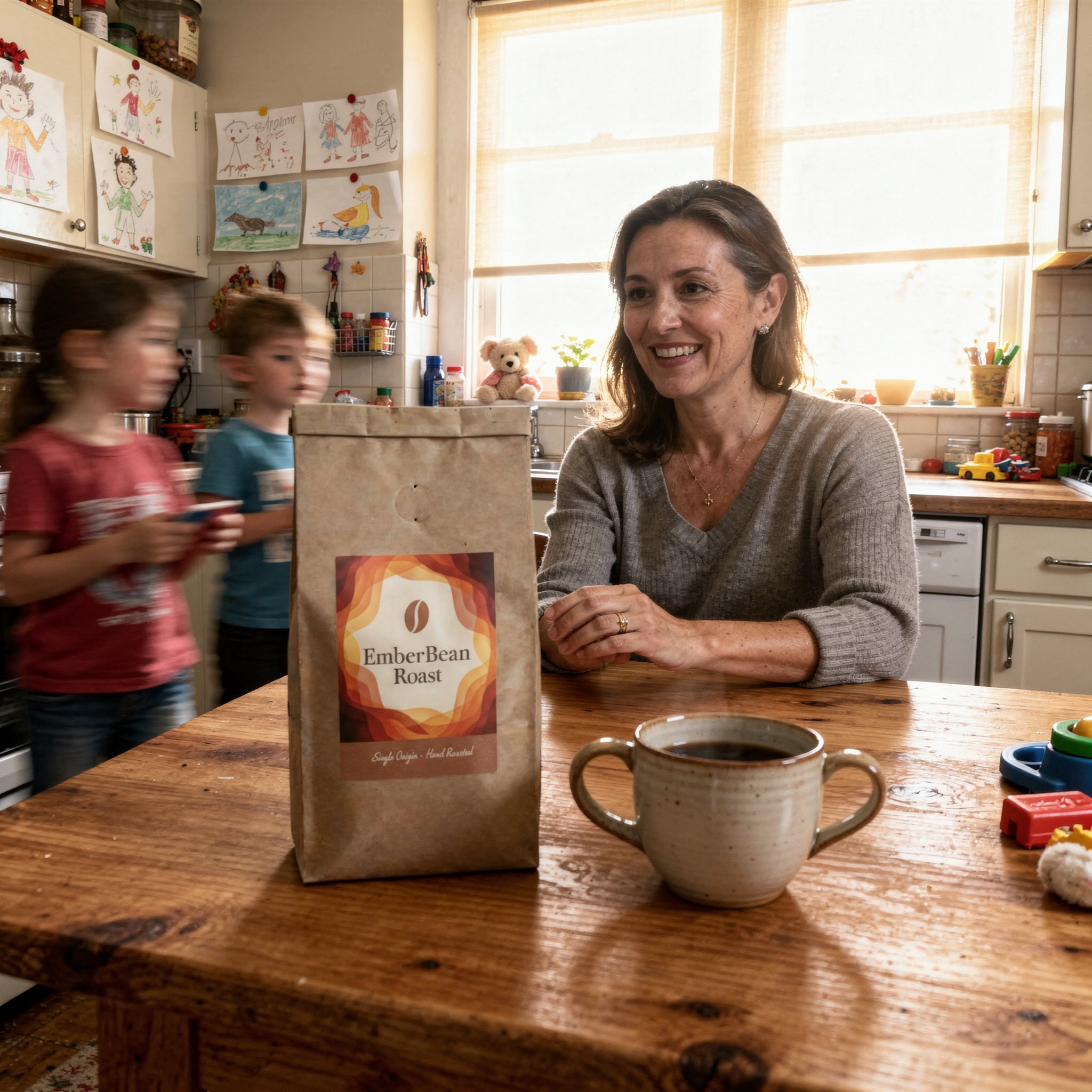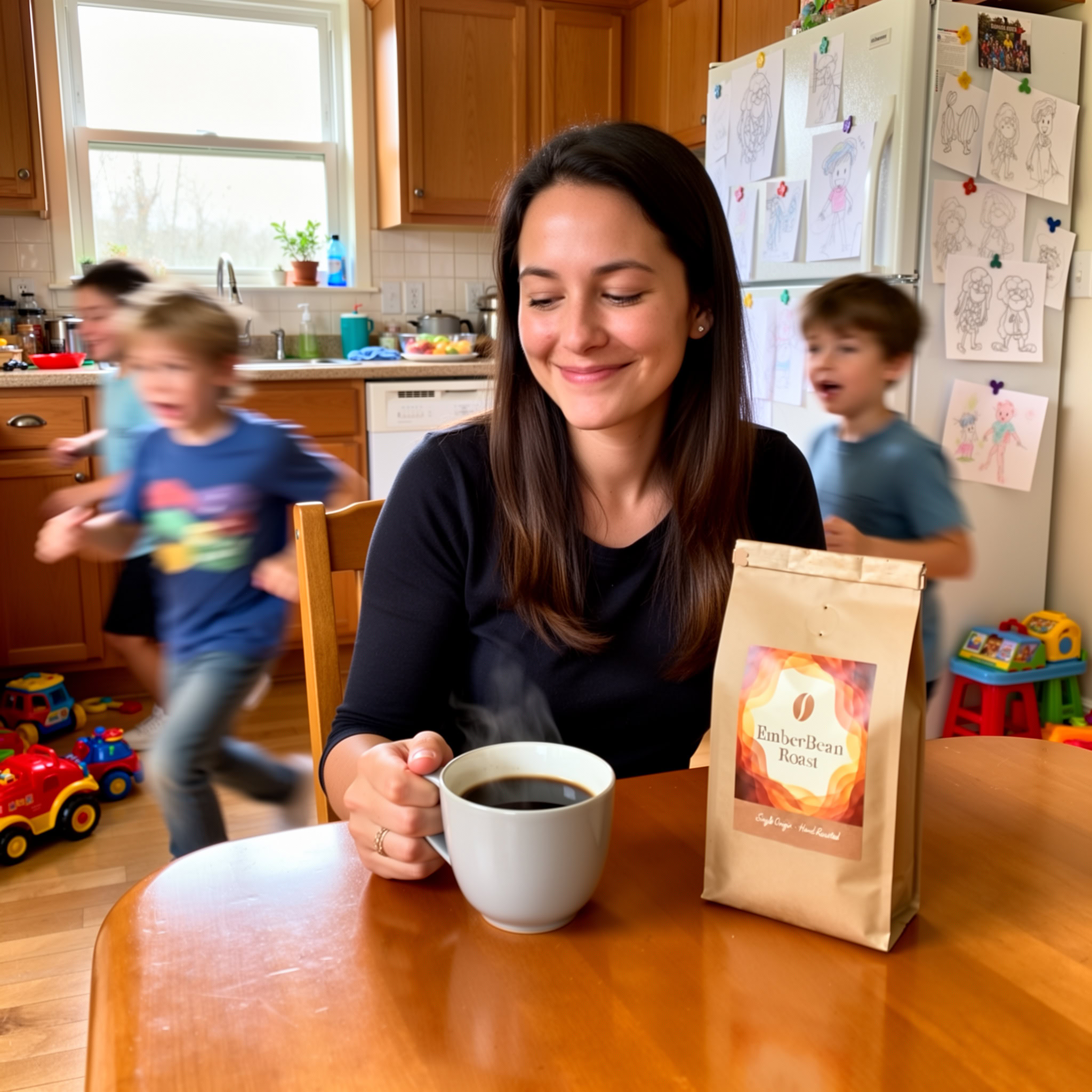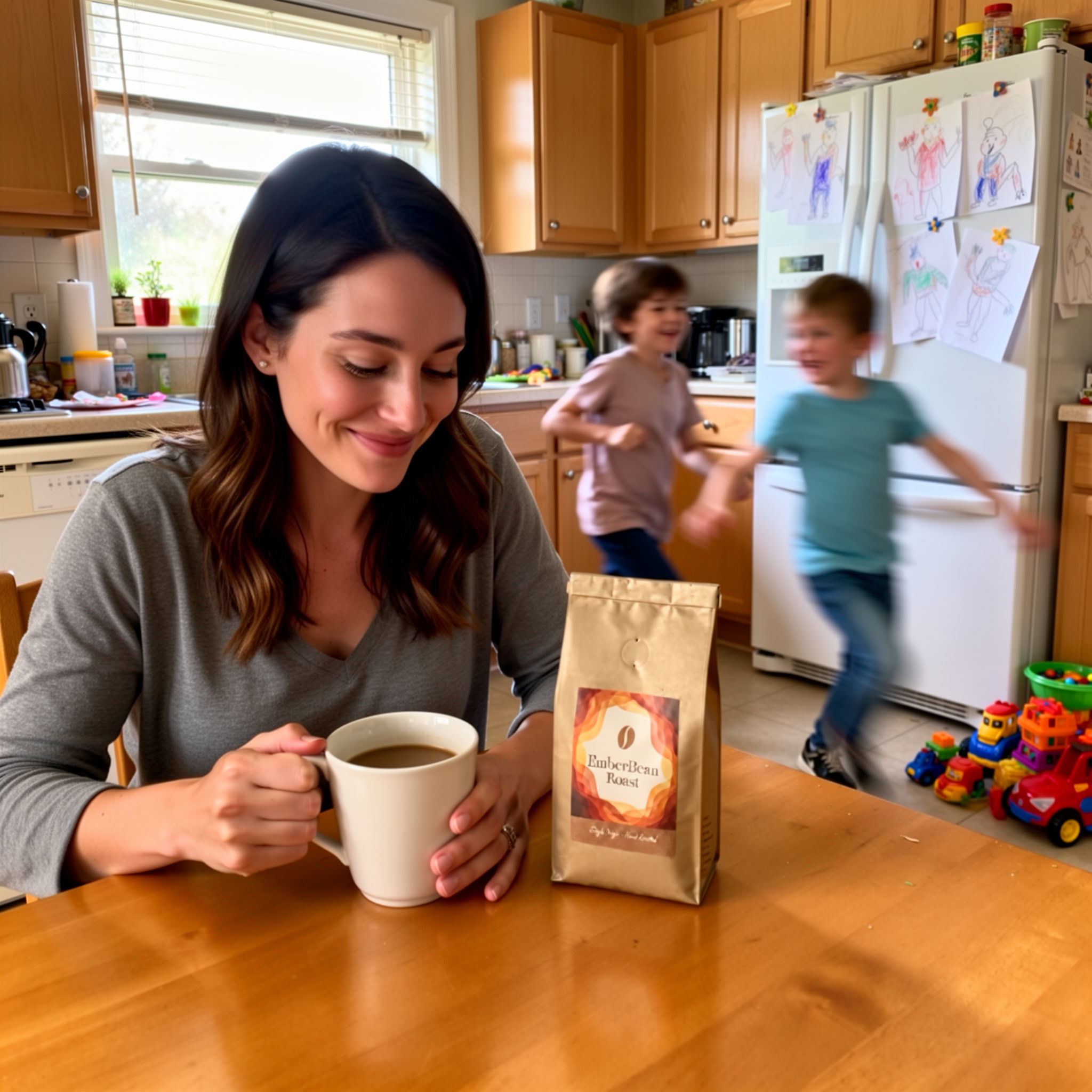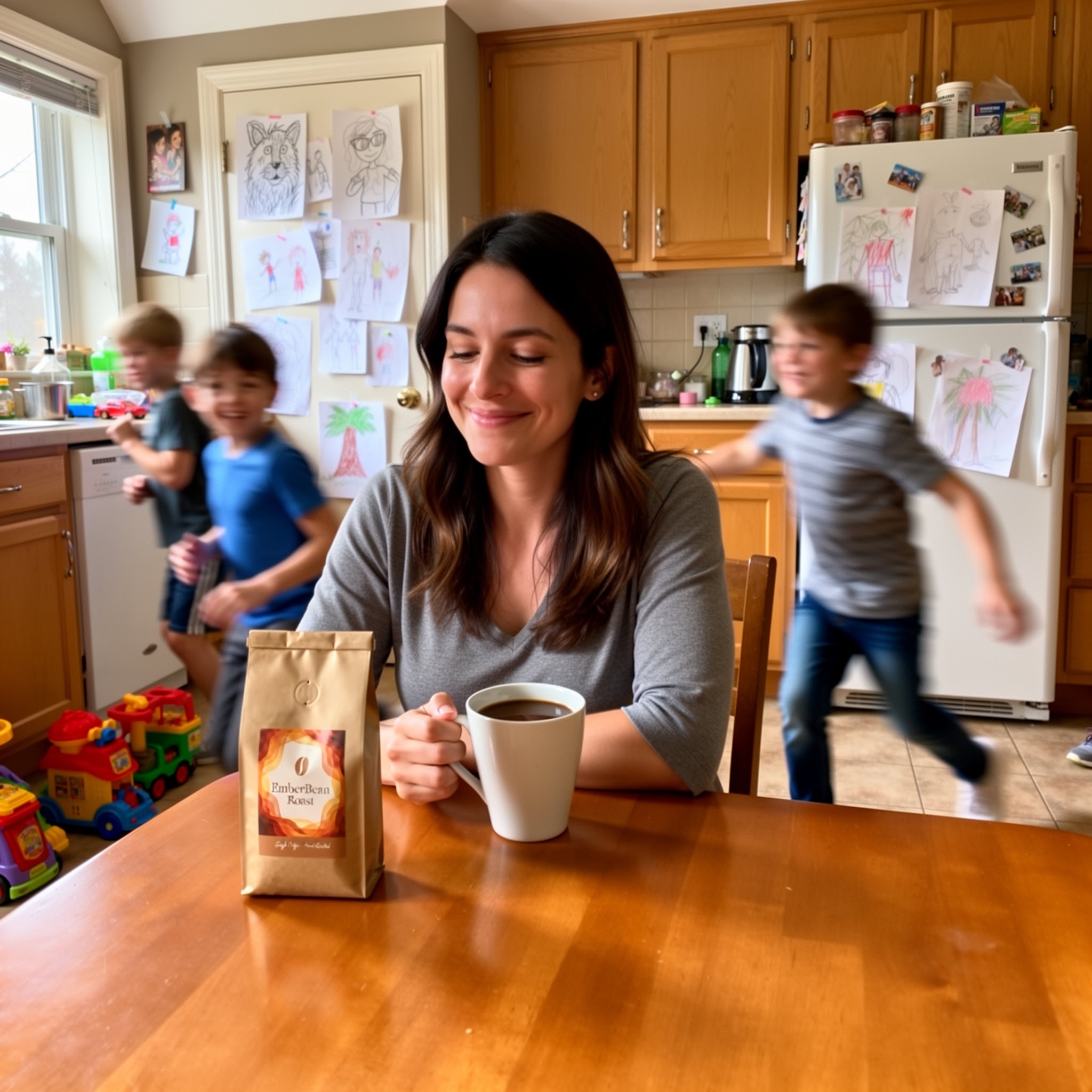Stärken: Die Balance aus familiärem Chaos, Bewegungsunschärfe der Kinder und ruhiger, fokussierter Mutter gelingt sehr überzeugend; das Produkt bleibt klar erkennbar.