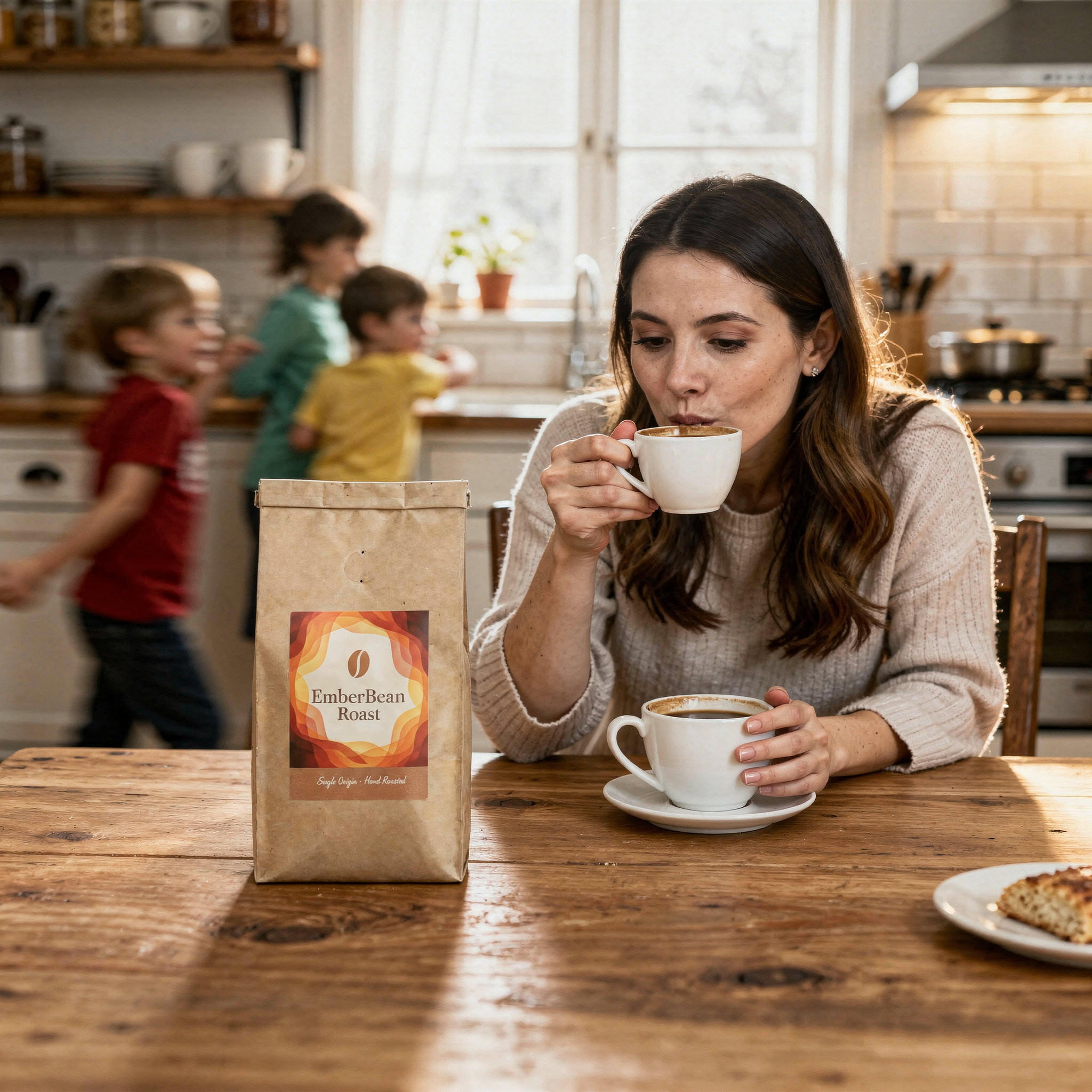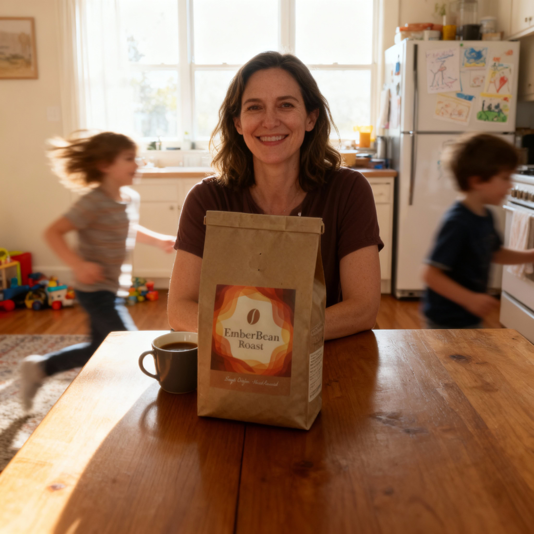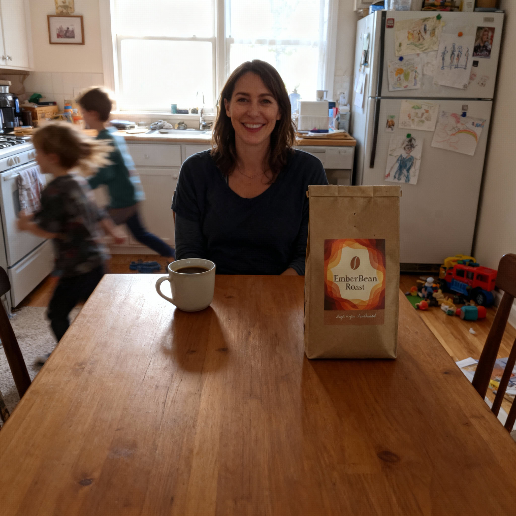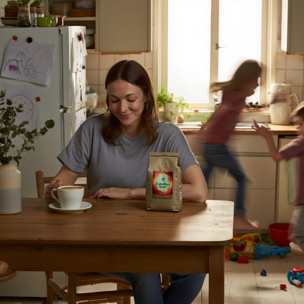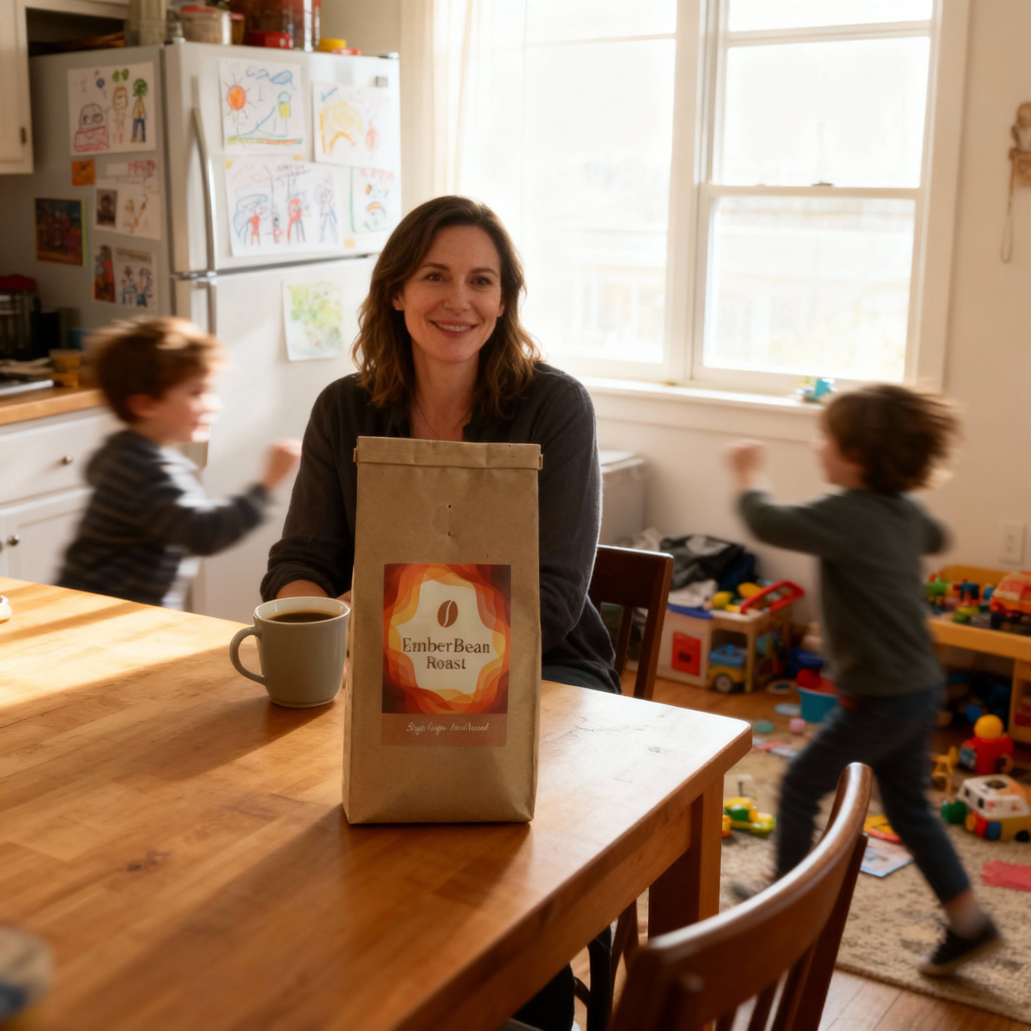Stärken: Die Balance aus familiärem Chaos, Bewegungsunschärfe der Kinder und ruhiger, fokussierter Mutter gelingt sehr überzeugend; das Produkt bleibt klar erkennbar.
