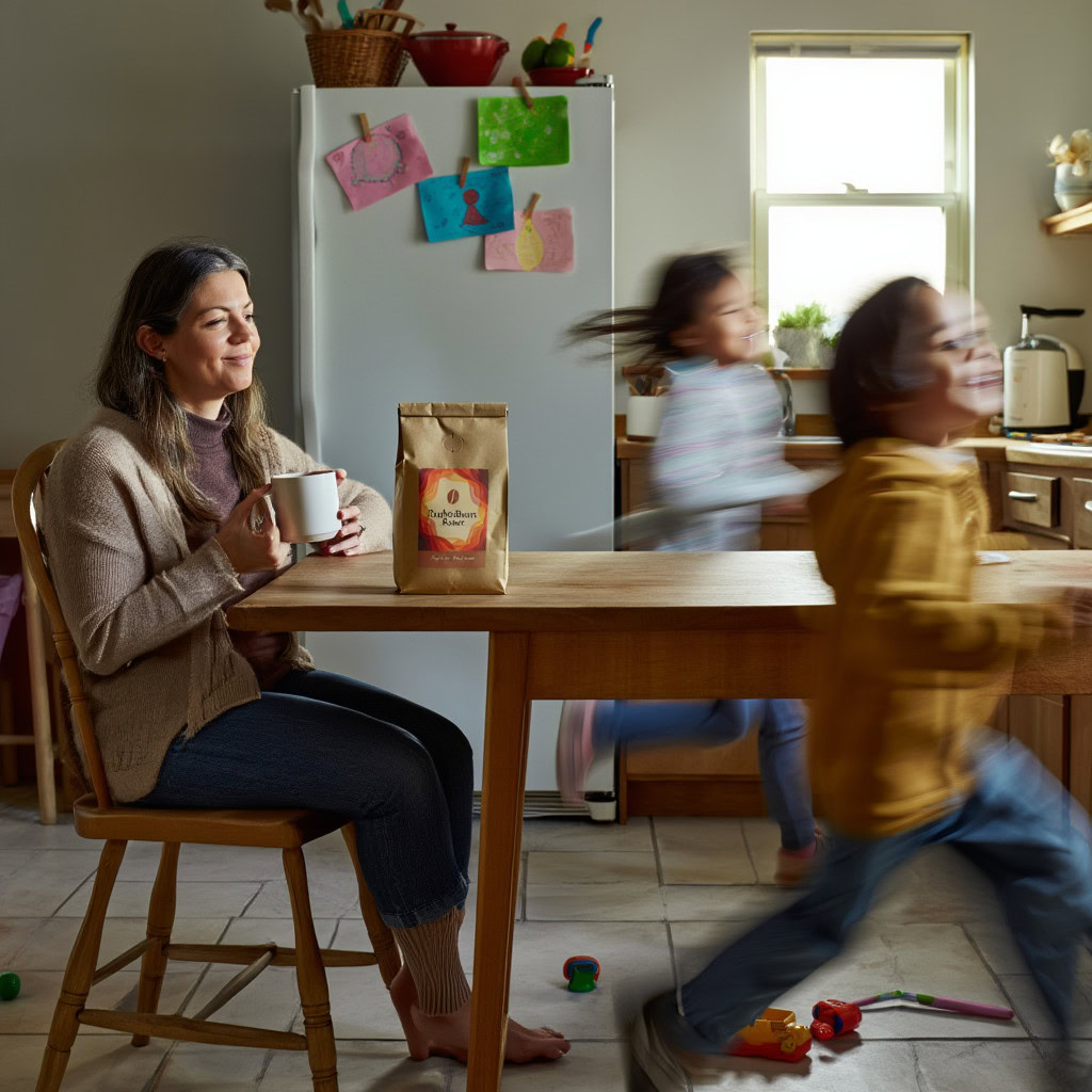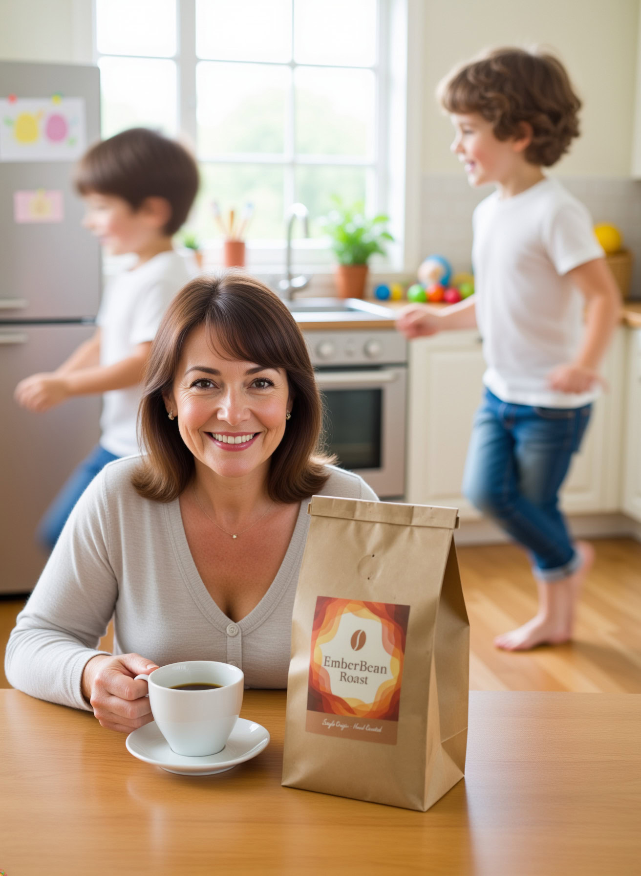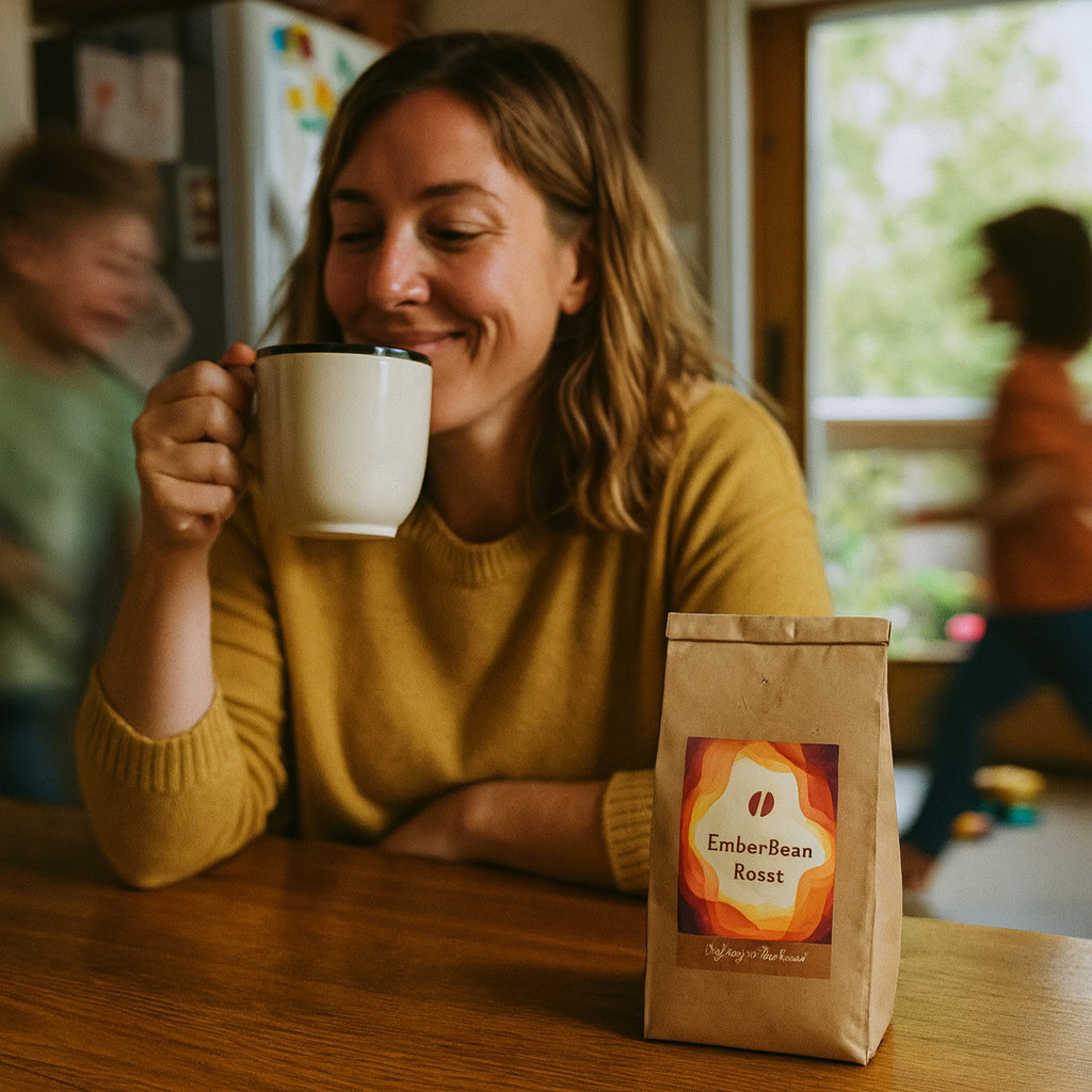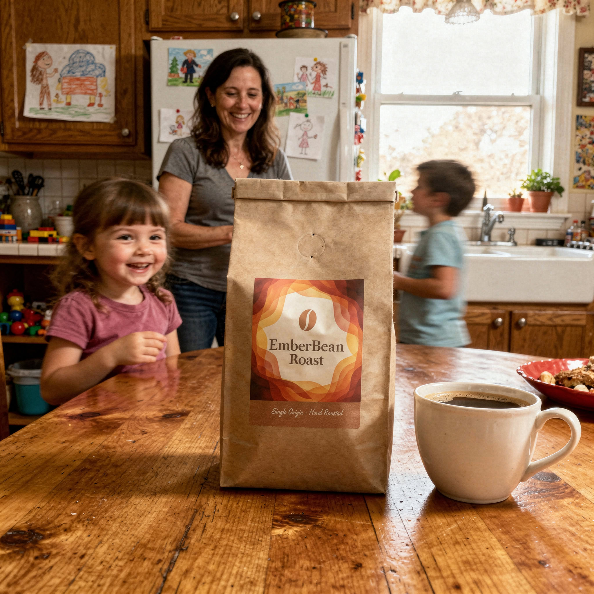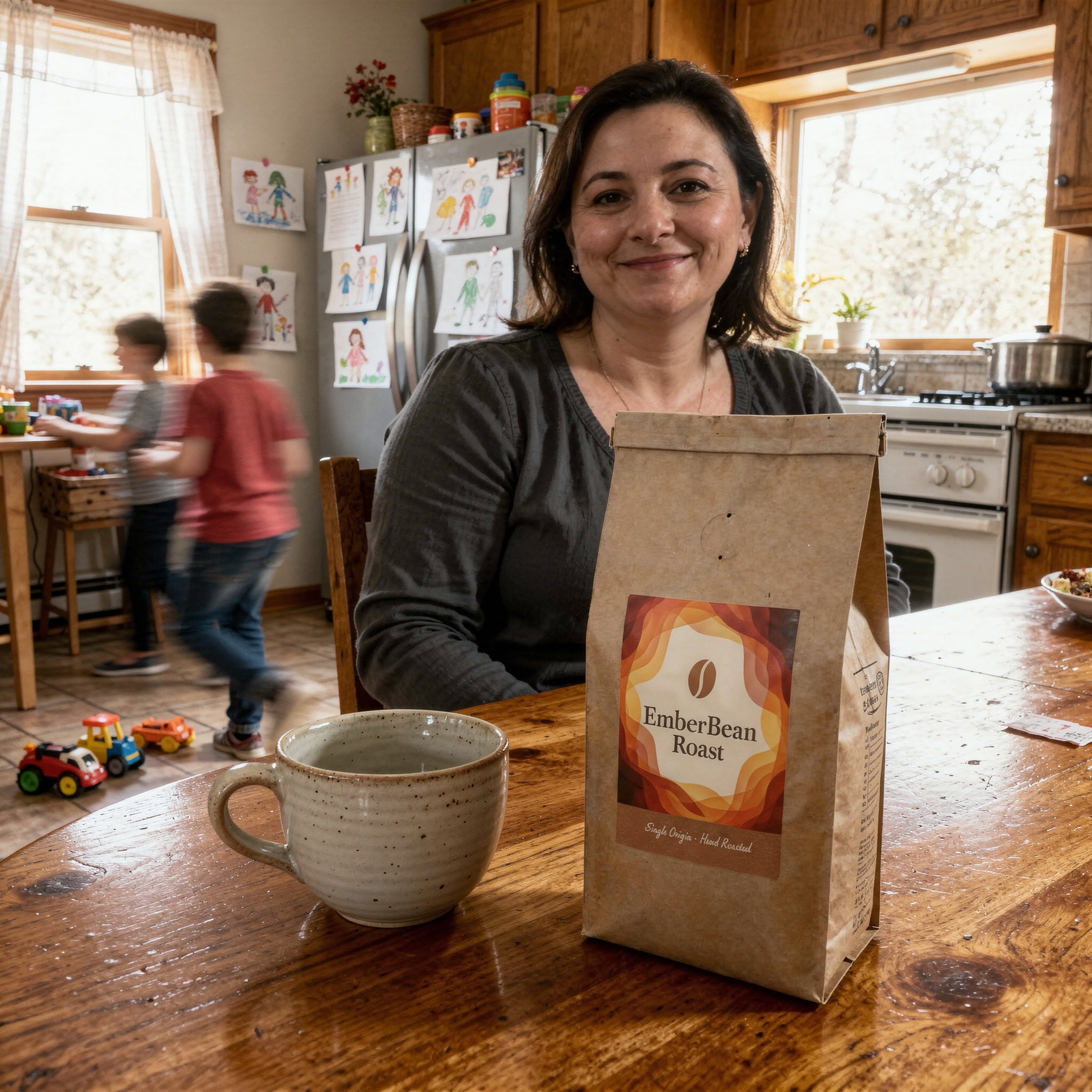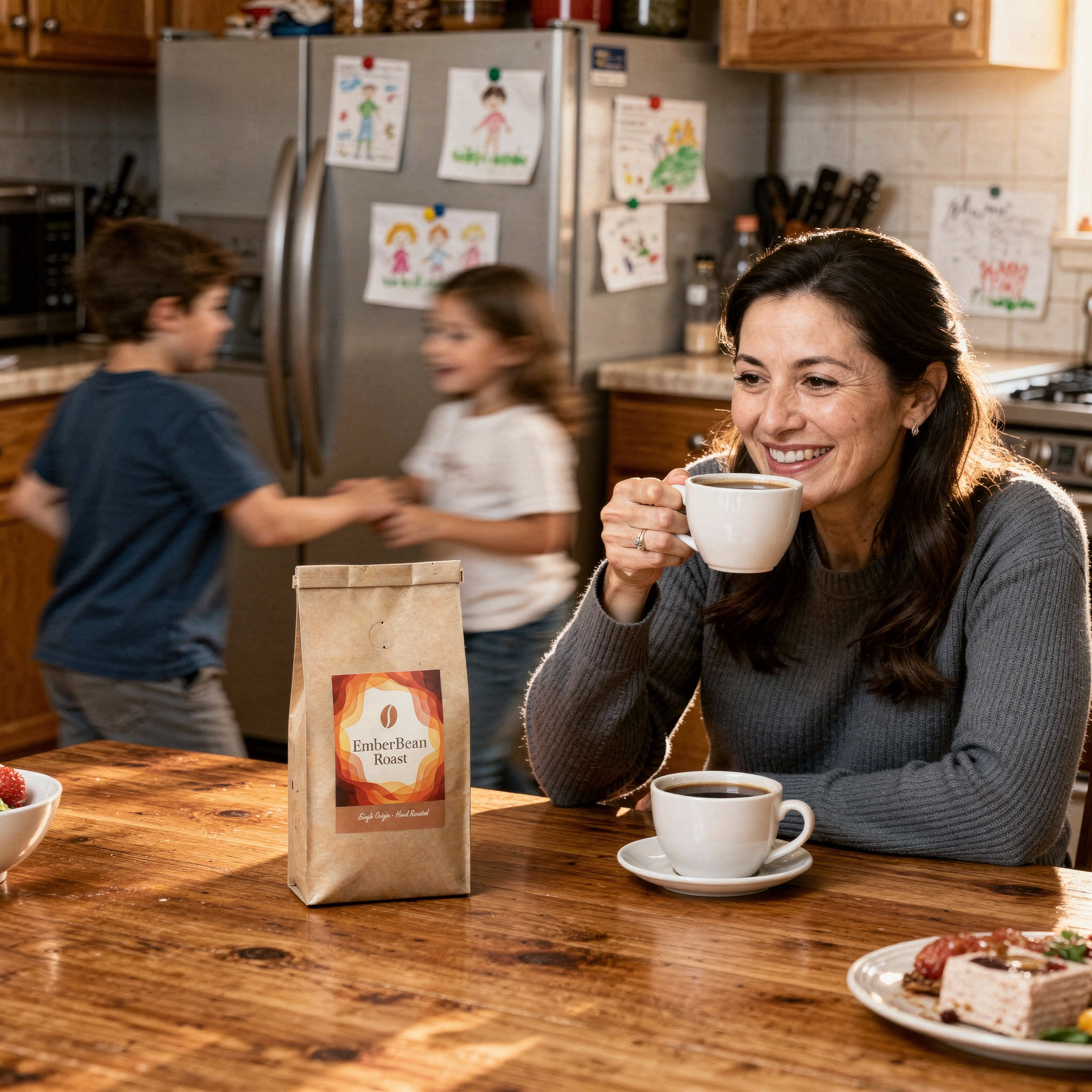 Stärken: Die Balance aus familiärem Chaos, Bewegungsunschärfe der Kinder und ruhiger, fokussierter Mutter gelingt sehr überzeugend; das Produkt bleibt klar erkennbar.