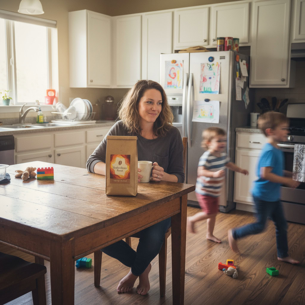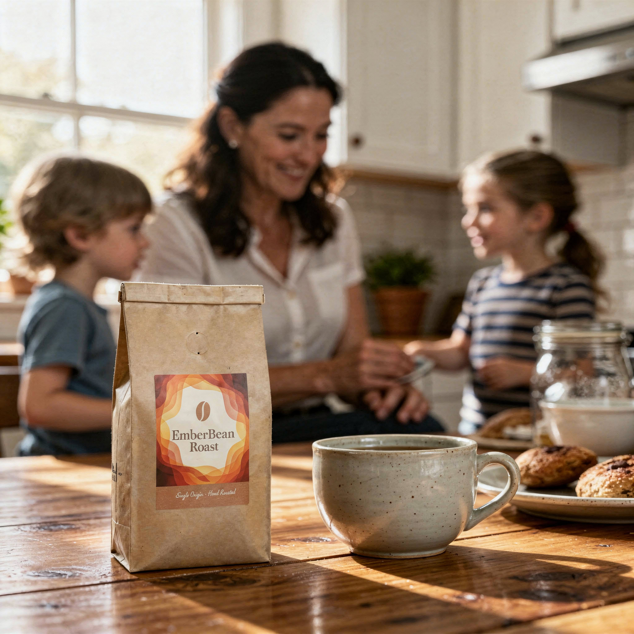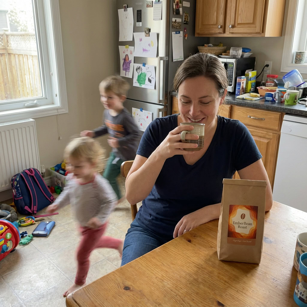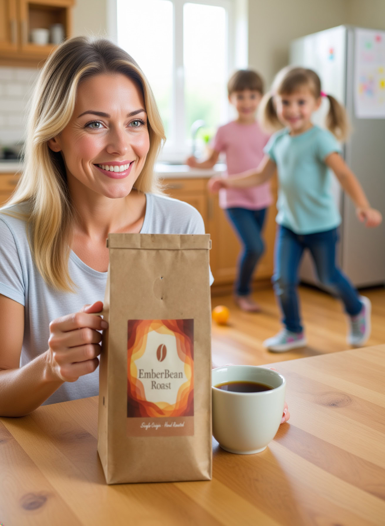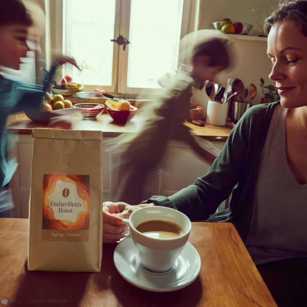 Stärken: Die Balance aus familiärem Chaos, Bewegungsunschärfe der Kinder und ruhiger, fokussierter Mutter gelingt sehr überzeugend; das Produkt bleibt klar erkennbar.