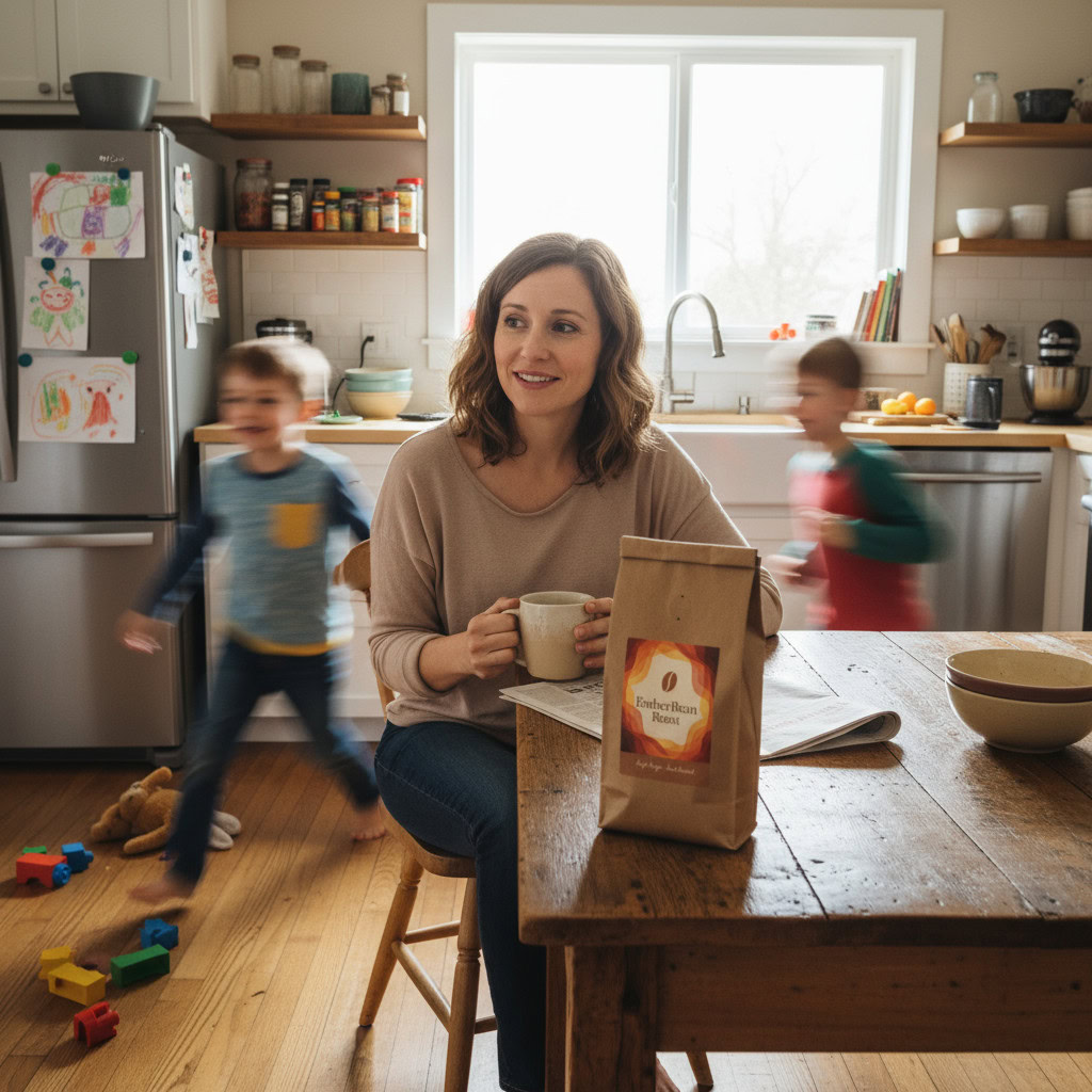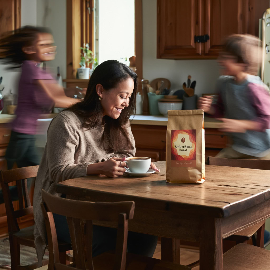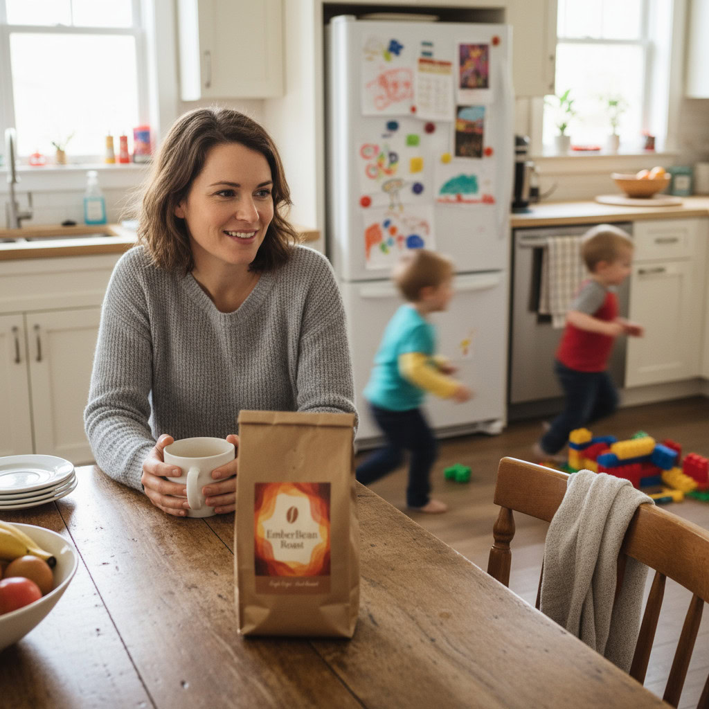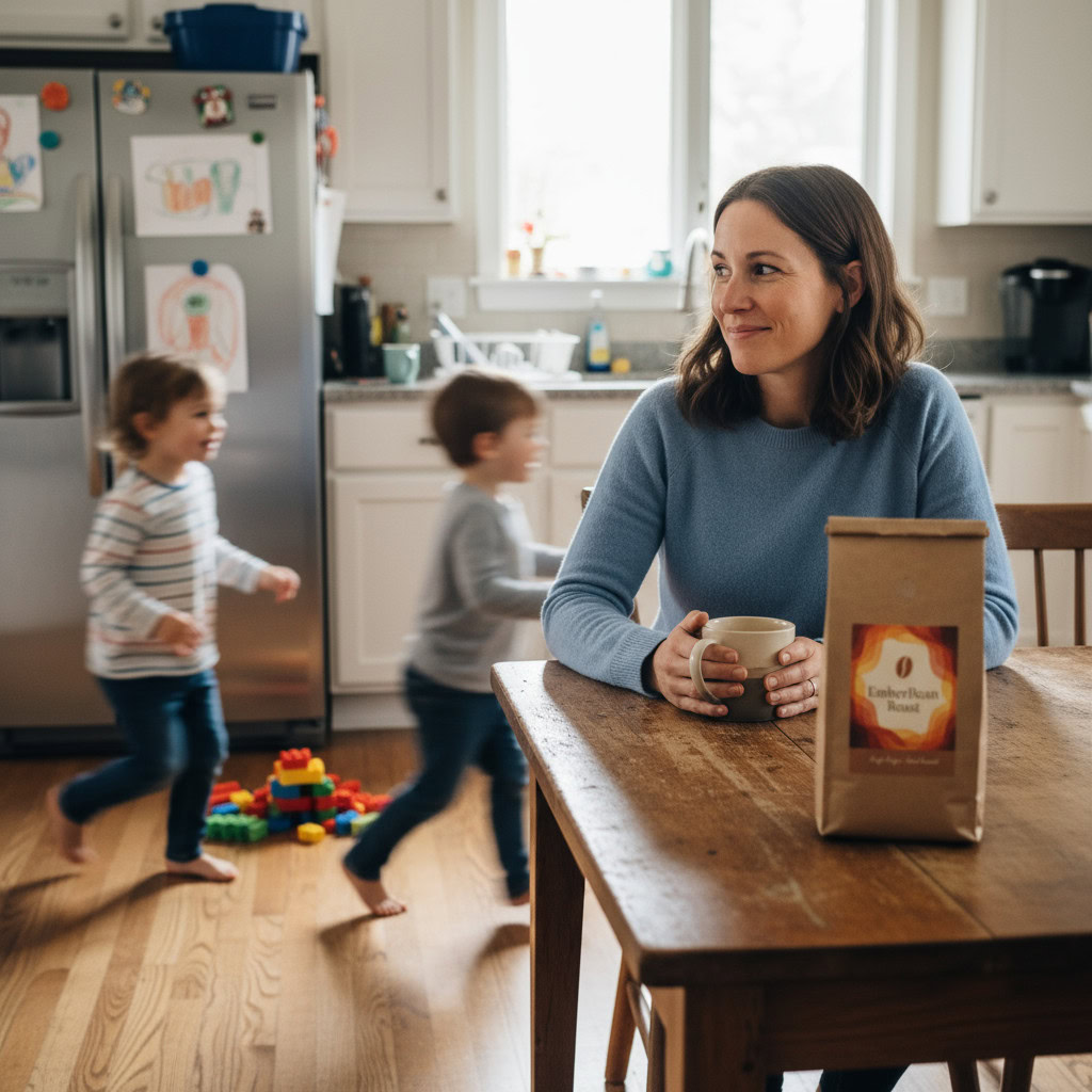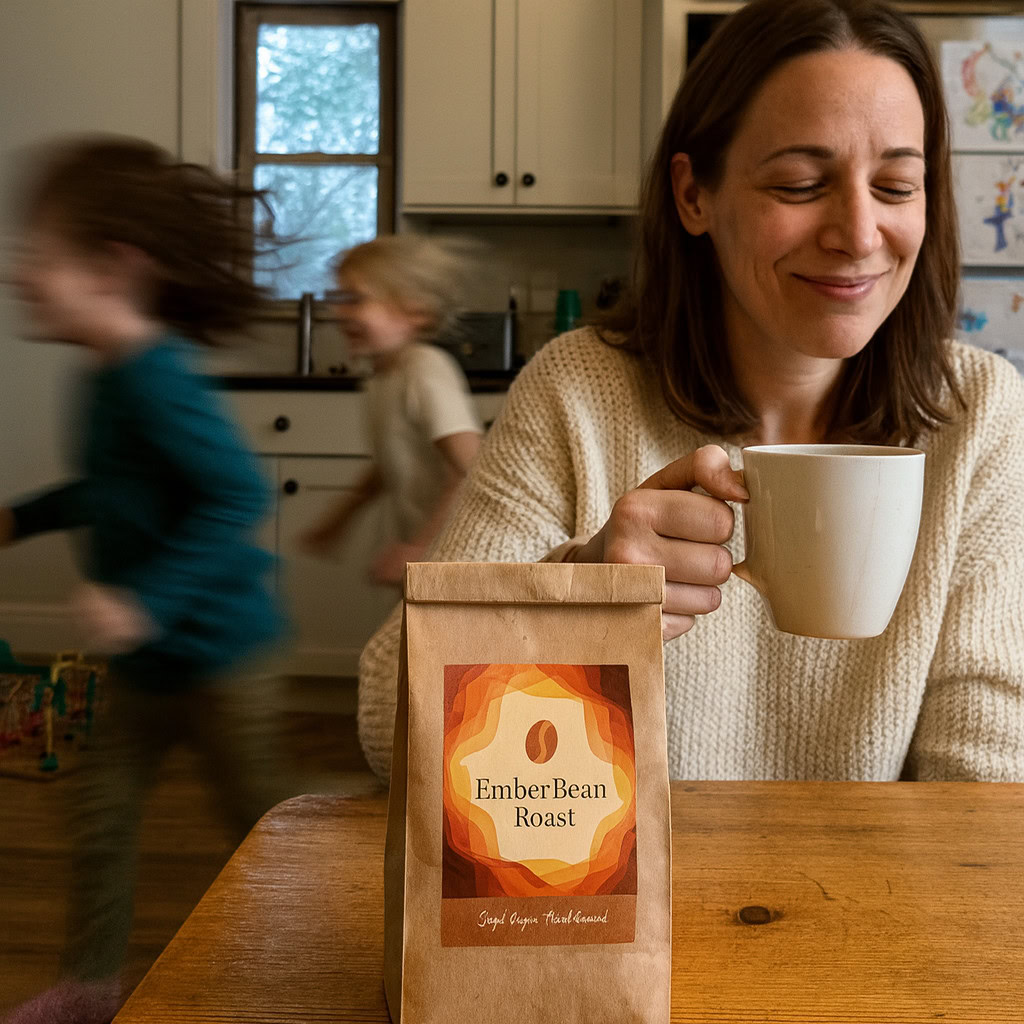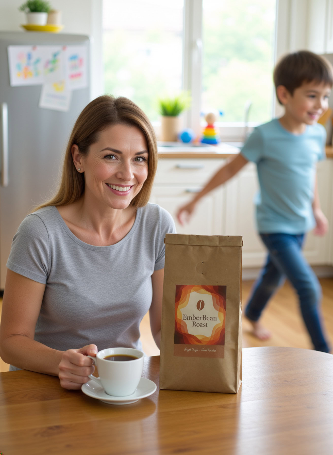 Stärken: Die Balance aus familiärem Chaos, Bewegungsunschärfe der Kinder und ruhiger, fokussierter Mutter gelingt sehr überzeugend; das Produkt bleibt klar erkennbar.