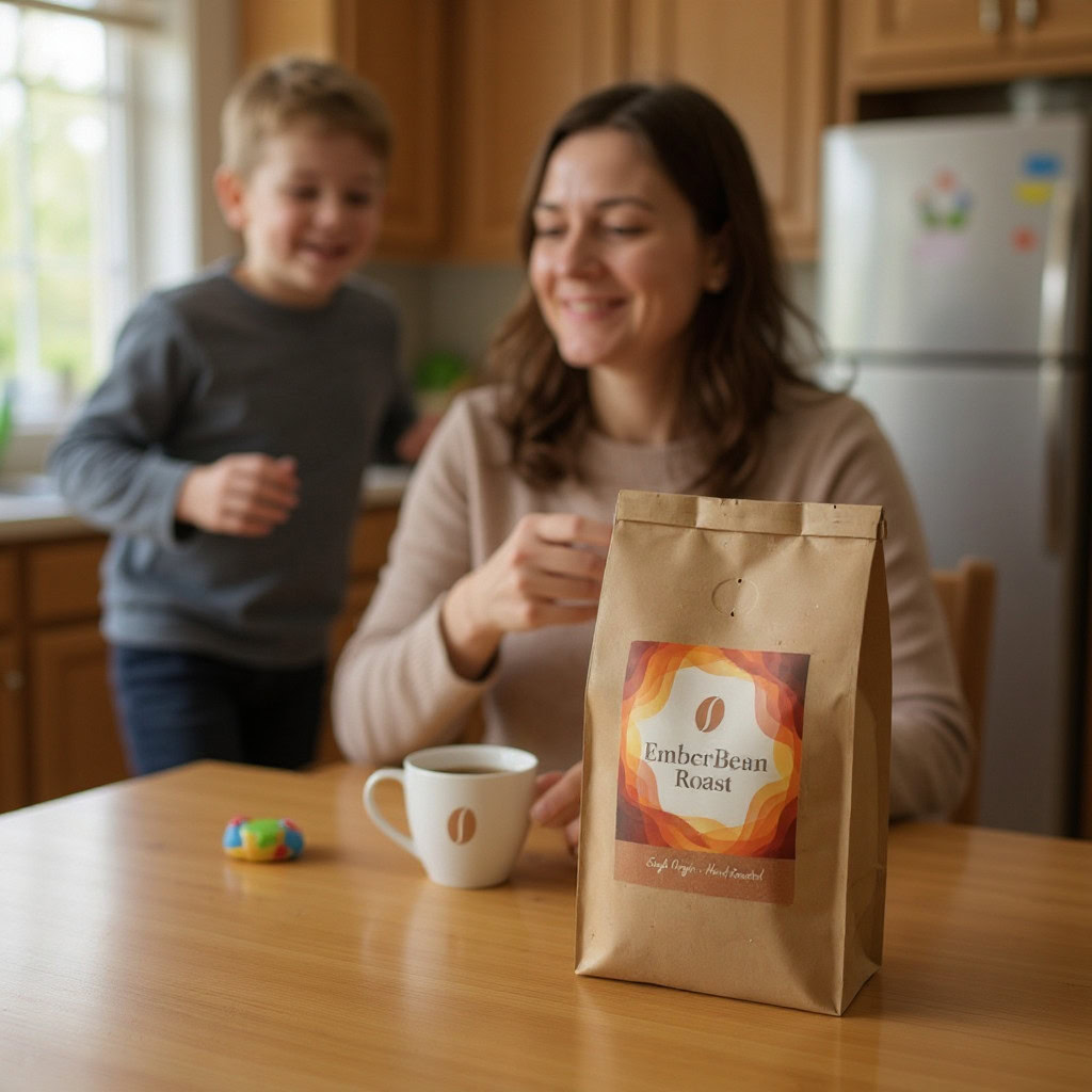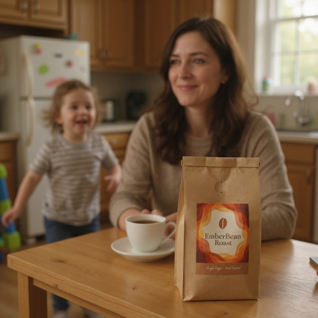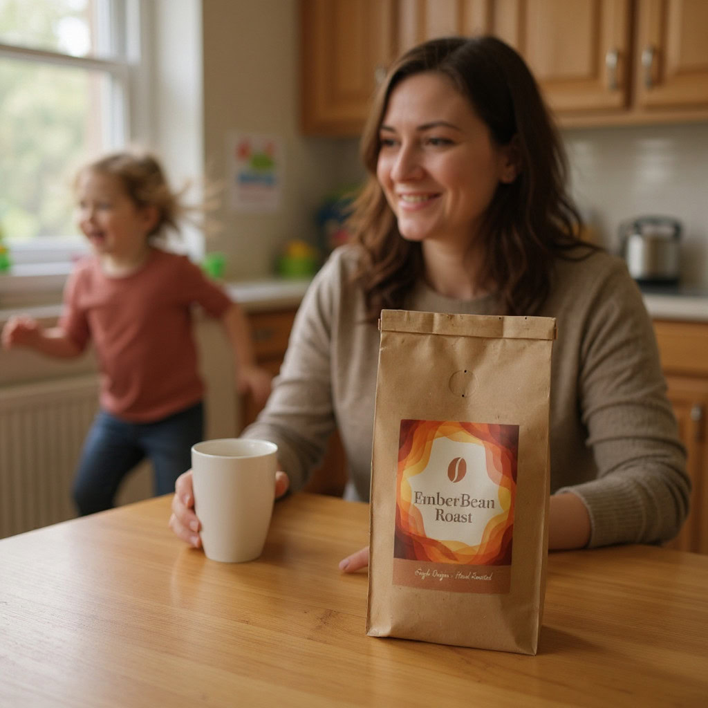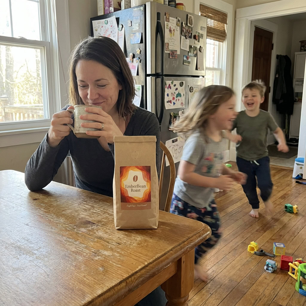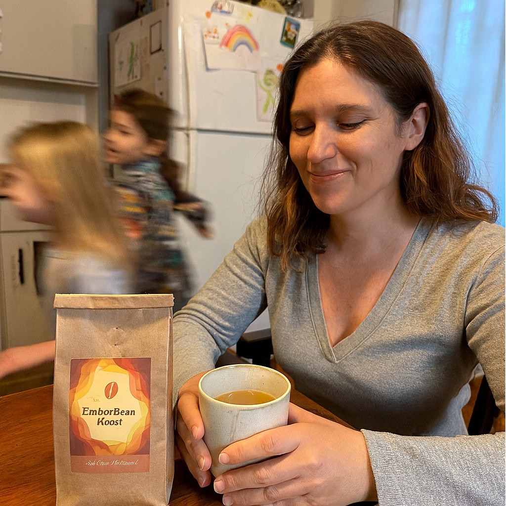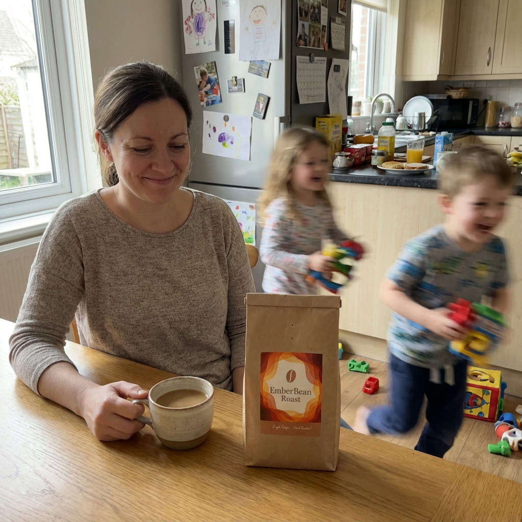 Stärken: Die Balance aus familiärem Chaos, Bewegungsunschärfe der Kinder und ruhiger, fokussierter Mutter gelingt sehr überzeugend; das Produkt bleibt klar erkennbar.