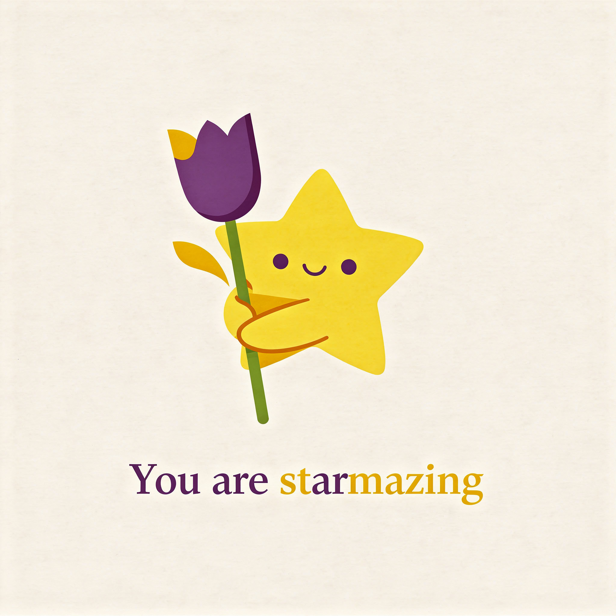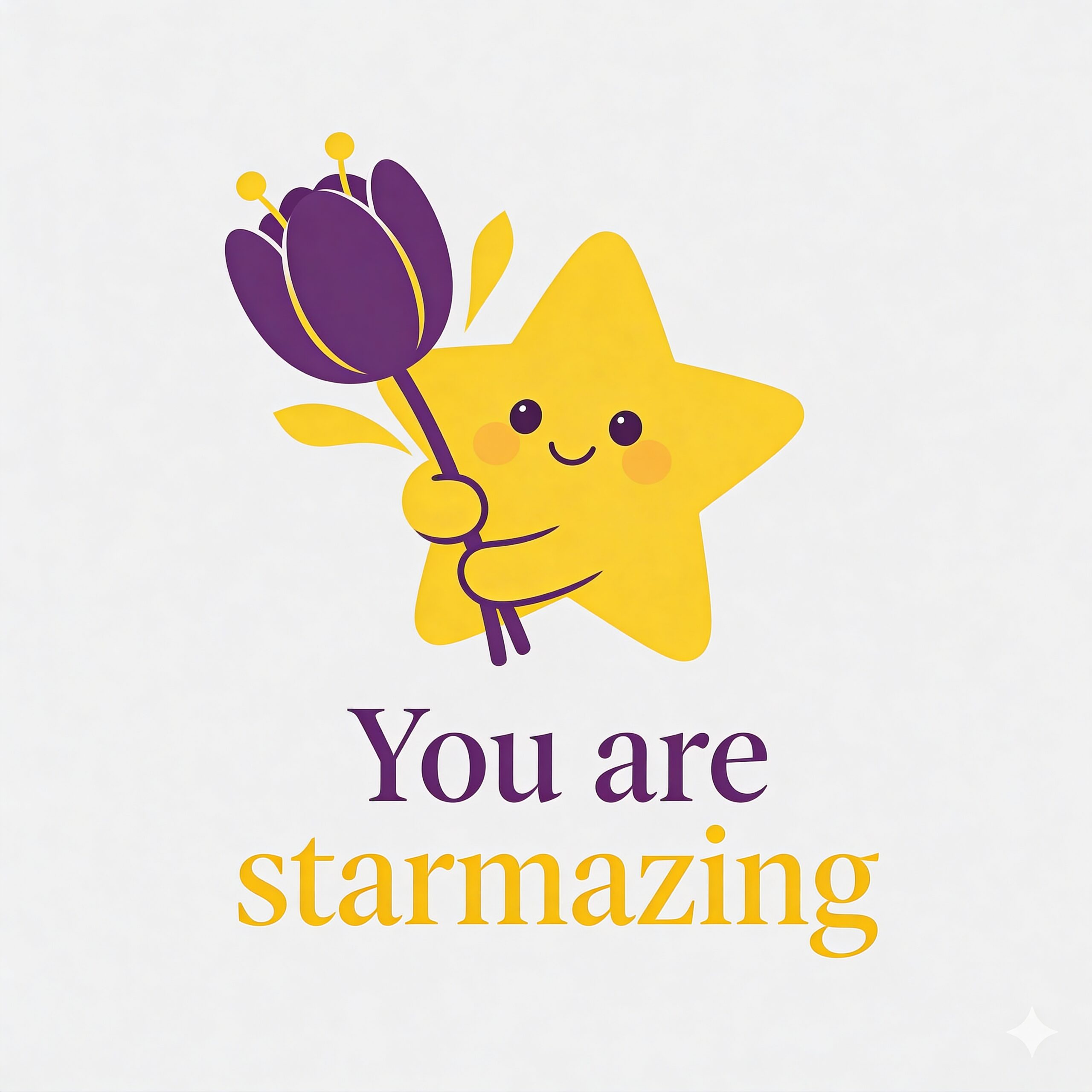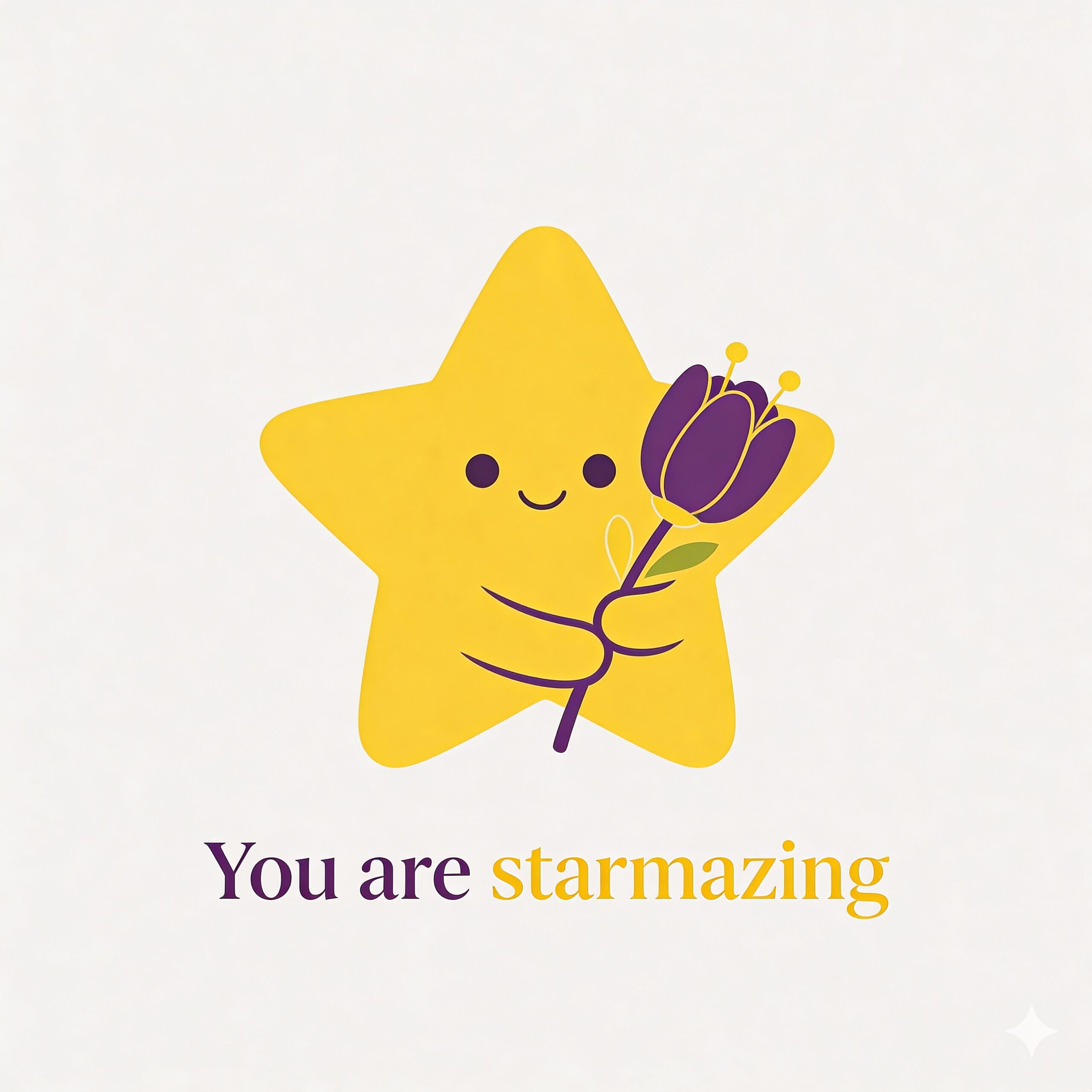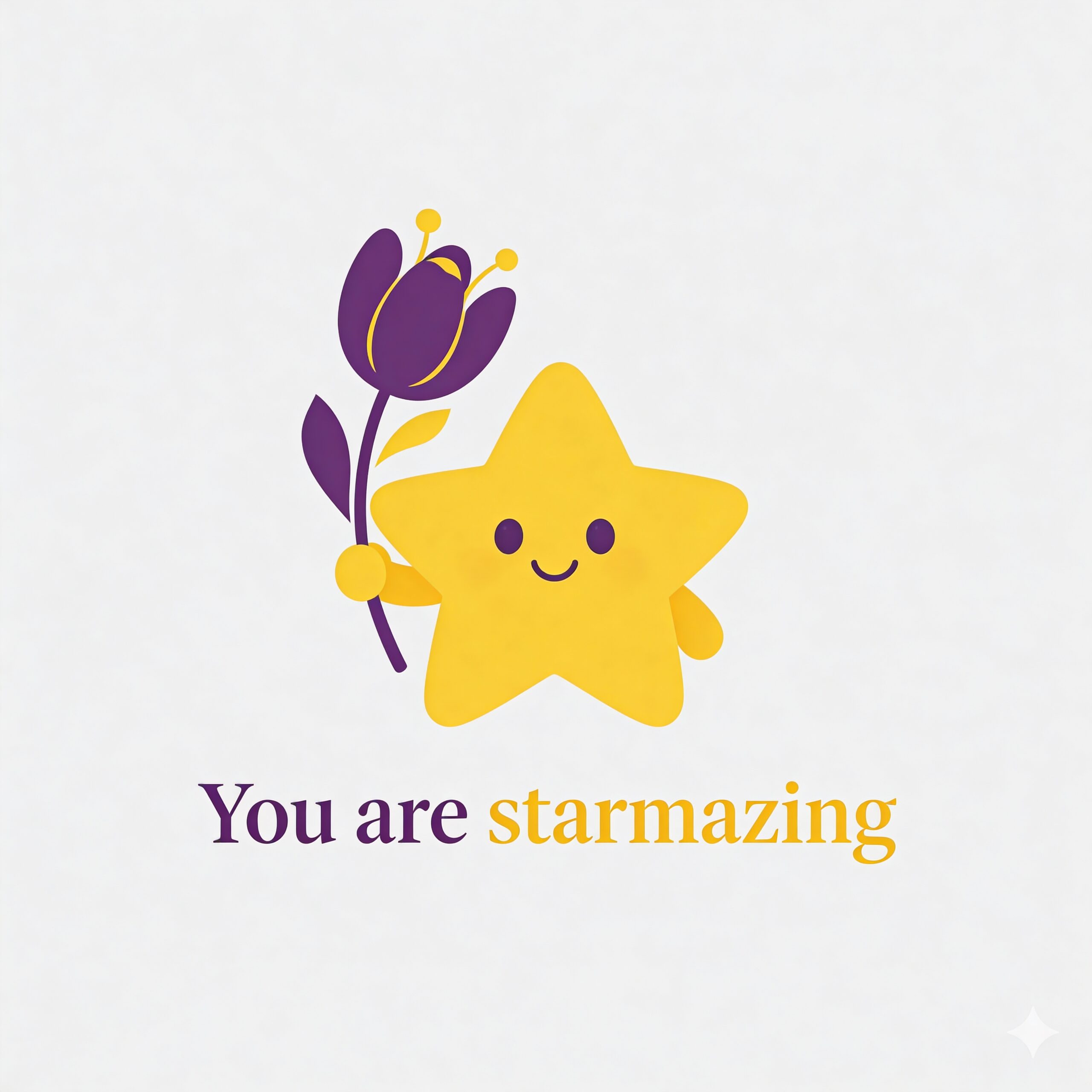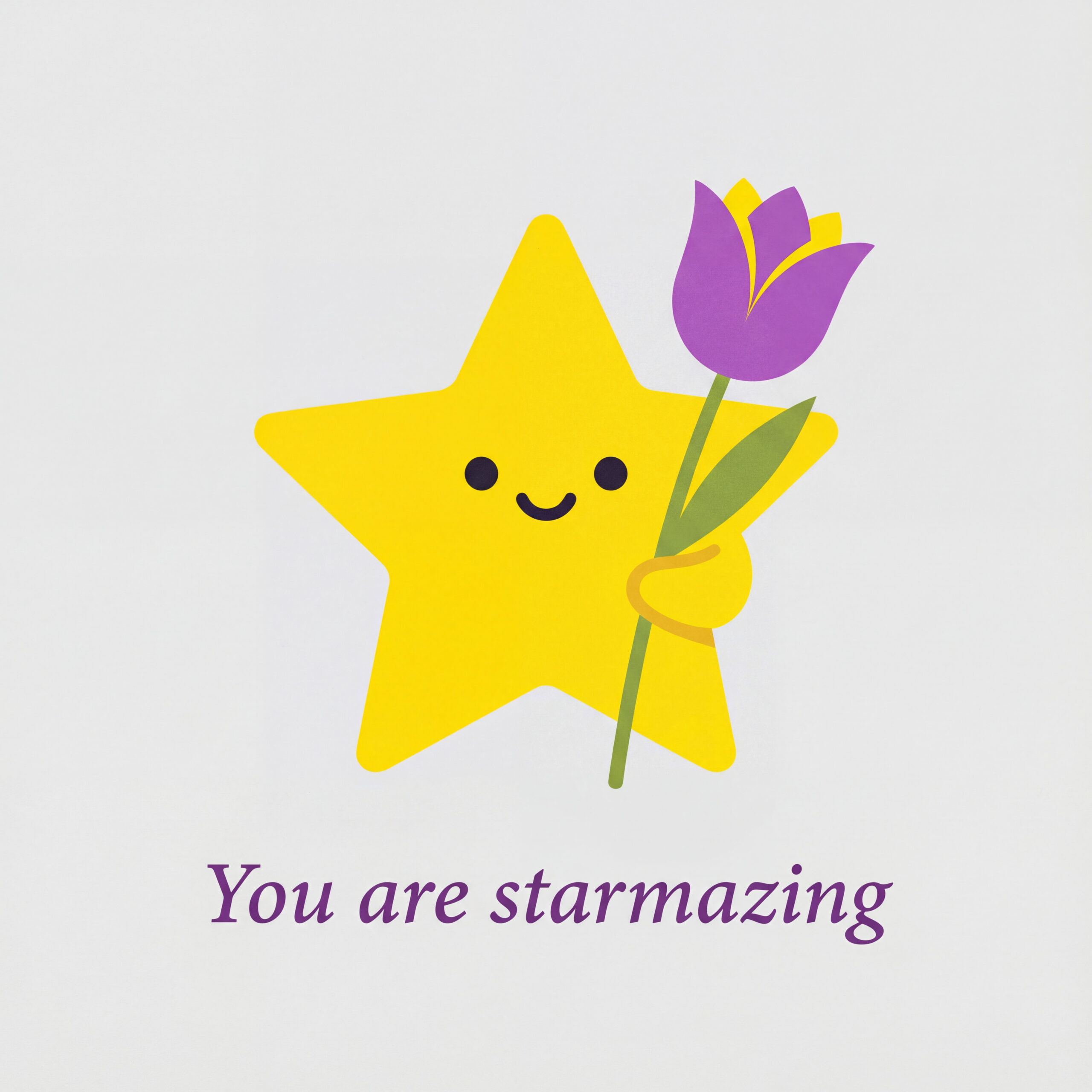Design a flat vector illustration in the same minimalist, vibrant style as the reference image. Create a charming and uplifting scene where a **cute, smiling star character** gently holds a tulip in its hand. The star should have a friendly, expressive face with simple dot eyes and a small, joyful smile, radiating warmth and positivity. Use **Canary (#FEE602)** for the star’s body, adding soft gradients and highlights to create a glowing effect. The tulip’s petals should be in **Amethyst (#A65DC9)** with subtle Canary accents for harmony. Keep the shapes bold and clean, with smooth edges and a light, neutral background to make the colors stand out. Below the illustration, include the text **“You are starmazing”** in a modern, elegant font using either Amethyst (#A65DC9) or Canary (#FEE602). Maintain the minimalist, balanced composition and a cheerful, heartwarming vibe consistent with the reference style.