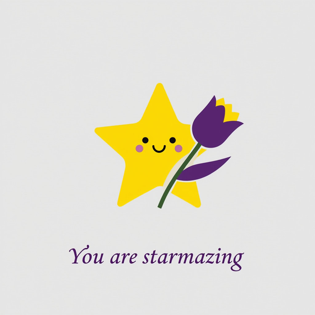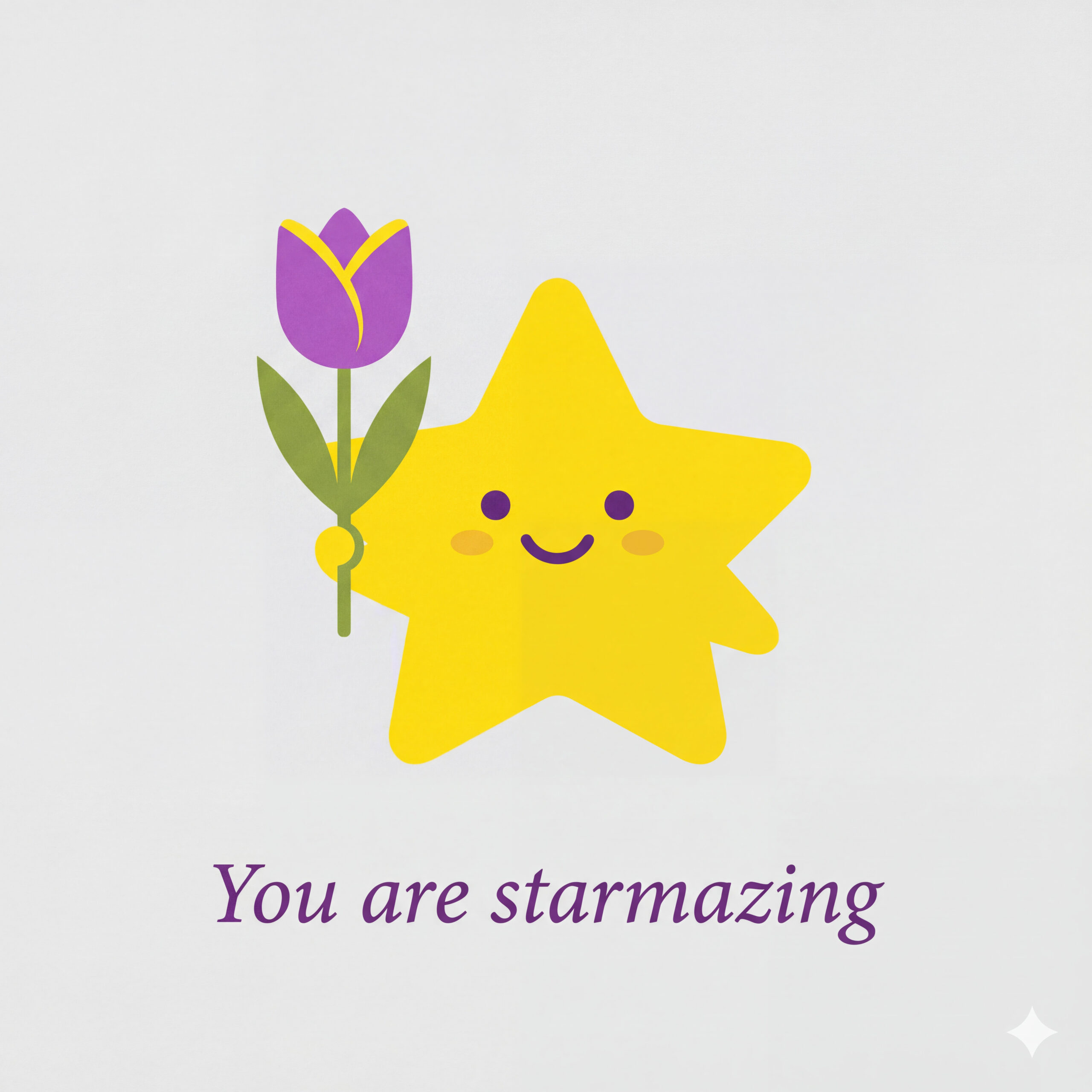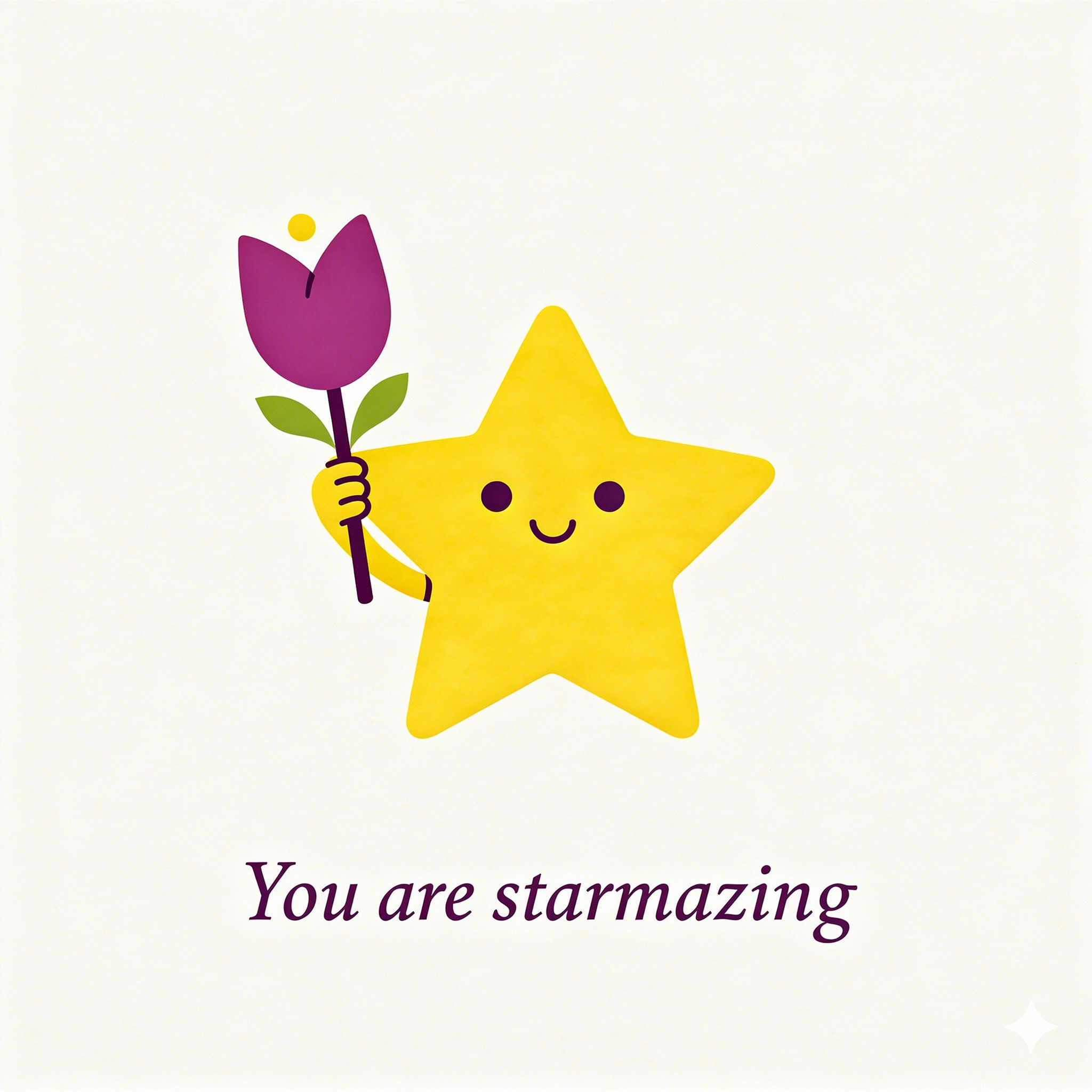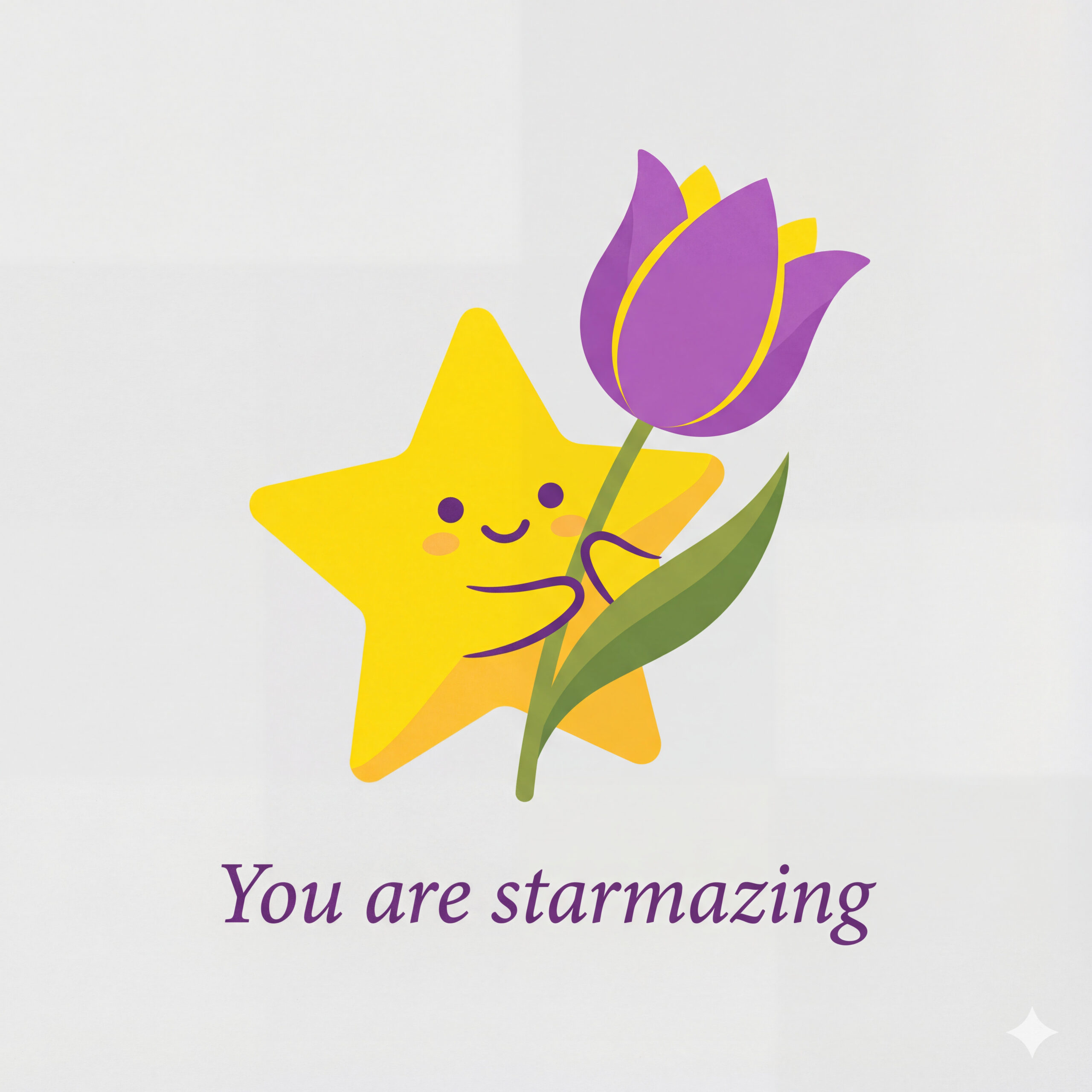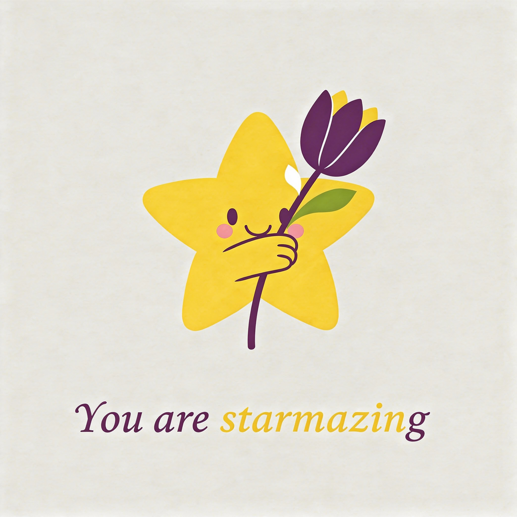 Design a flat vector illustration in the same minimalist, vibrant style as the reference image. Create a charming and uplifting scene where a **cute, smiling star character** gently holds a tulip in its hand. The star should have a friendly, expressive face with simple dot eyes and a small, joyful smile, radiating warmth and positivity. Use **Canary (#FEE602)** for the star’s body, adding soft gradients and highlights to create a glowing effect. The tulip’s petals should be in **Amethyst (#A65DC9)** with subtle Canary accents for harmony. Keep the shapes bold and clean, with smooth edges and a light, neutral background to make the colors stand out. Below the illustration, include the text **“You are starmazing”** in a modern, elegant font using either Amethyst (#A65DC9) or Canary (#FEE602). Maintain the minimalist, balanced composition and a cheerful, heartwarming vibe consistent with the reference style.