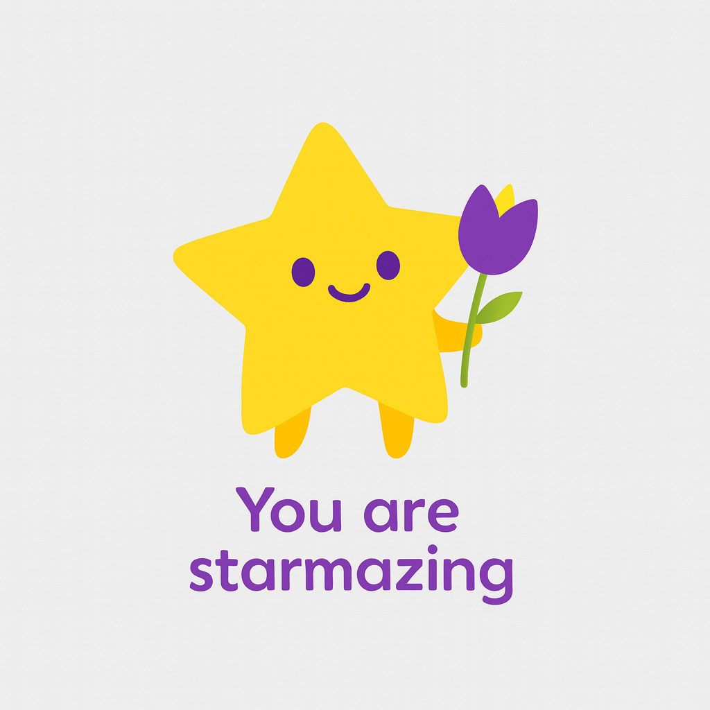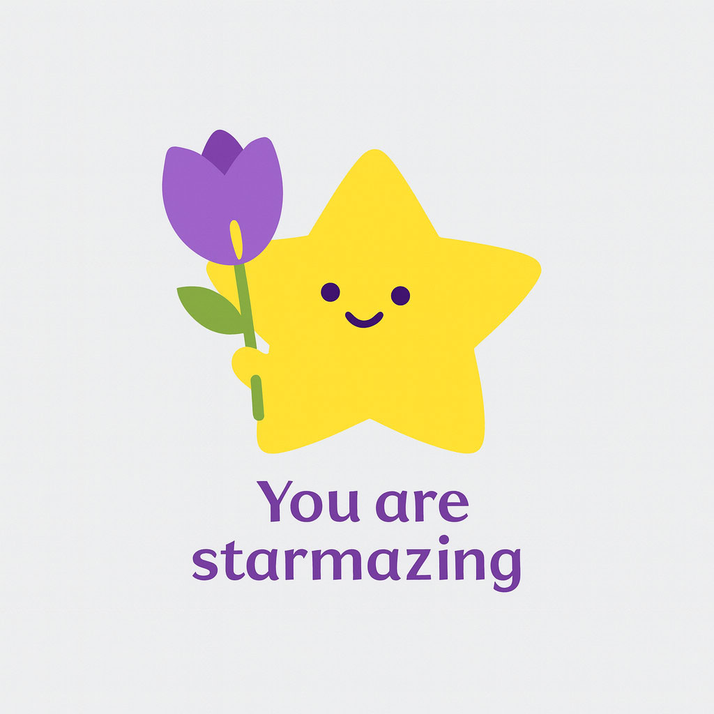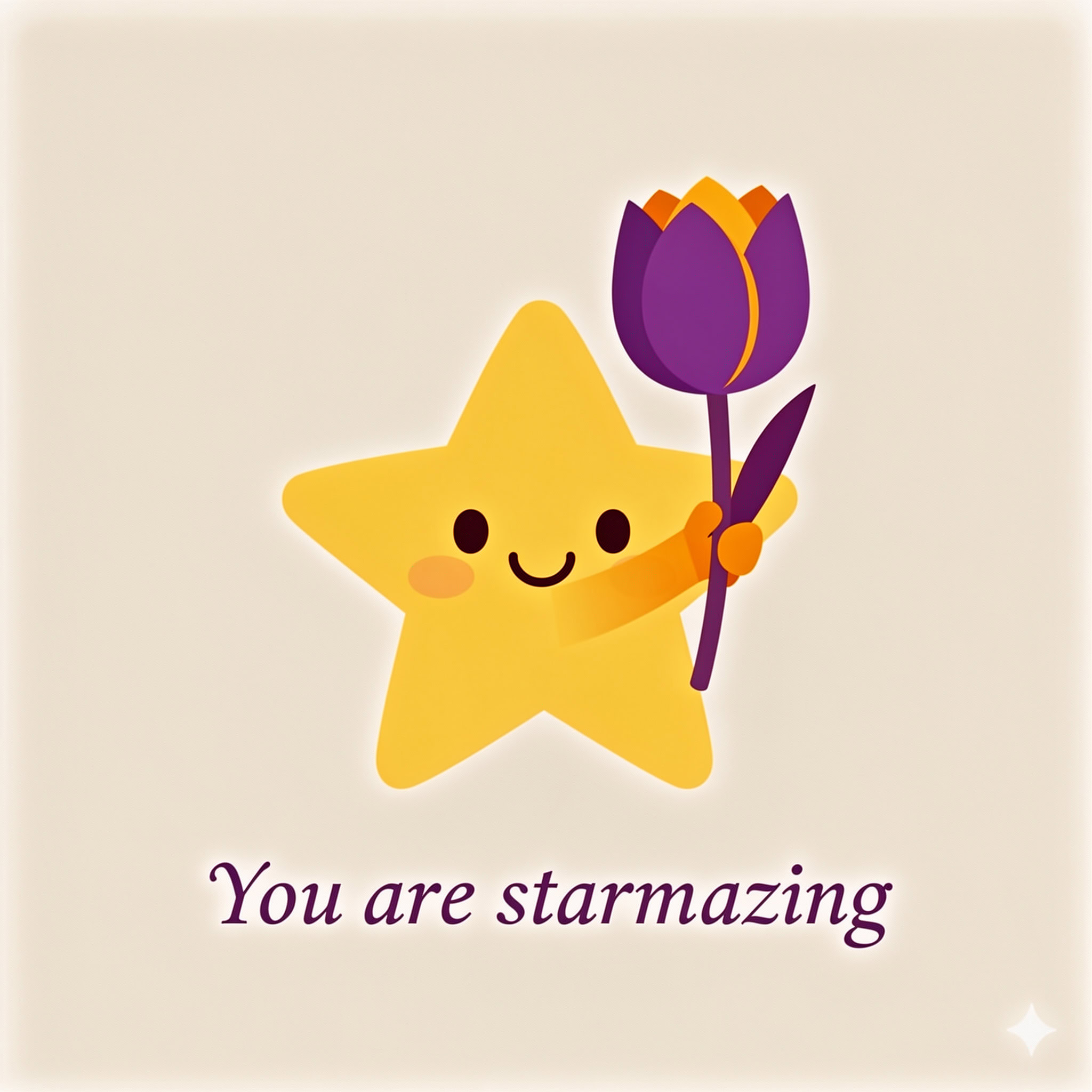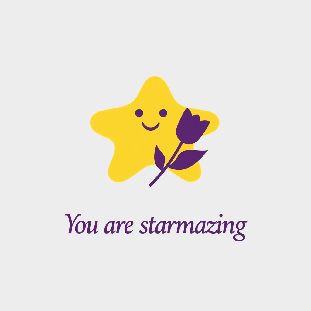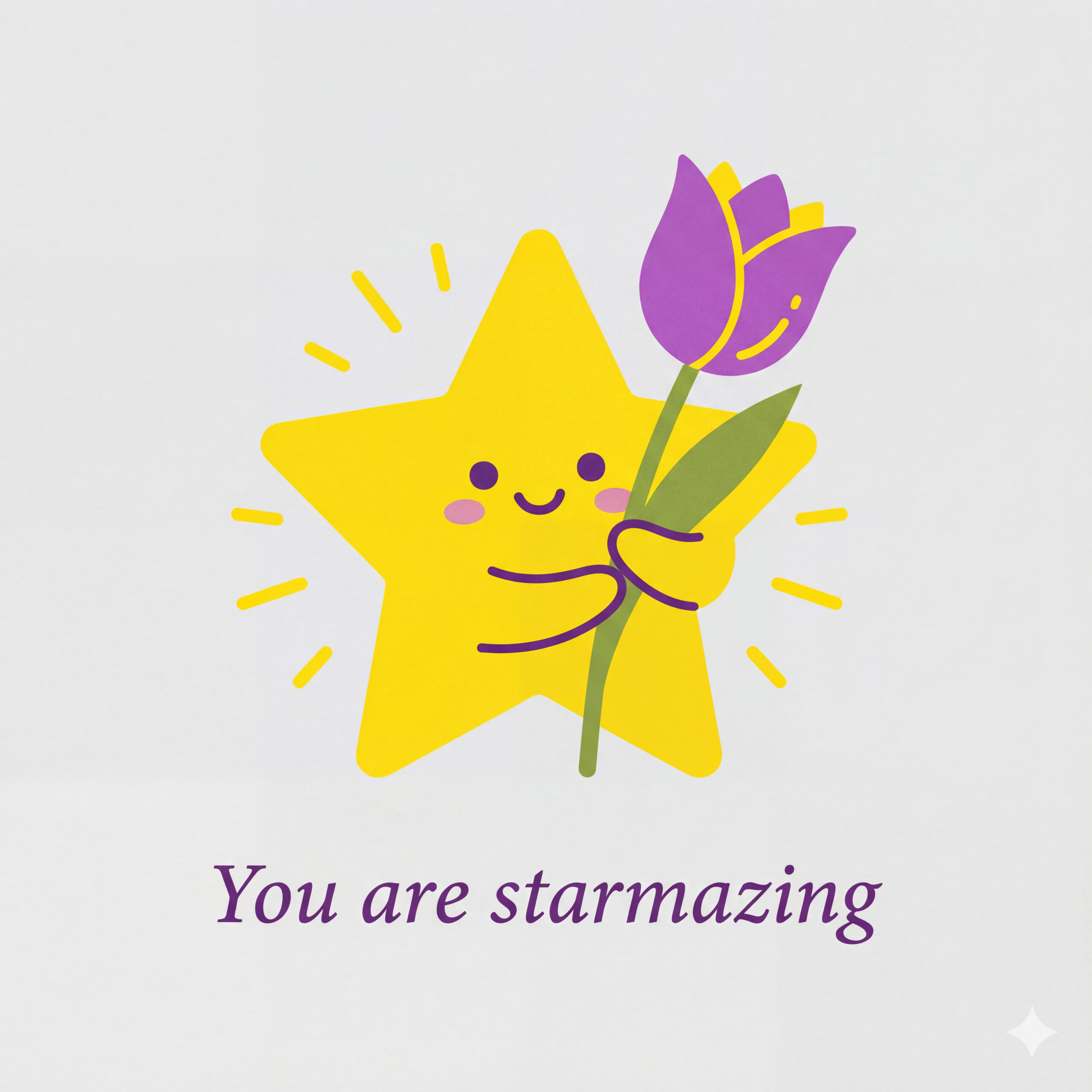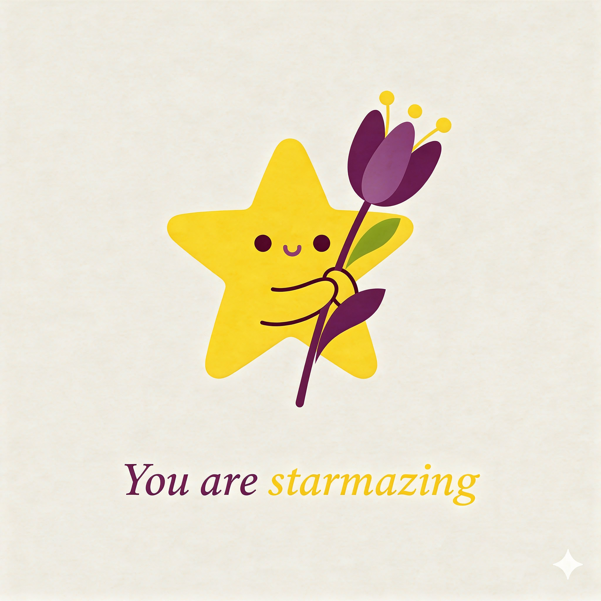 Design a flat vector illustration in the same minimalist, vibrant style as the reference image. Create a charming and uplifting scene where a **cute, smiling star character** gently holds a tulip in its hand. The star should have a friendly, expressive face with simple dot eyes and a small, joyful smile, radiating warmth and positivity. Use **Canary (#FEE602)** for the star’s body, adding soft gradients and highlights to create a glowing effect. The tulip’s petals should be in **Amethyst (#A65DC9)** with subtle Canary accents for harmony. Keep the shapes bold and clean, with smooth edges and a light, neutral background to make the colors stand out. Below the illustration, include the text **“You are starmazing”** in a modern, elegant font using either Amethyst (#A65DC9) or Canary (#FEE602). Maintain the minimalist, balanced composition and a cheerful, heartwarming vibe consistent with the reference style.