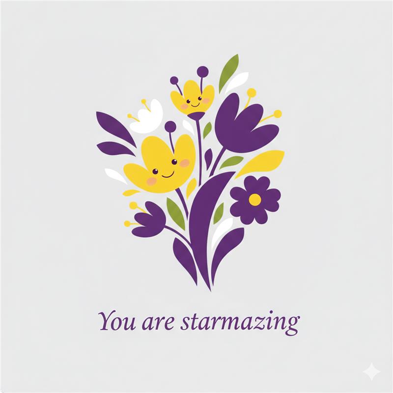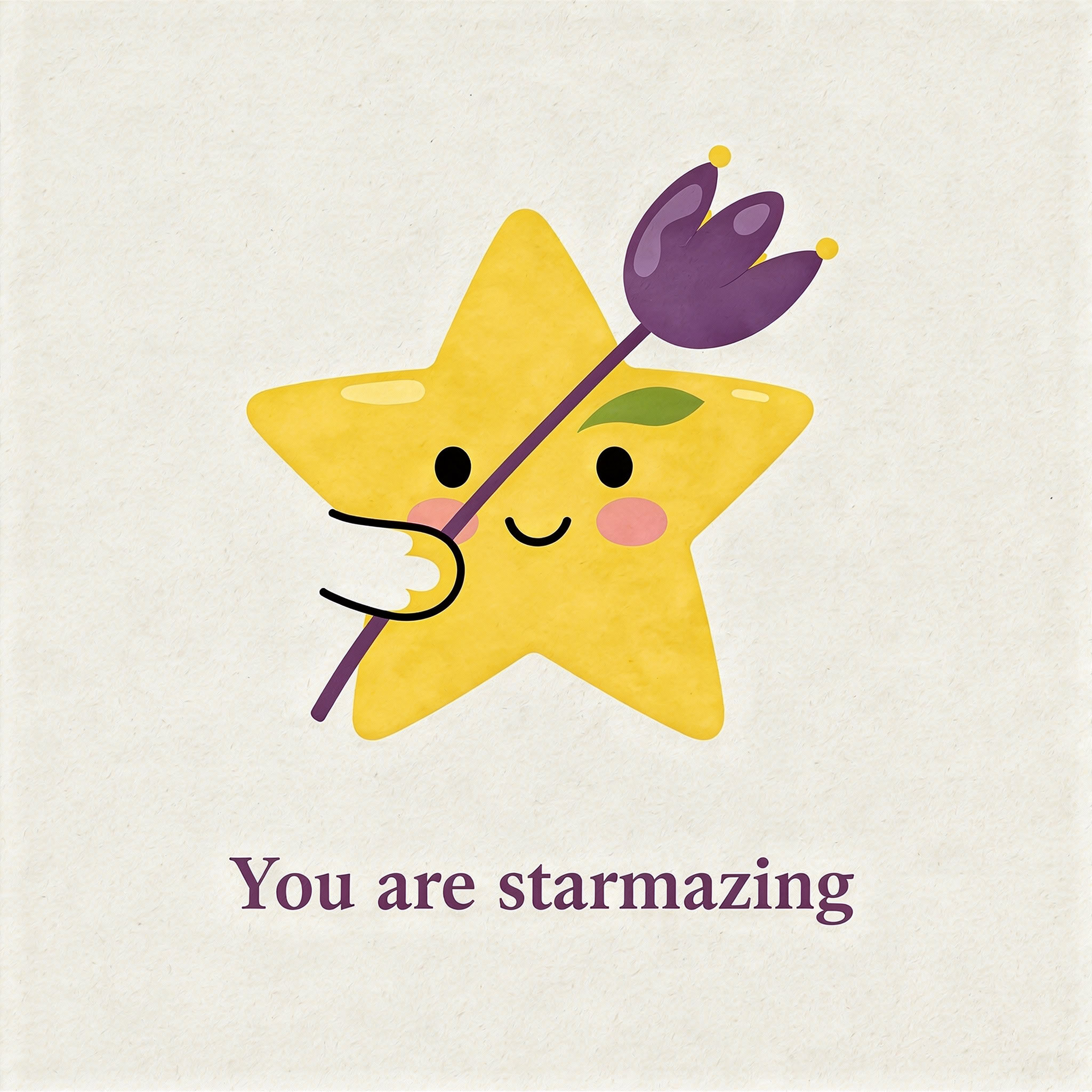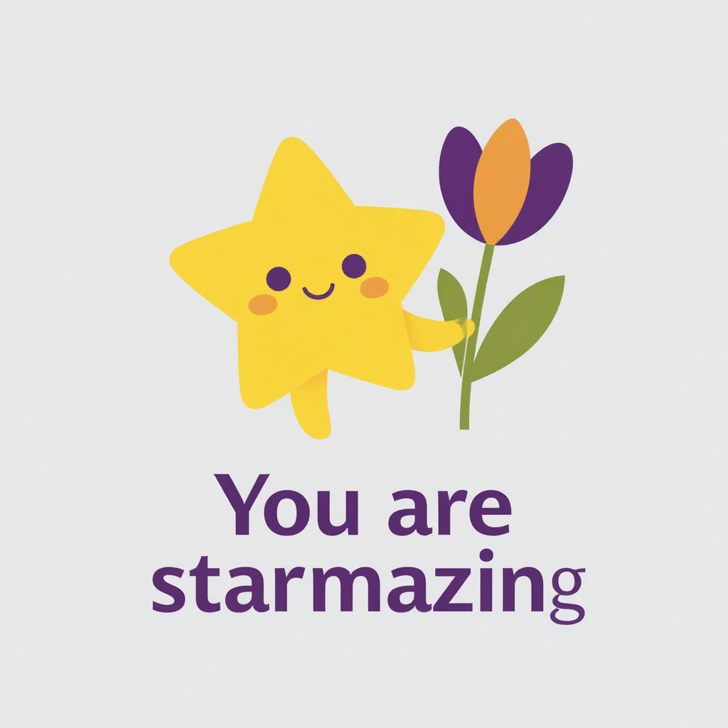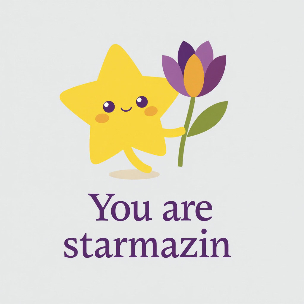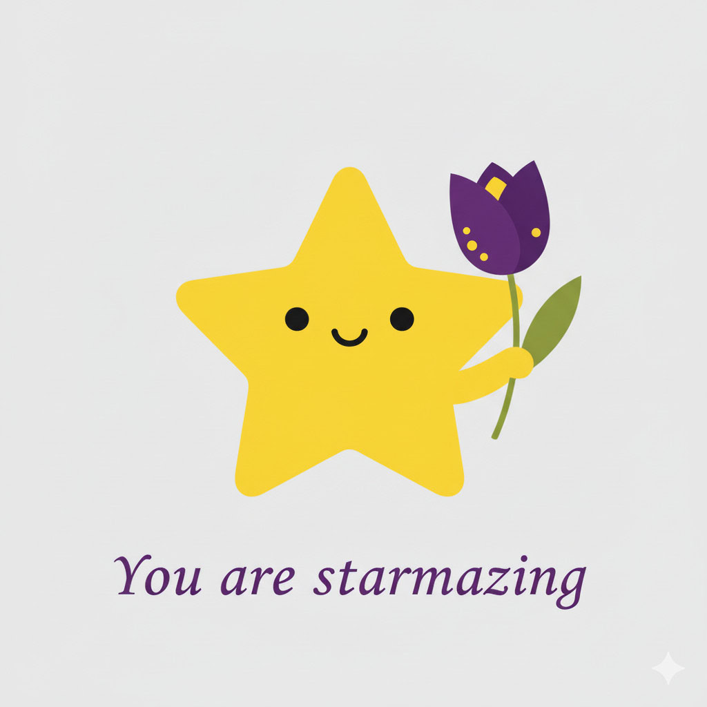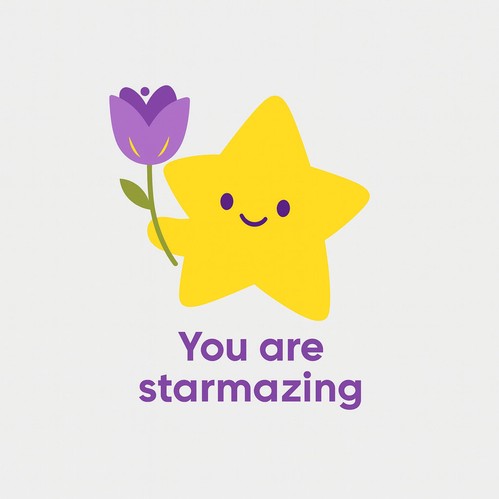 Design a flat vector illustration in the same minimalist, vibrant style as the reference image. Create a charming and uplifting scene where a **cute, smiling star character** gently holds a tulip in its hand. The star should have a friendly, expressive face with simple dot eyes and a small, joyful smile, radiating warmth and positivity. Use **Canary (#FEE602)** for the star’s body, adding soft gradients and highlights to create a glowing effect. The tulip’s petals should be in **Amethyst (#A65DC9)** with subtle Canary accents for harmony. Keep the shapes bold and clean, with smooth edges and a light, neutral background to make the colors stand out. Below the illustration, include the text **“You are starmazing”** in a modern, elegant font using either Amethyst (#A65DC9) or Canary (#FEE602). Maintain the minimalist, balanced composition and a cheerful, heartwarming vibe consistent with the reference style.