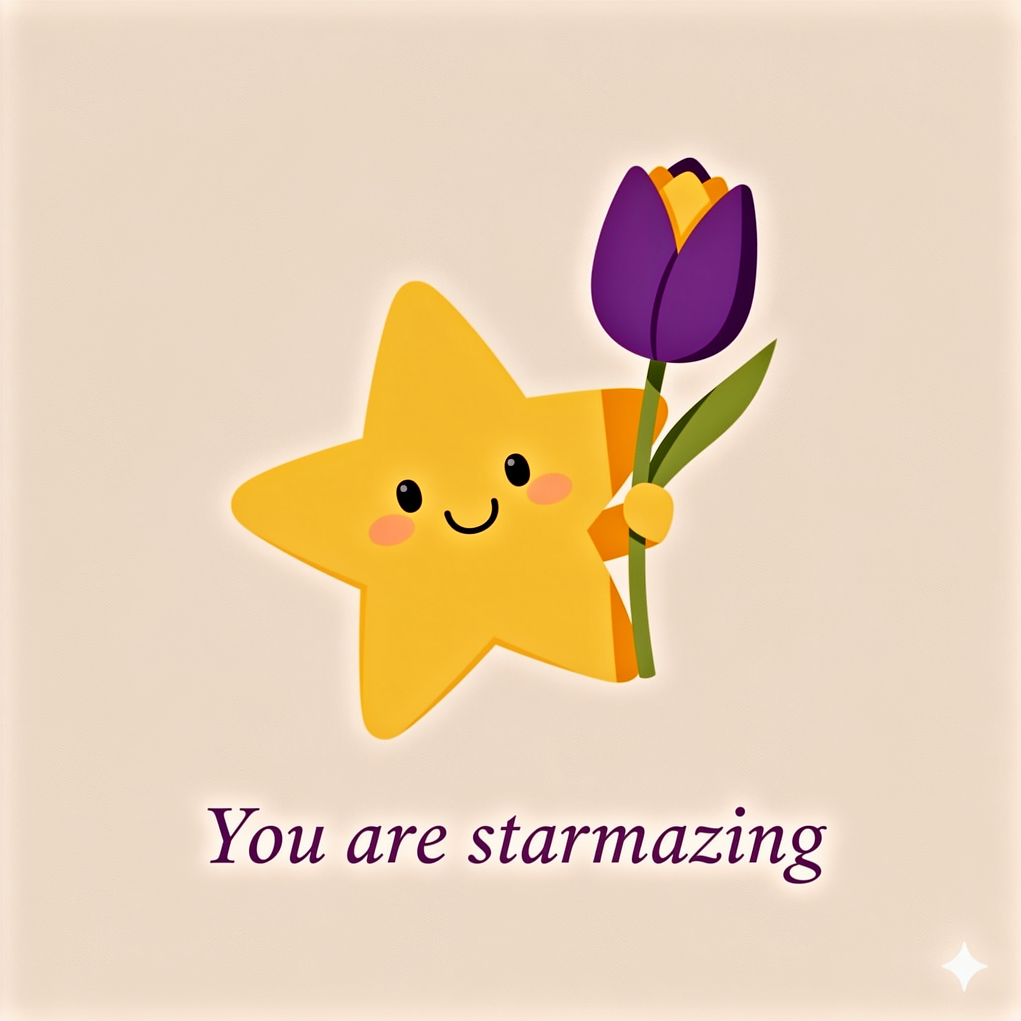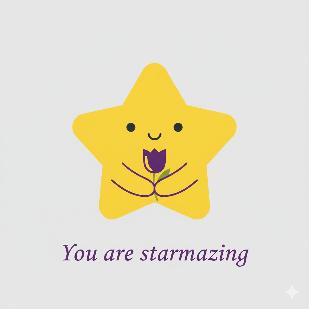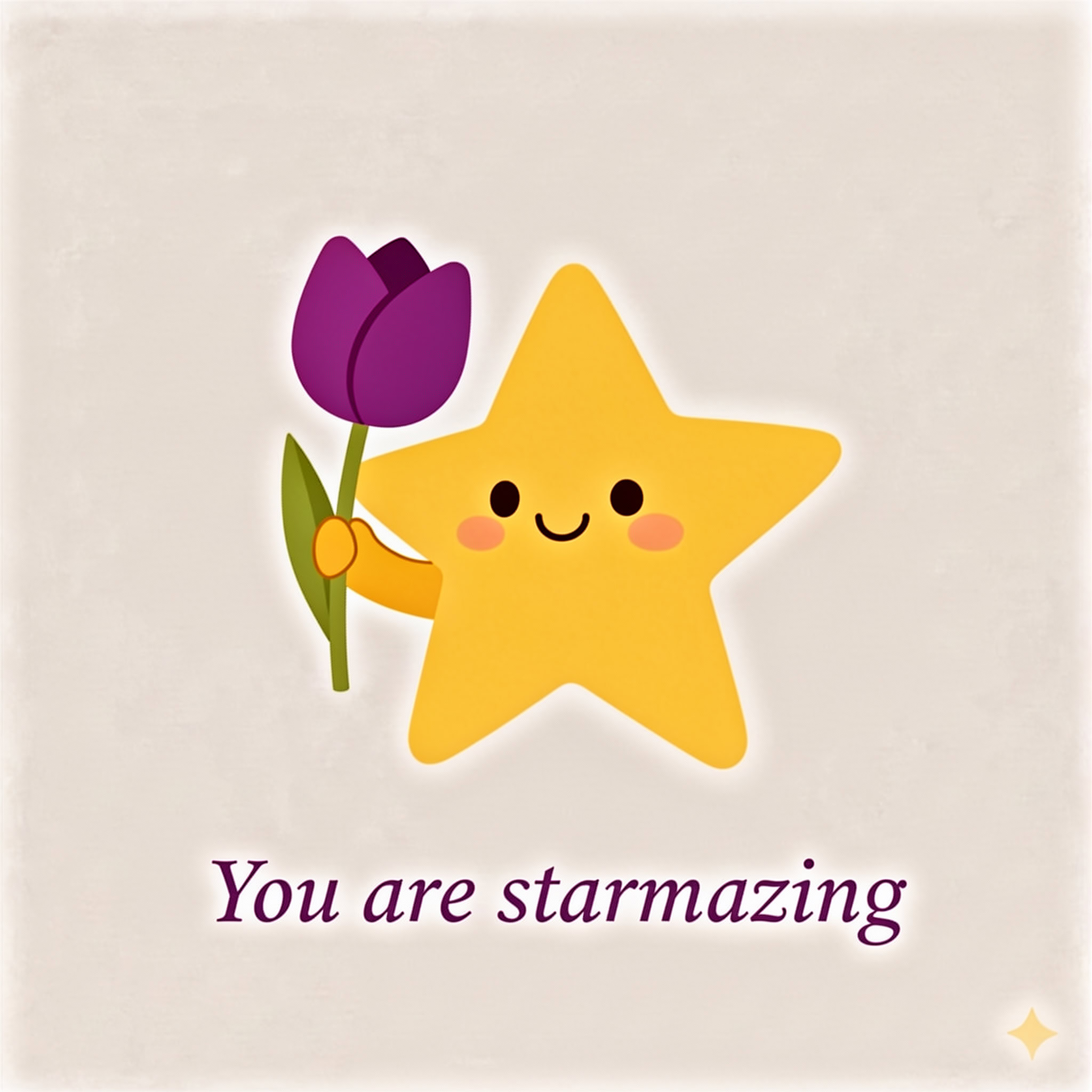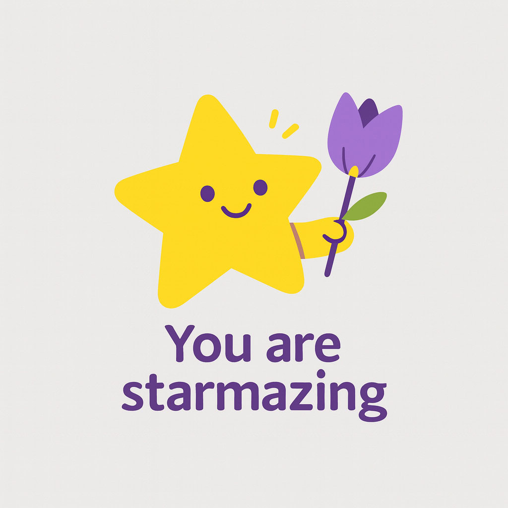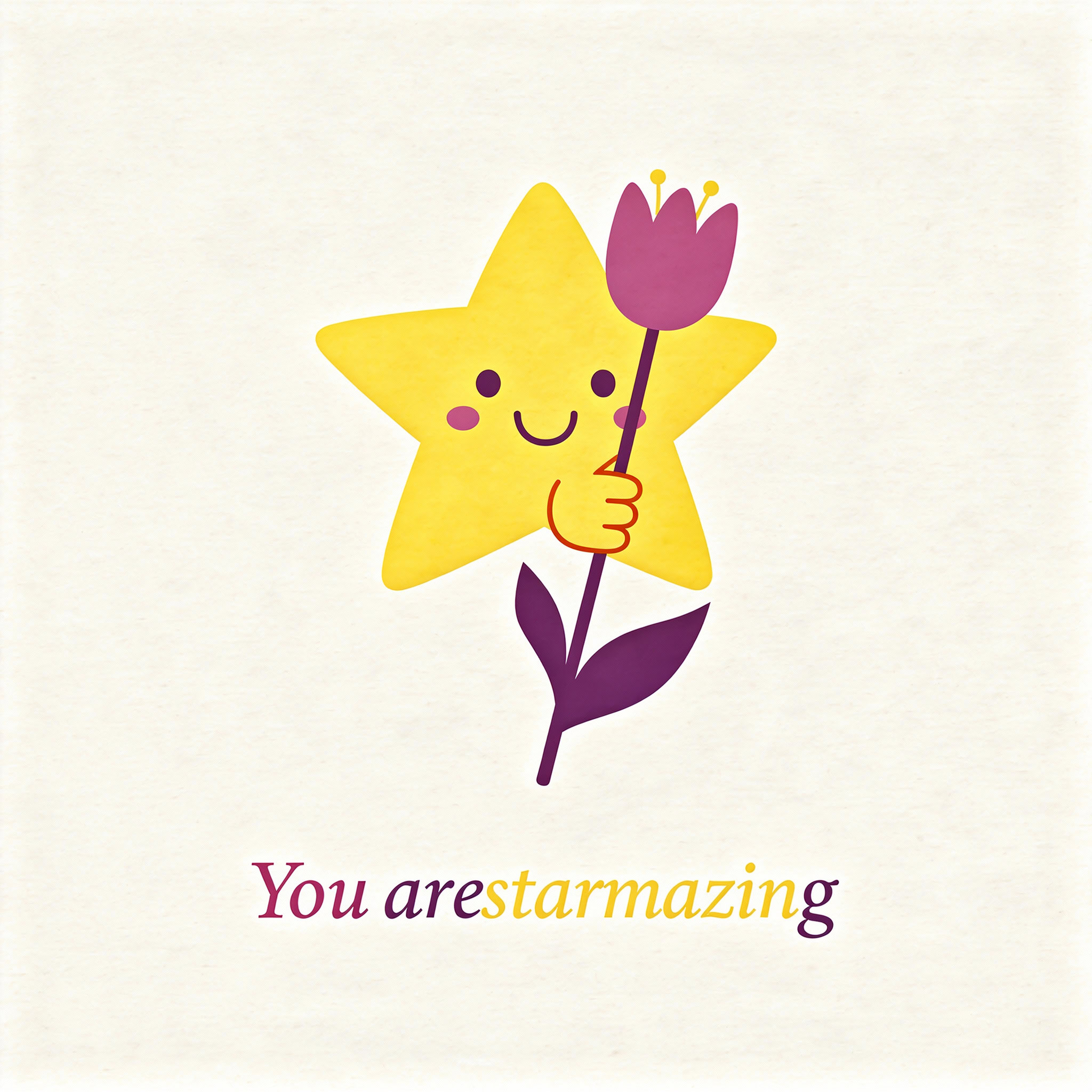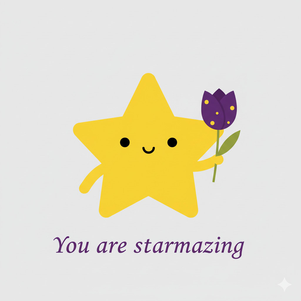 Design a flat vector illustration in the same minimalist, vibrant style as the reference image. Create a charming and uplifting scene where a **cute, smiling star character** gently holds a tulip in its hand. The star should have a friendly, expressive face with simple dot eyes and a small, joyful smile, radiating warmth and positivity. Use **Canary (#FEE602)** for the star’s body, adding soft gradients and highlights to create a glowing effect. The tulip’s petals should be in **Amethyst (#A65DC9)** with subtle Canary accents for harmony. Keep the shapes bold and clean, with smooth edges and a light, neutral background to make the colors stand out. Below the illustration, include the text **“You are starmazing”** in a modern, elegant font using either Amethyst (#A65DC9) or Canary (#FEE602). Maintain the minimalist, balanced composition and a cheerful, heartwarming vibe consistent with the reference style.
