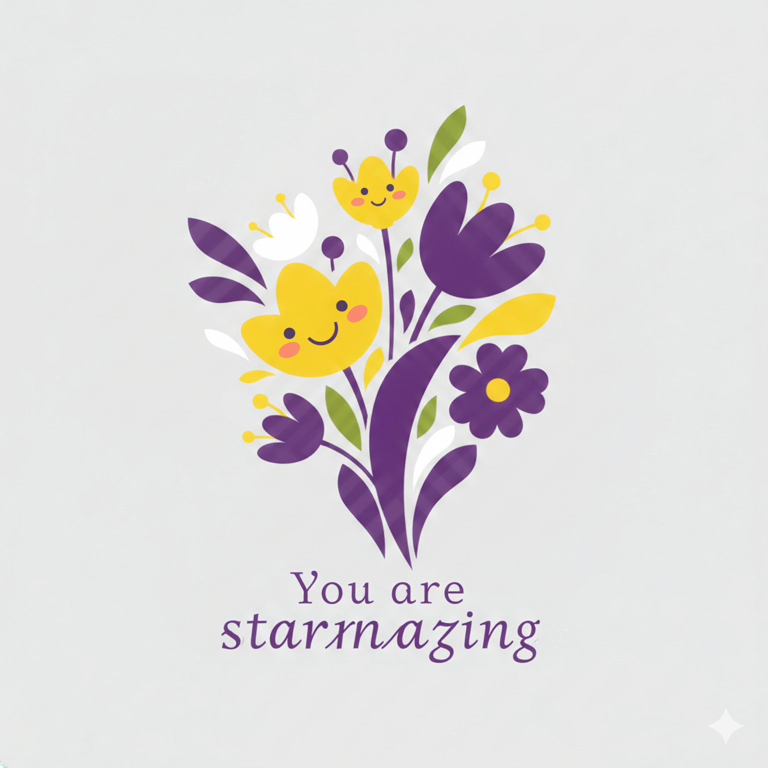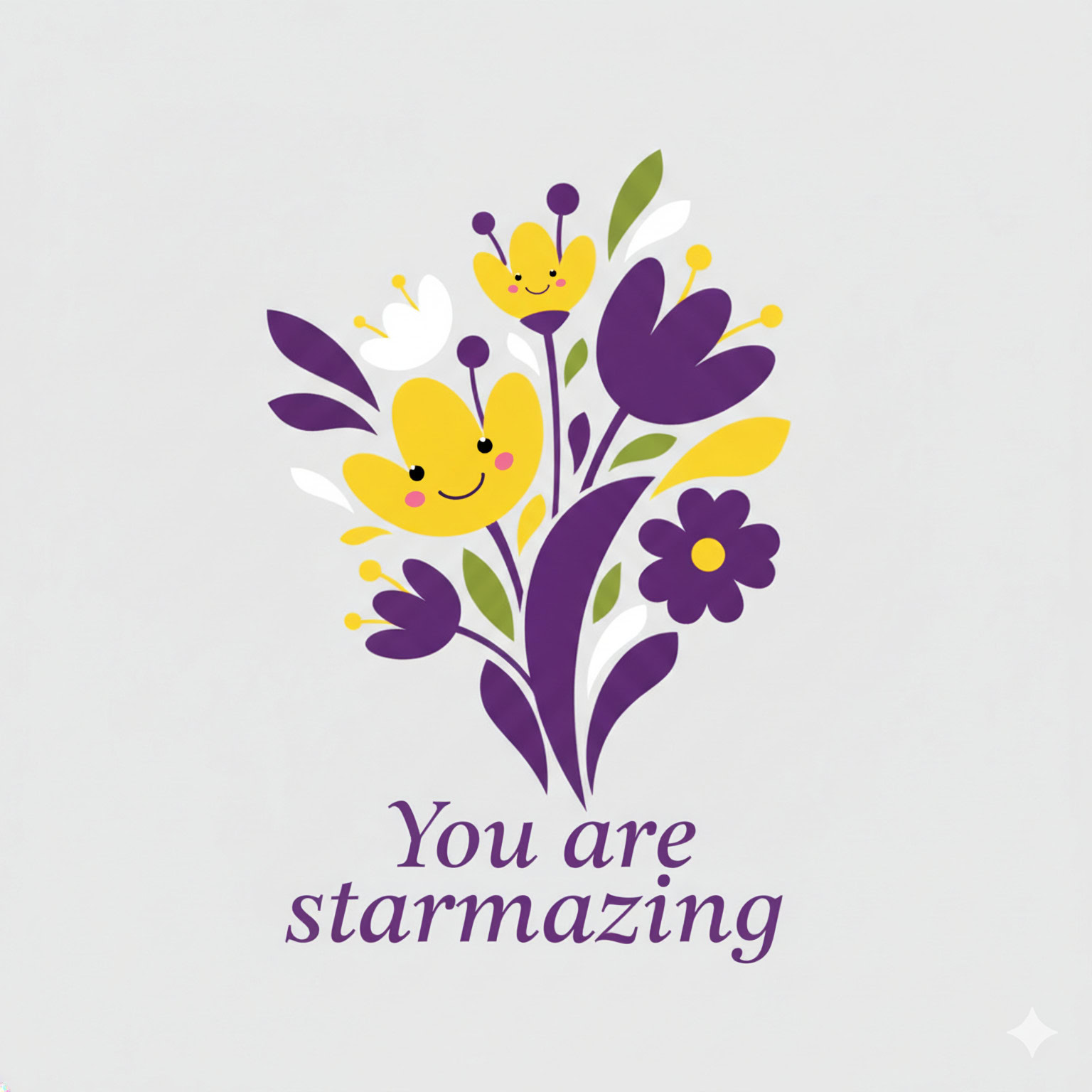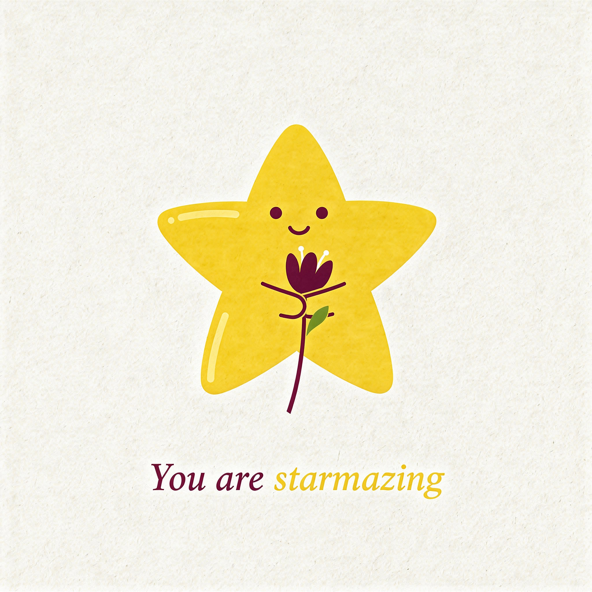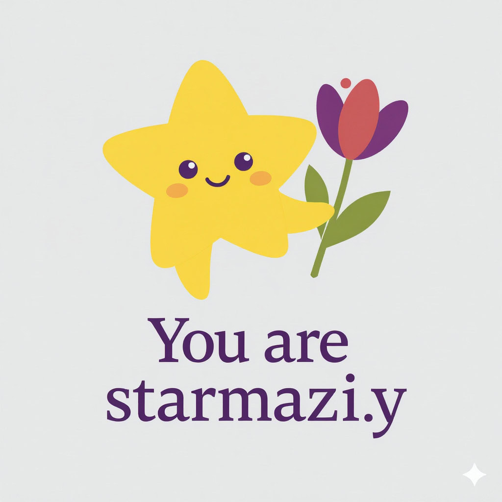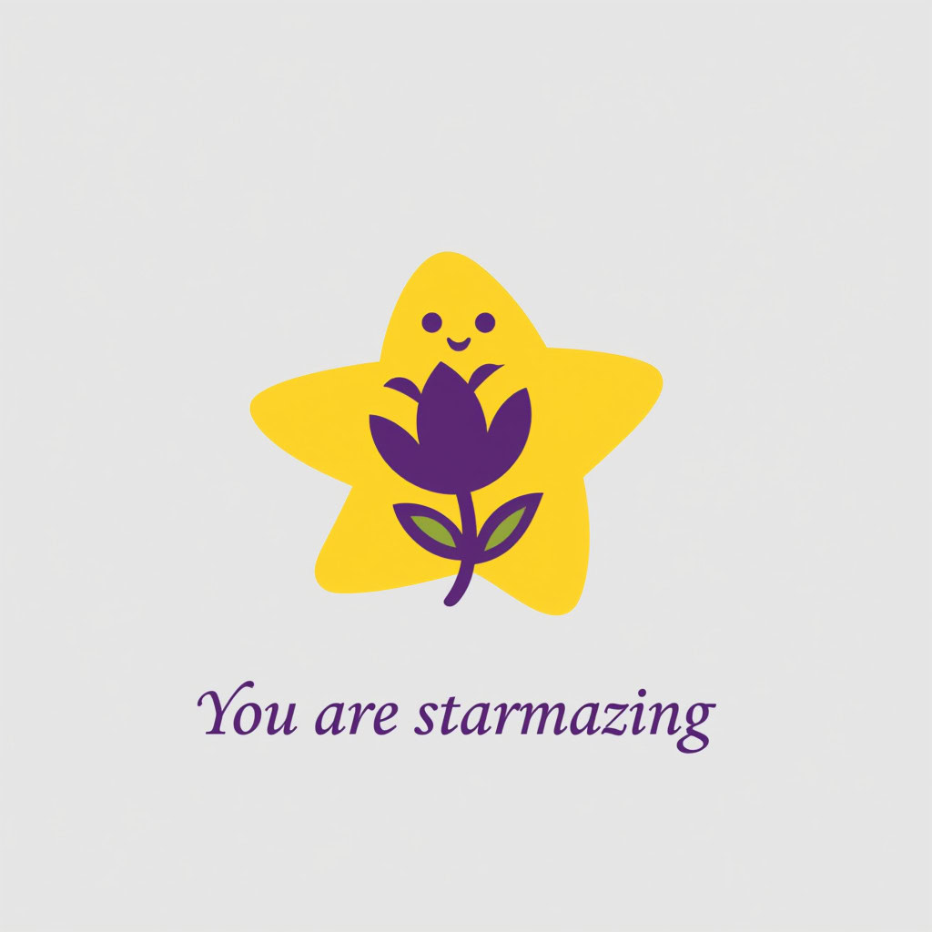 Design a flat vector illustration in the same minimalist, vibrant style as the reference image. Create a charming and uplifting scene where a **cute, smiling star character** gently holds a tulip in its hand. The star should have a friendly, expressive face with simple dot eyes and a small, joyful smile, radiating warmth and positivity. Use **Canary (#FEE602)** for the star’s body, adding soft gradients and highlights to create a glowing effect. The tulip’s petals should be in **Amethyst (#A65DC9)** with subtle Canary accents for harmony. Keep the shapes bold and clean, with smooth edges and a light, neutral background to make the colors stand out. Below the illustration, include the text **“You are starmazing”** in a modern, elegant font using either Amethyst (#A65DC9) or Canary (#FEE602). Maintain the minimalist, balanced composition and a cheerful, heartwarming vibe consistent with the reference style.