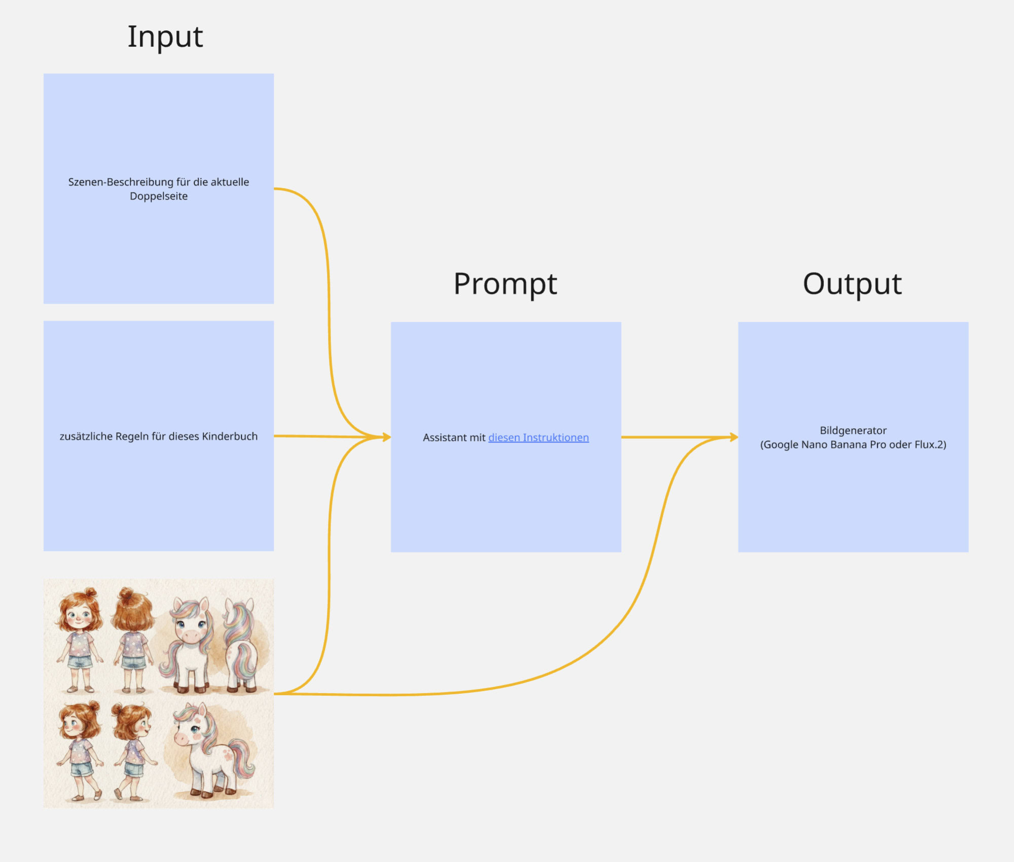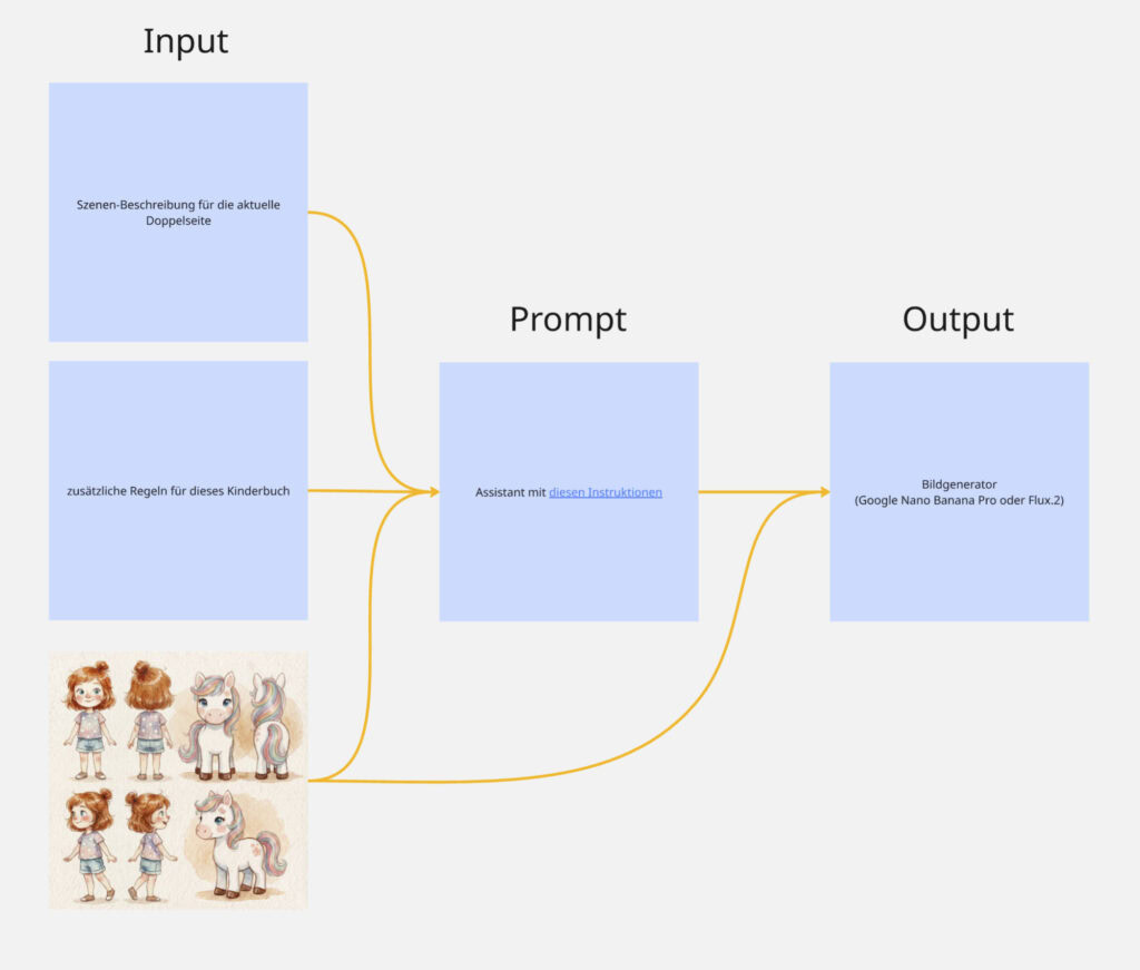 Merge: Der Assistant nimmt die Infos zur Szene/Doppelseite + die 6 Regeln + die Instruktionen des Bild-KI Kontext Promptbots + als Bildinput das Master-Referenzbild mit den Charakteren.