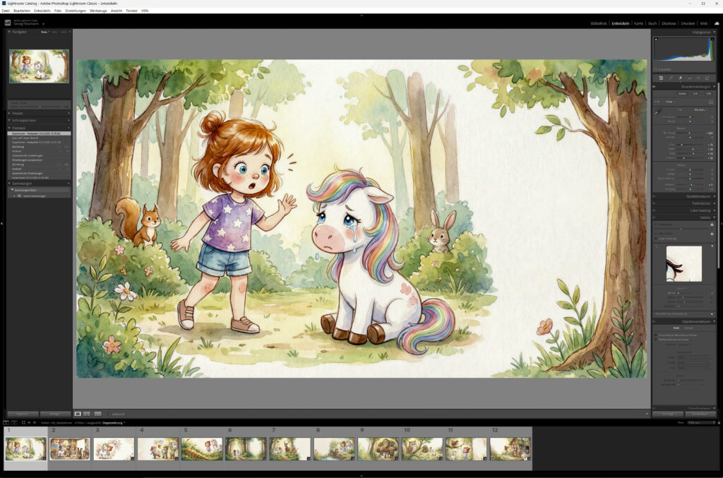 Der Look (Color Grading): Das ist der wichtigste Schritt für das Buch-Gefühl. KI-Bilder haben oft unterschiedliche Lichtstimmungen. In Lightroom lege ich ein Preset über alle 12 Doppelseiten, ziehe die Kontraste glatt und sorge dafür, dass das „Grün“ des Waldes auf Seite 3 genauso aussieht wie auf Seite 10. Das schafft optische Ruhe und Konsistenz.