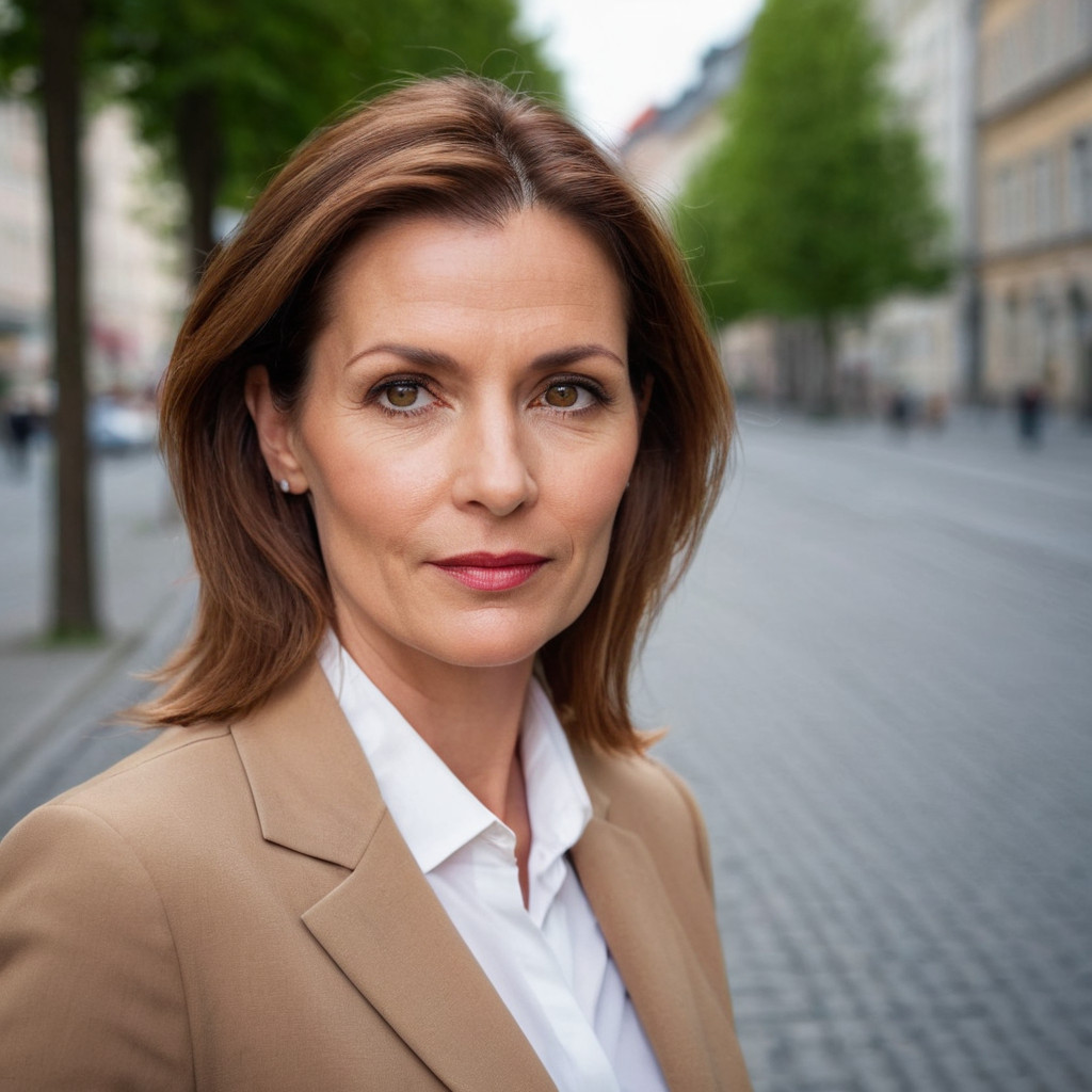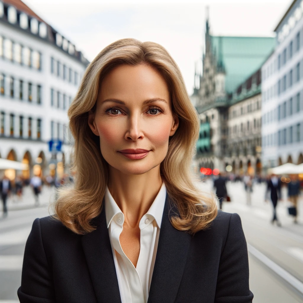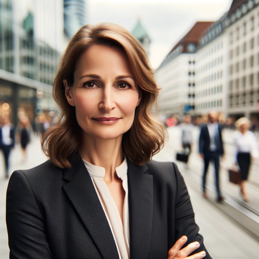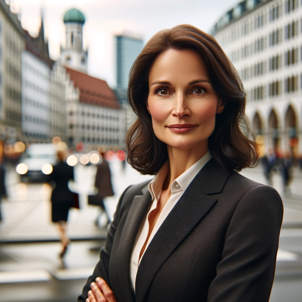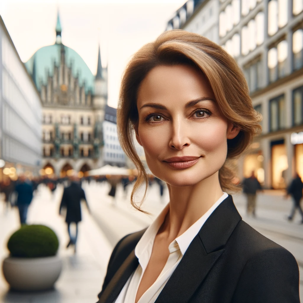 Prompt: portrait photo of a 40 year old business woman, streets of munich