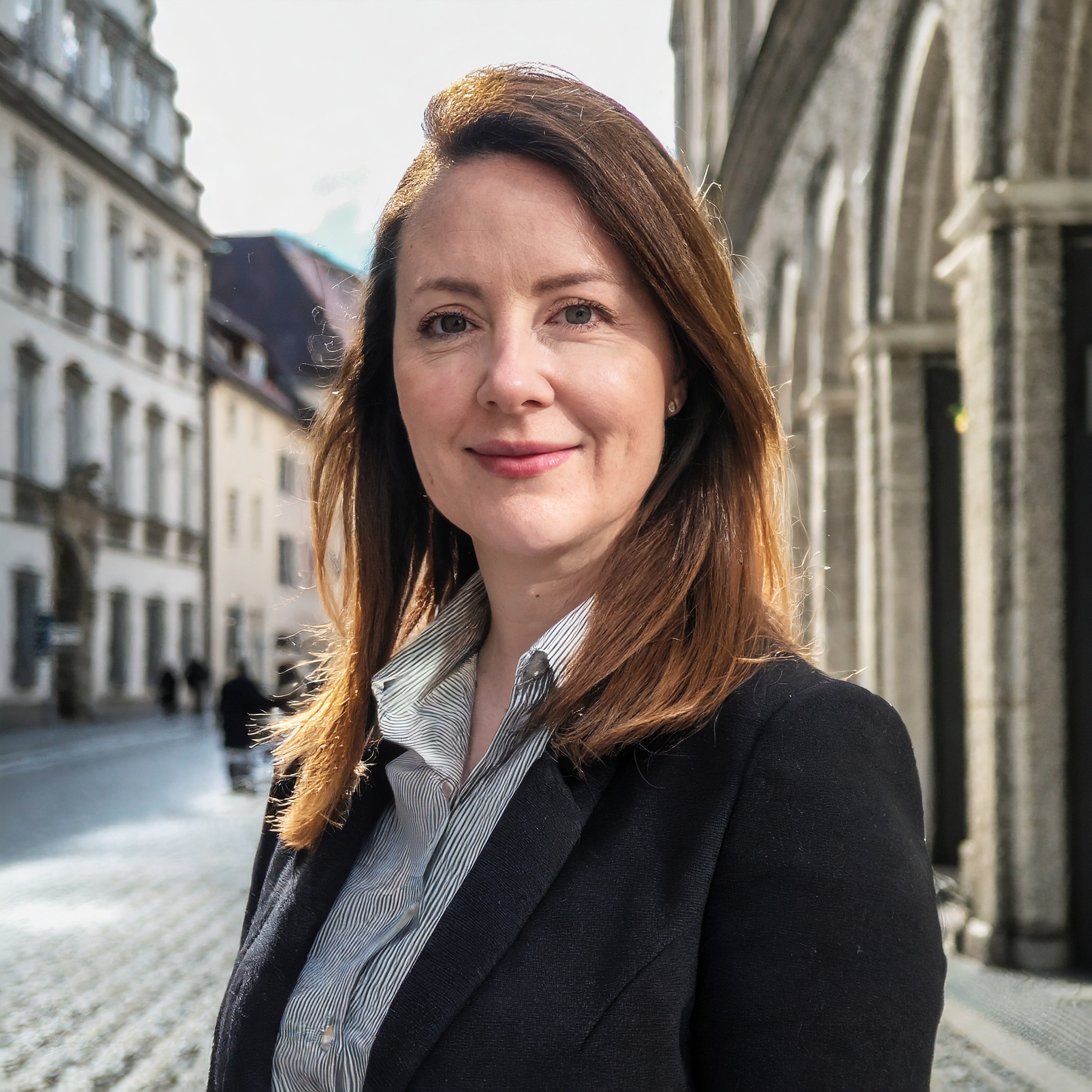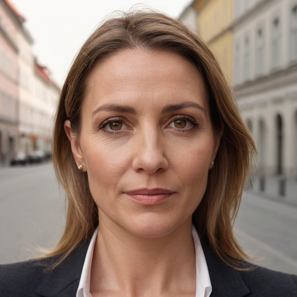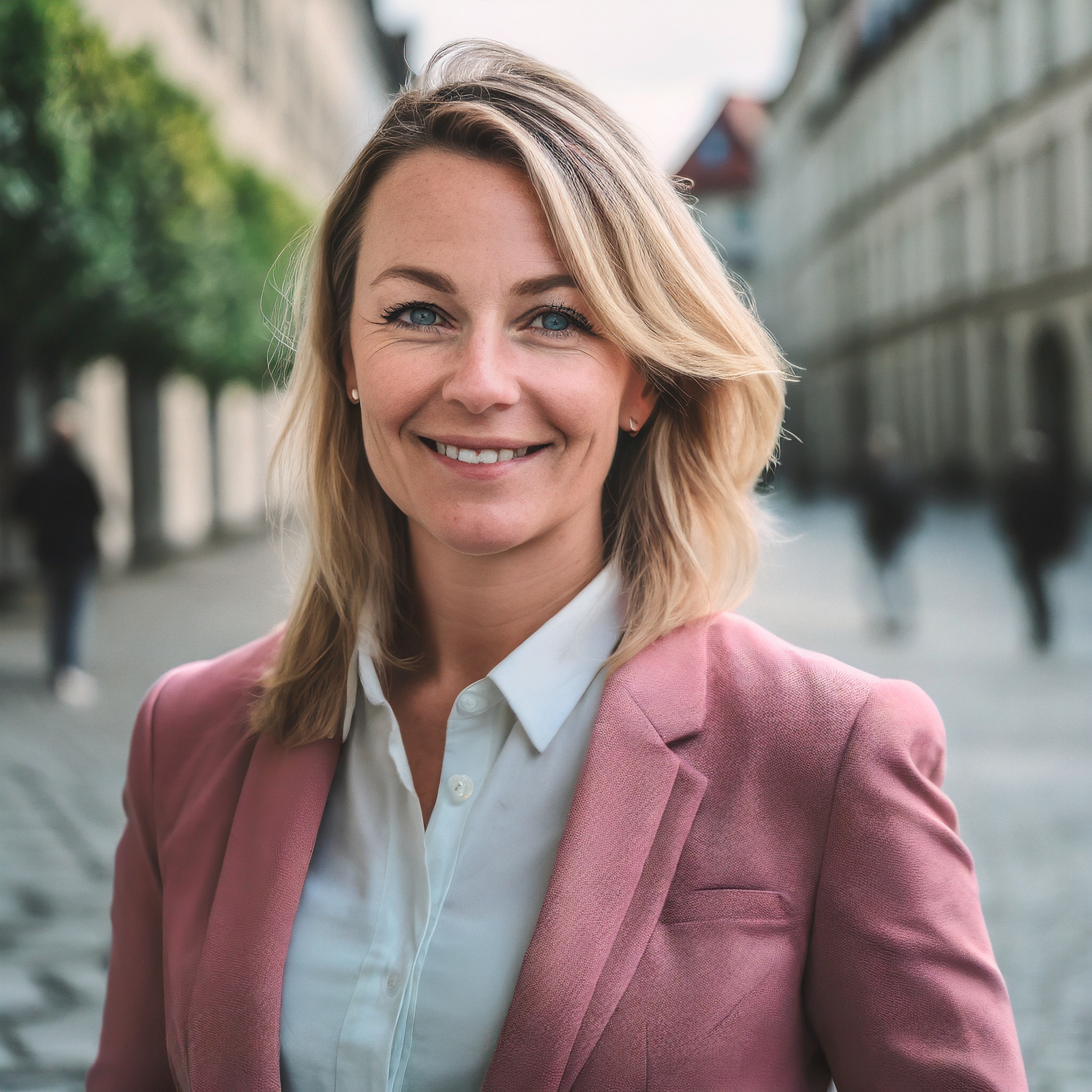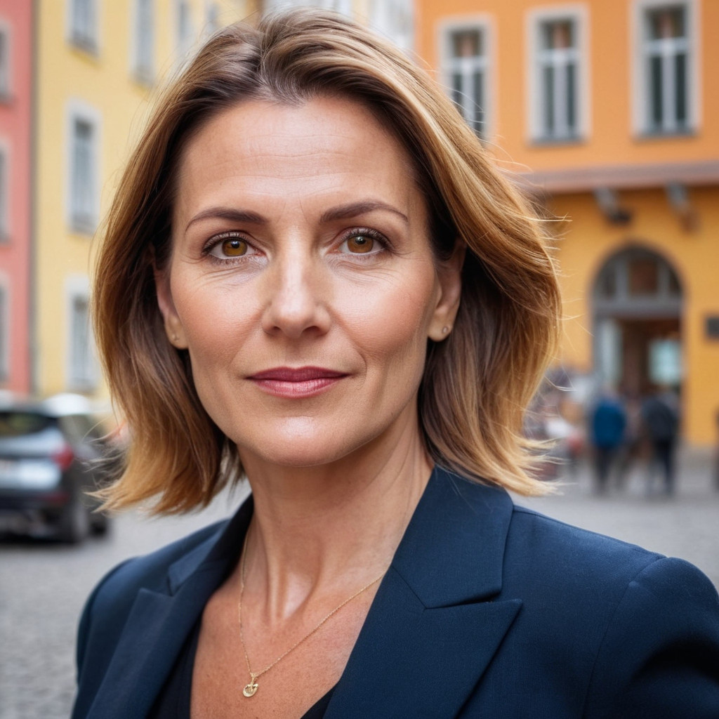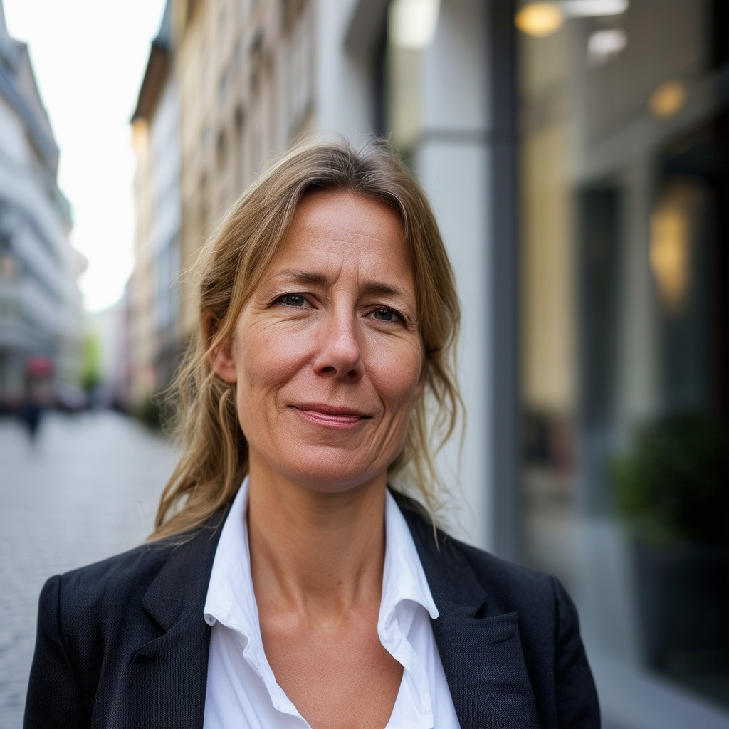 Prompt: portrait photo of a 40 year old business woman, streets of munich