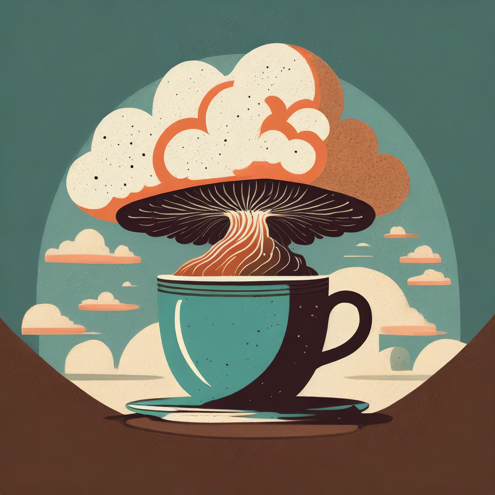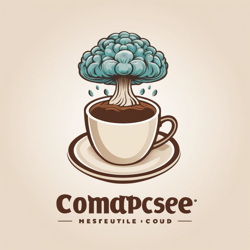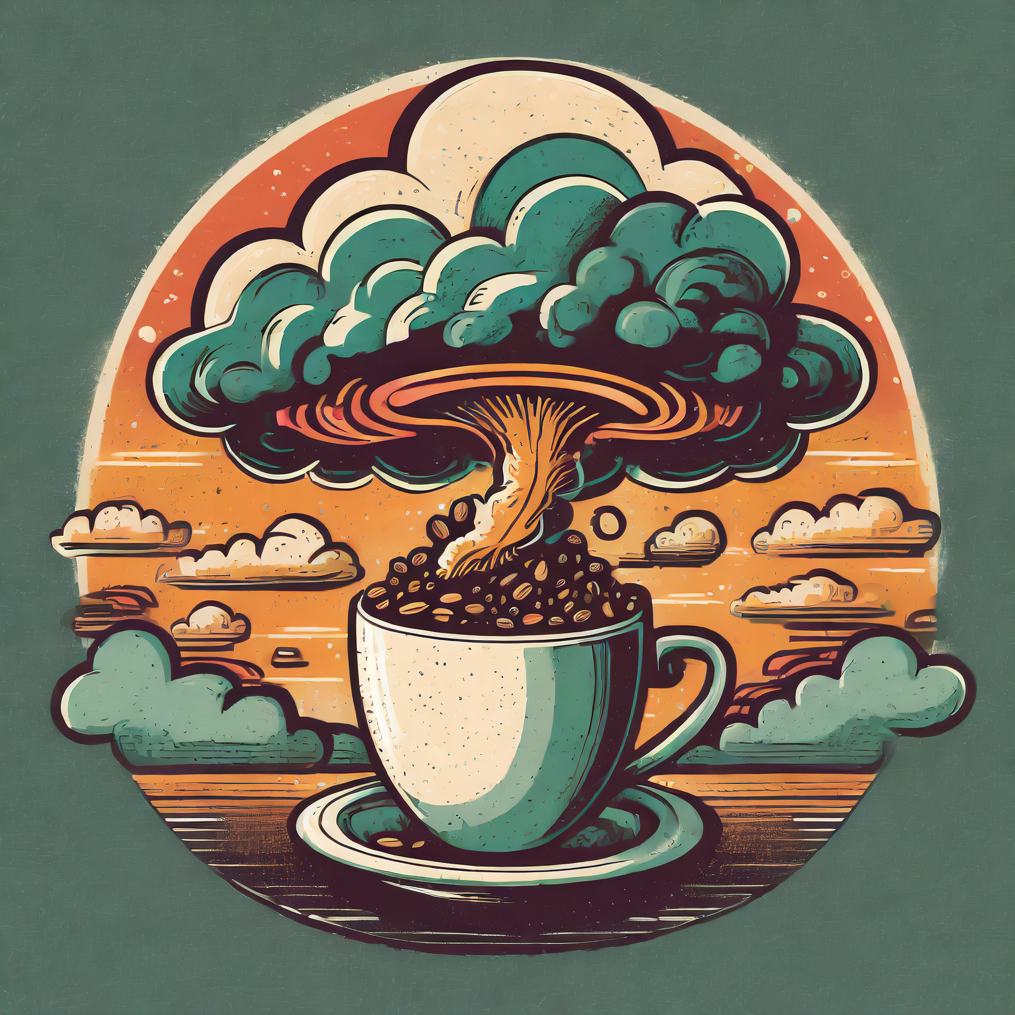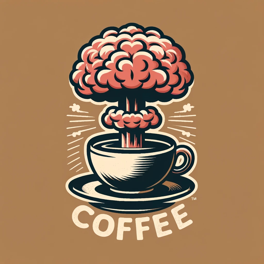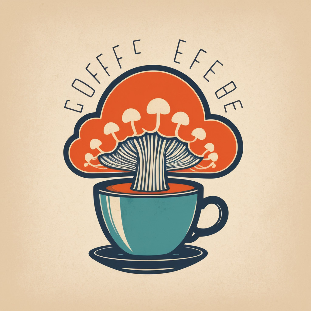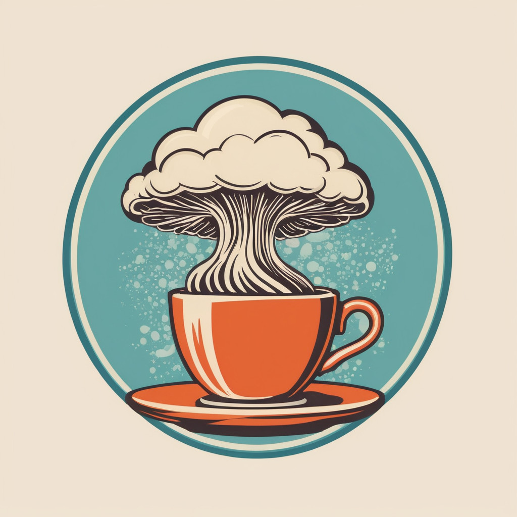 Prompt: Coffee logo, featuring a mushroom cloud coming out of a cup, the cloud looks like brains, full colour print, vintage colours, 1960s