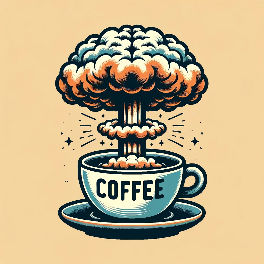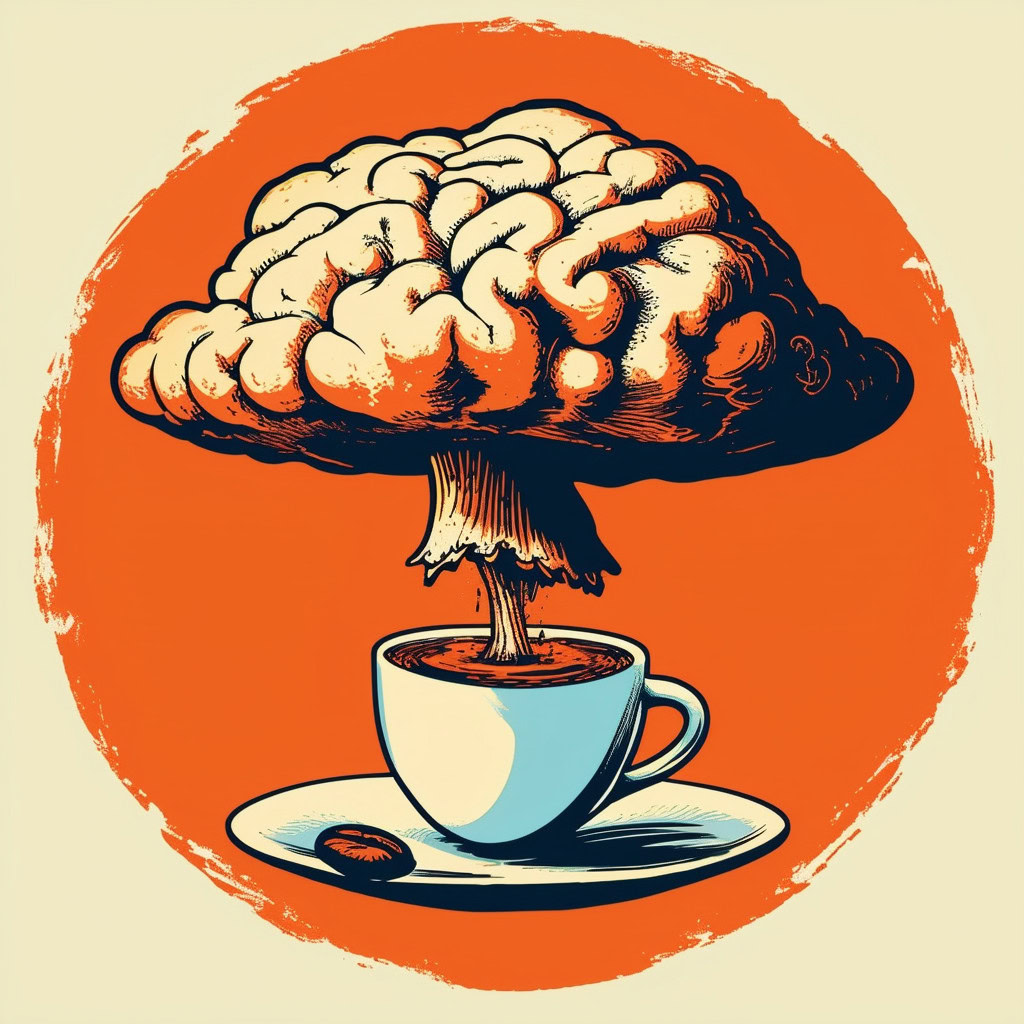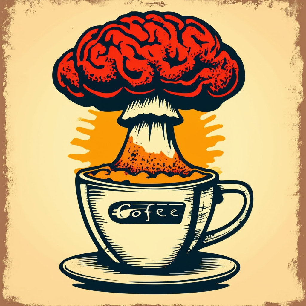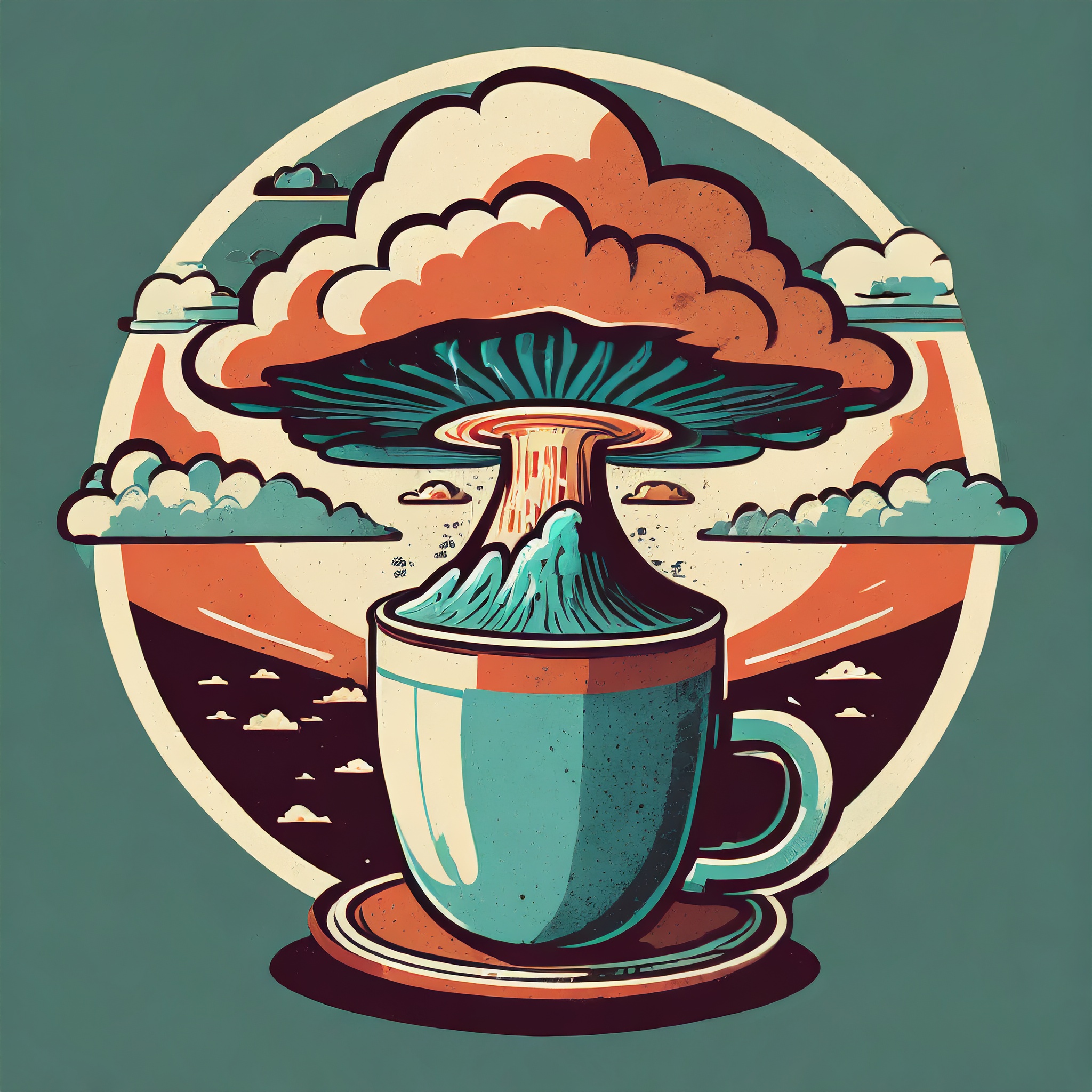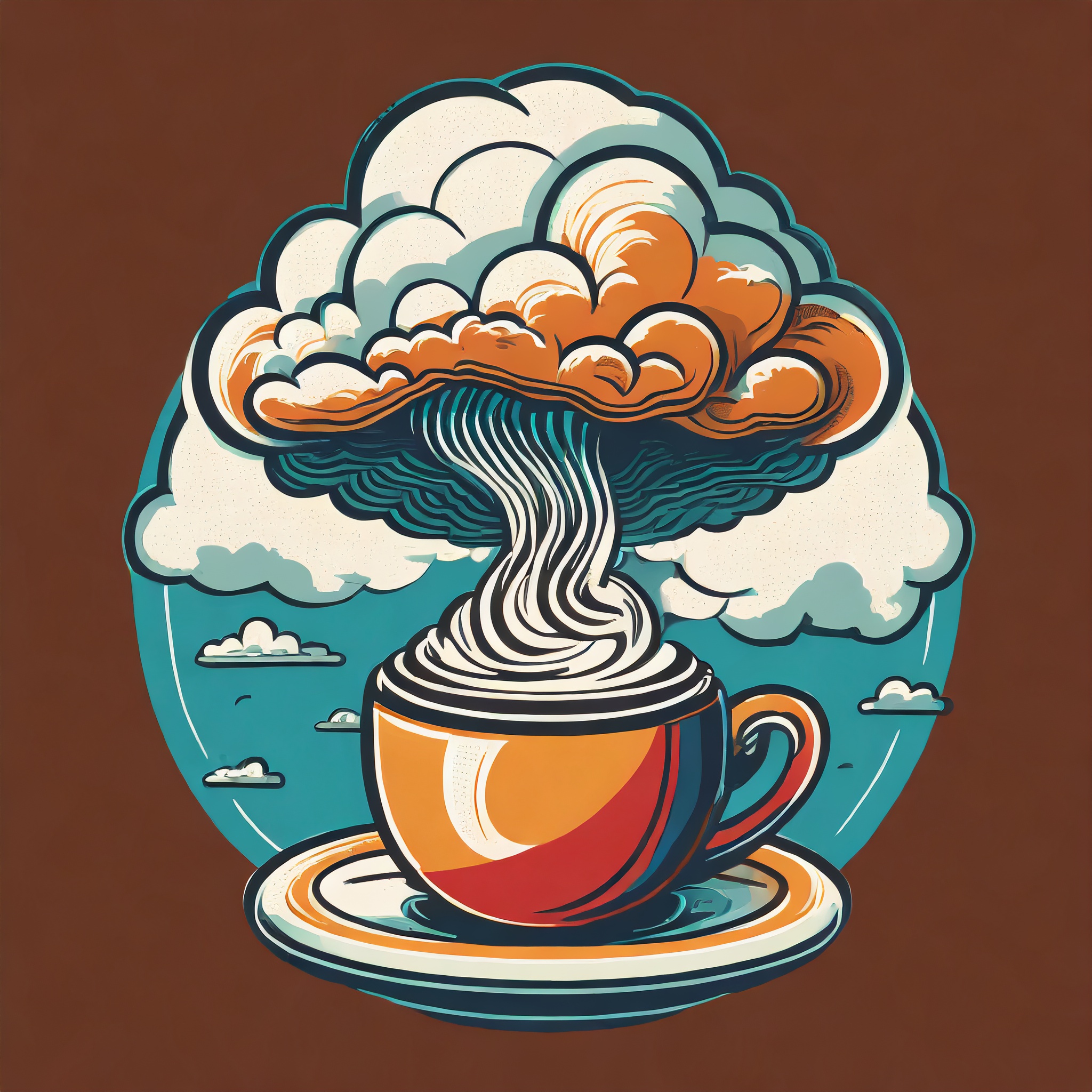 Prompt: Coffee logo, featuring a mushroom cloud coming out of a cup, the cloud looks like brains, full colour print, vintage colours, 1960s