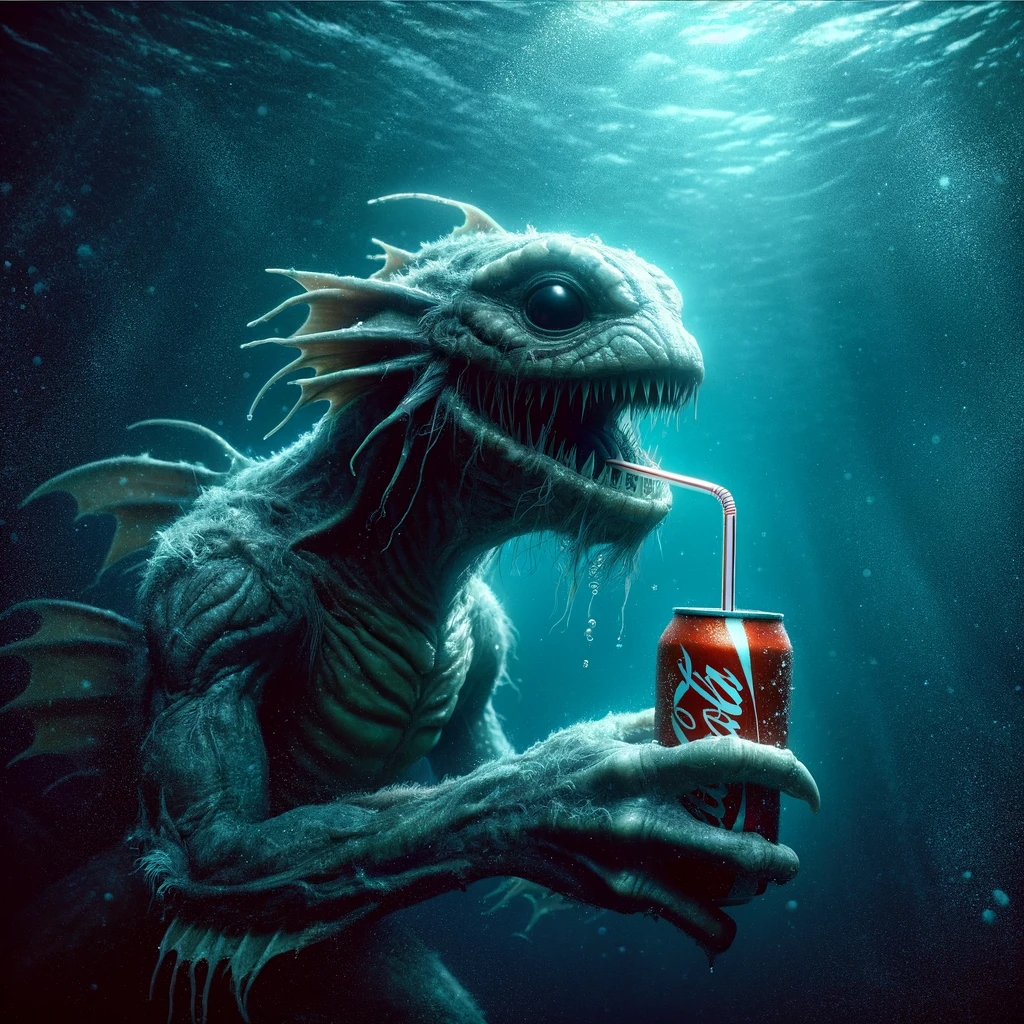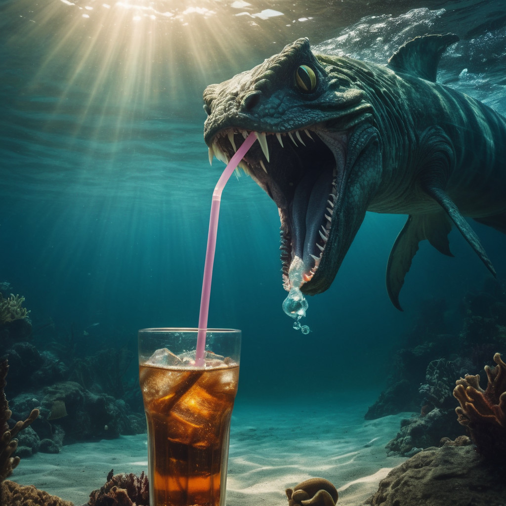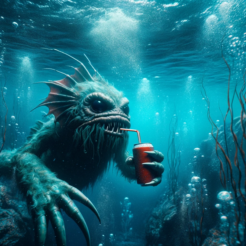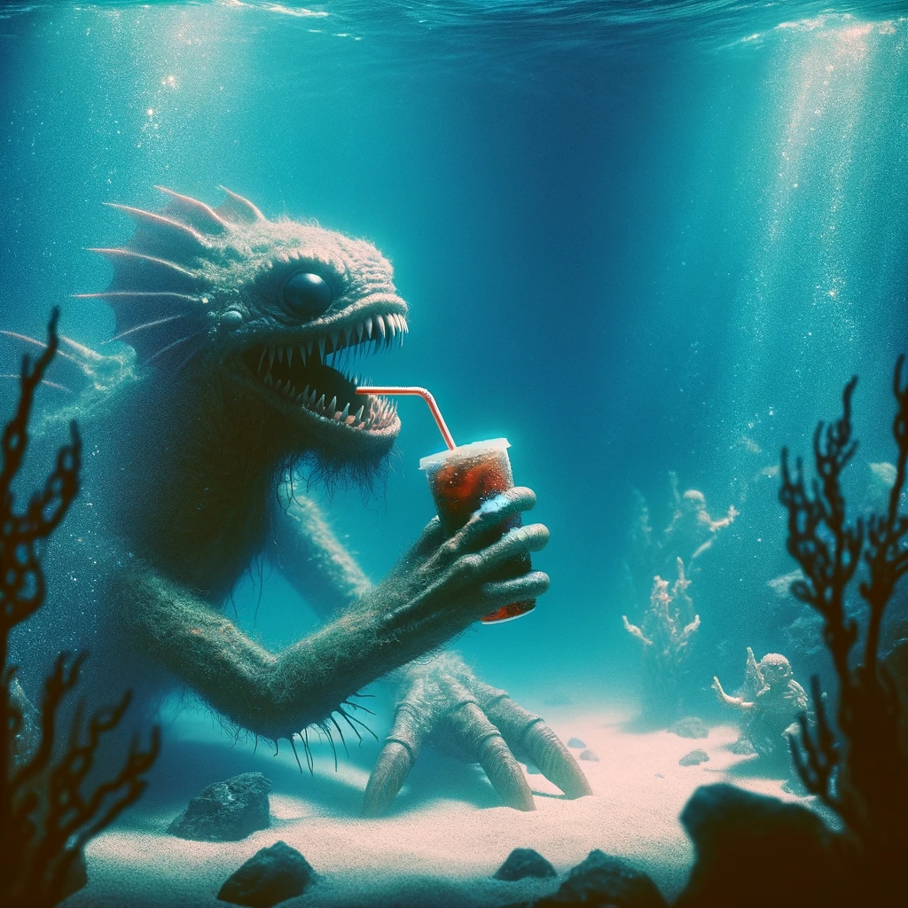 Prompt: photo of a sea monster drinking a soda with a drinking straw, underwater, deep sea, fantasy, abstract