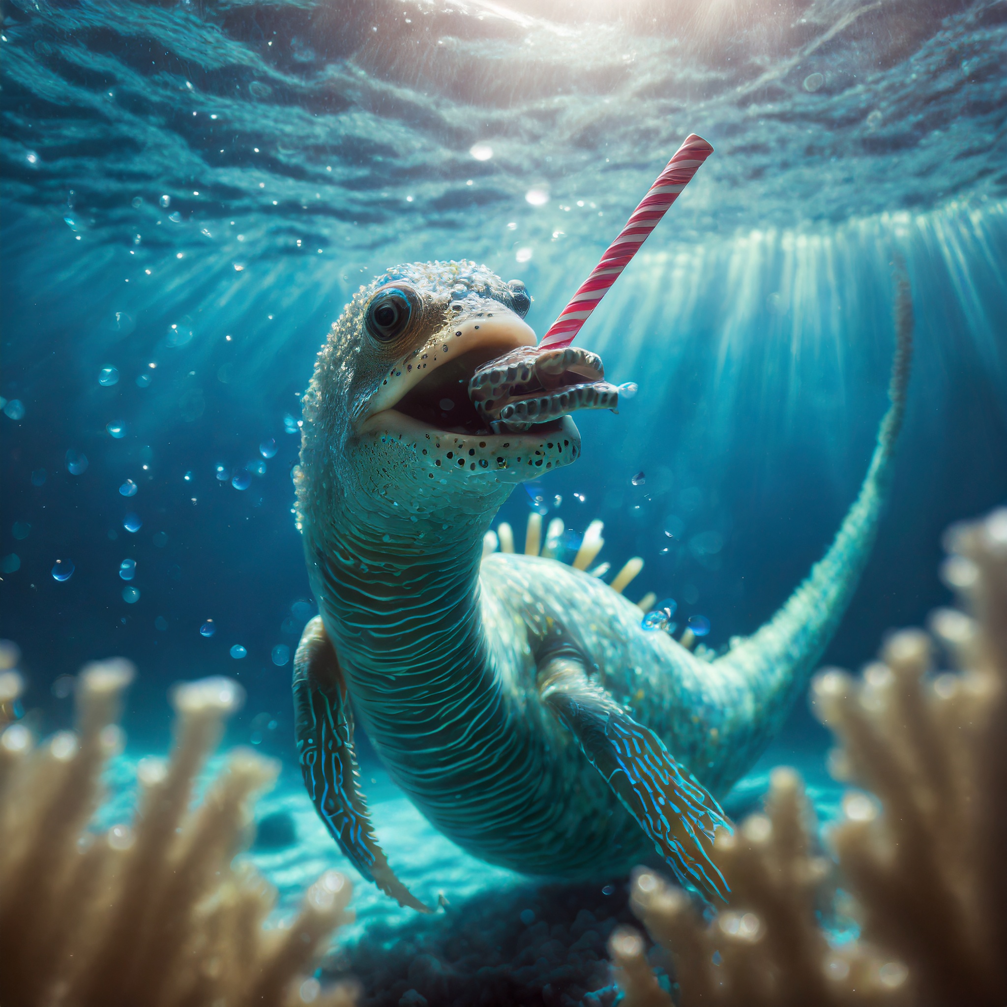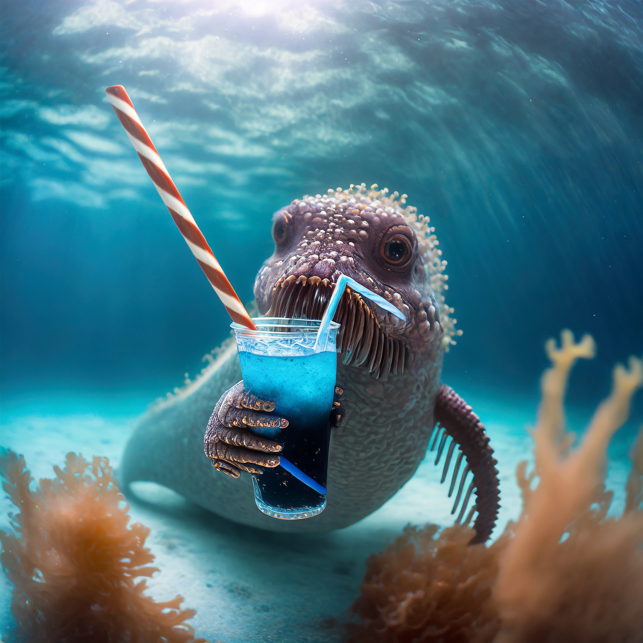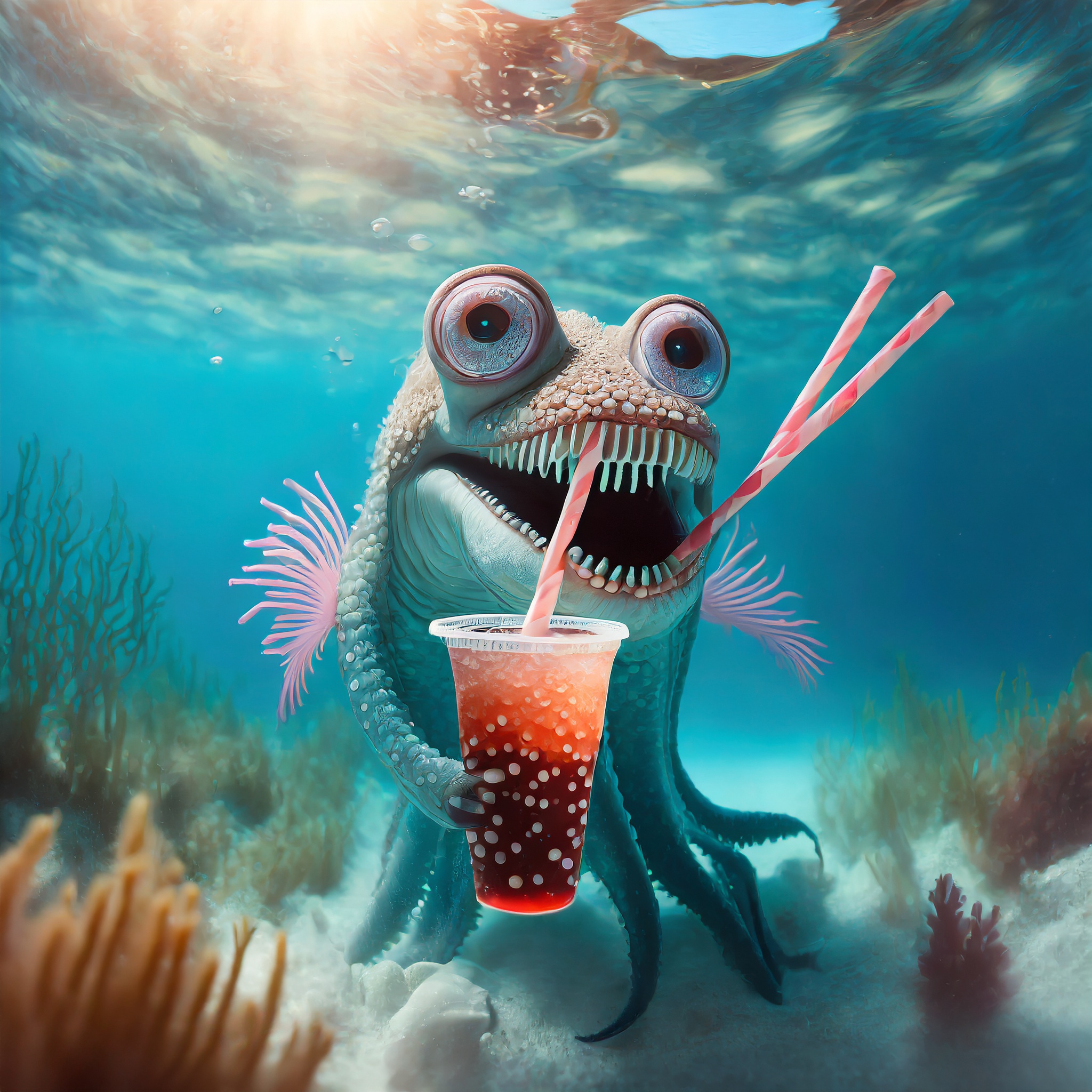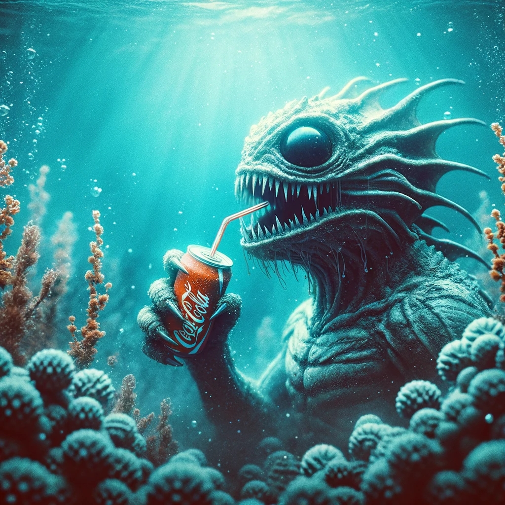 Prompt: photo of a sea monster drinking a soda with a drinking straw, underwater, deep sea, fantasy, abstract