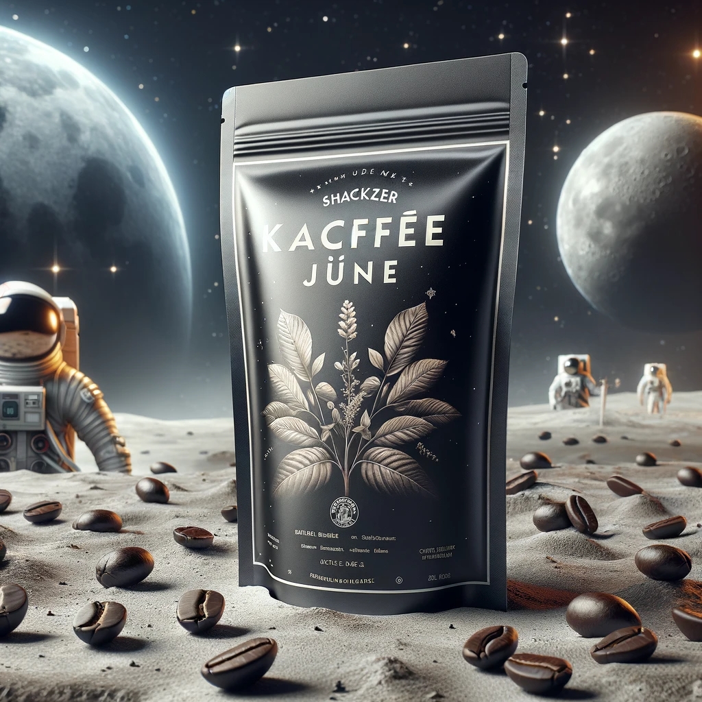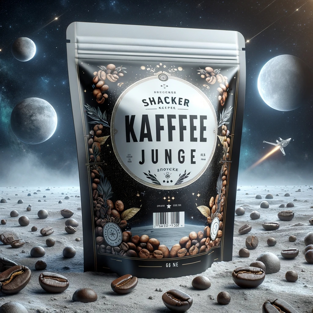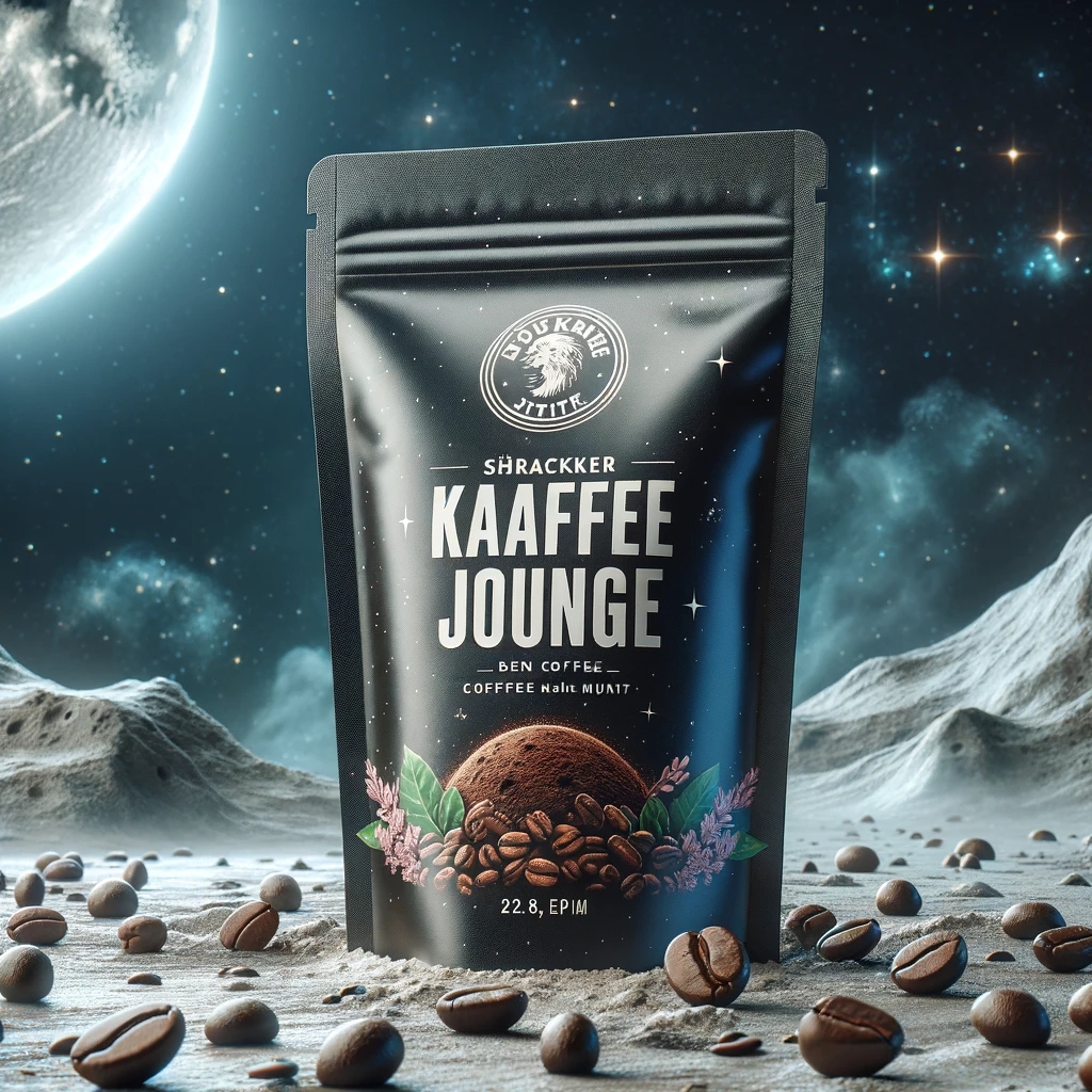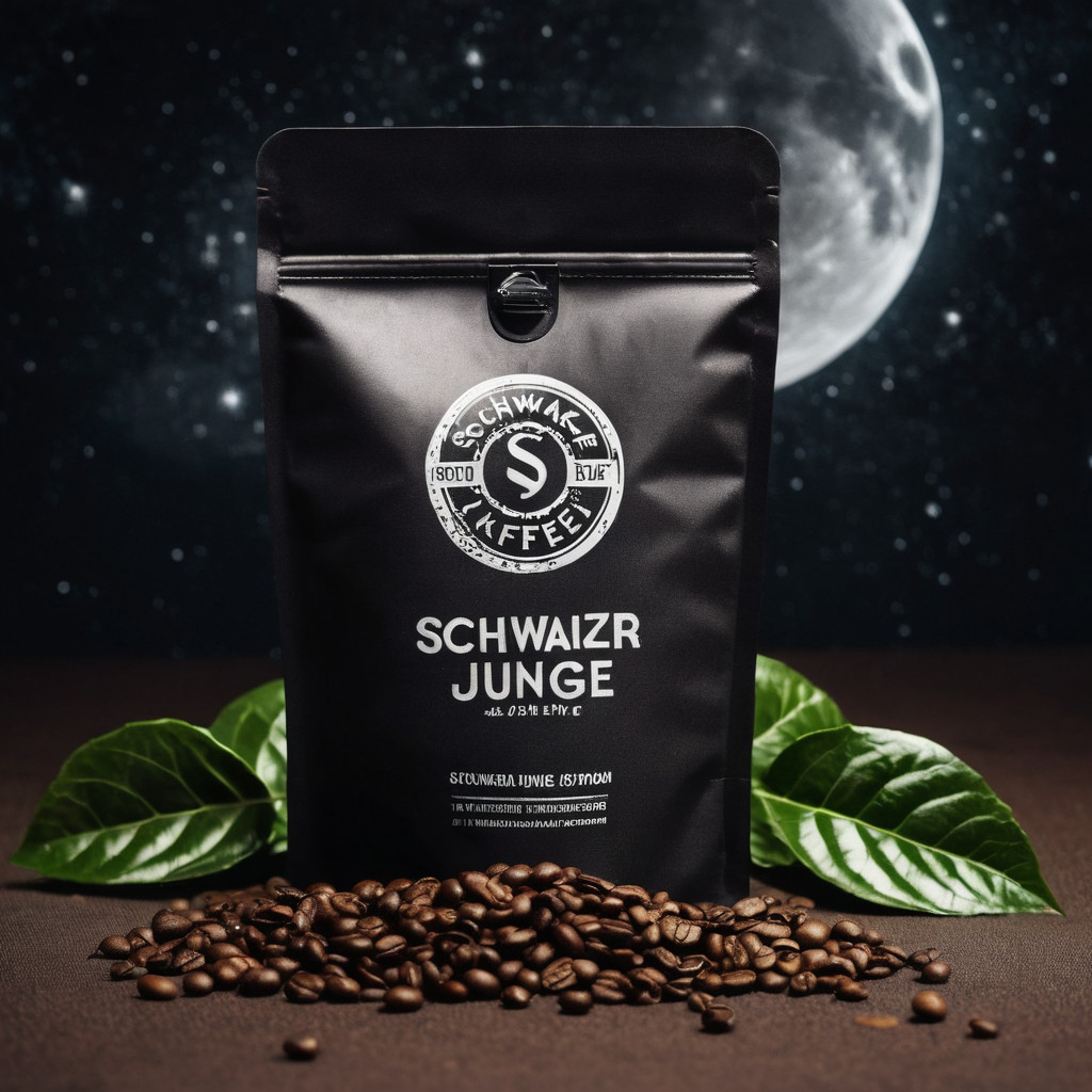 Prompt: a realistic standup pouch product photo mockup decorated with coffee beans and Coffee-leaves with the words „SCHWARZER KAFFEE JUNGE“ featured prominently, scifi, on the moon, space, stars, night