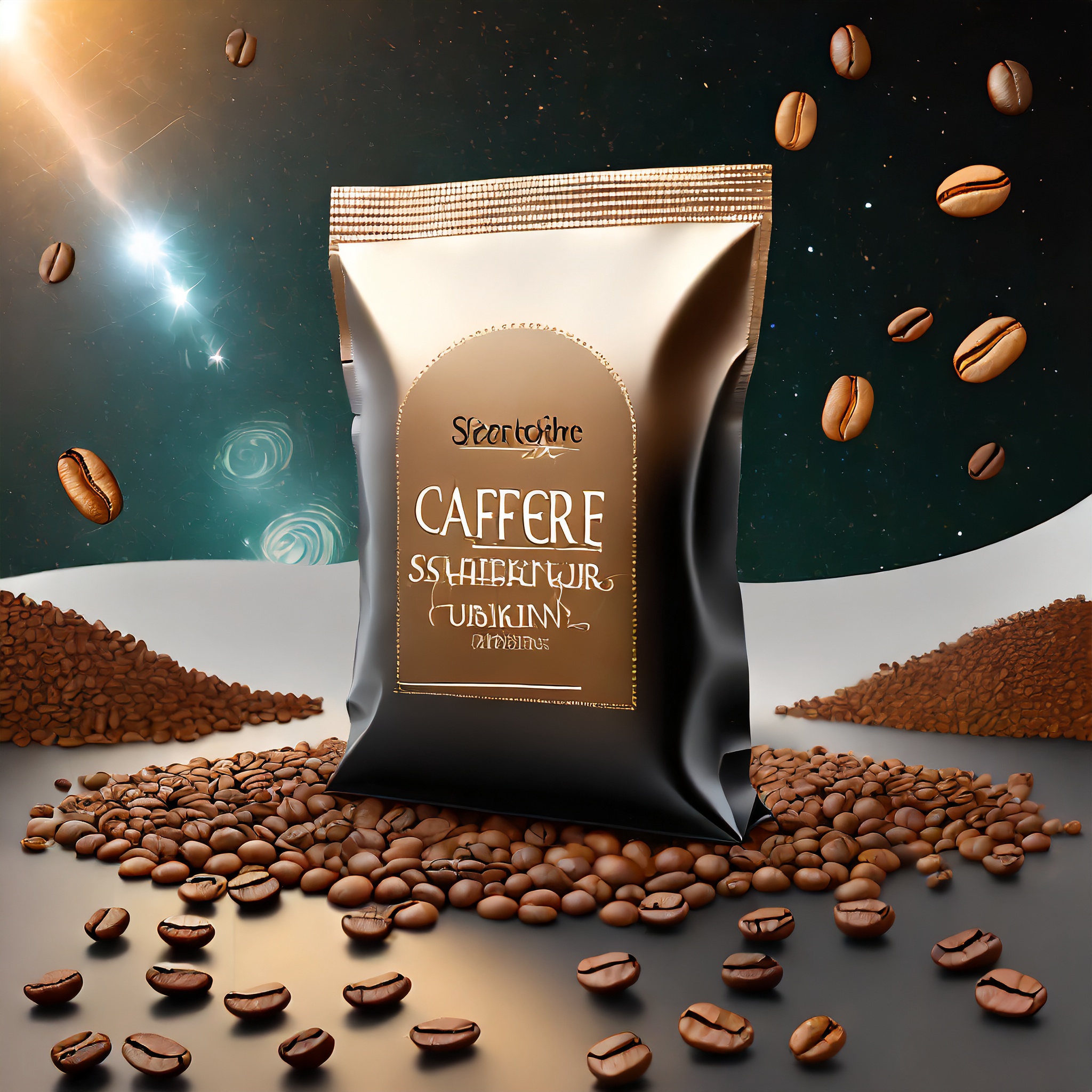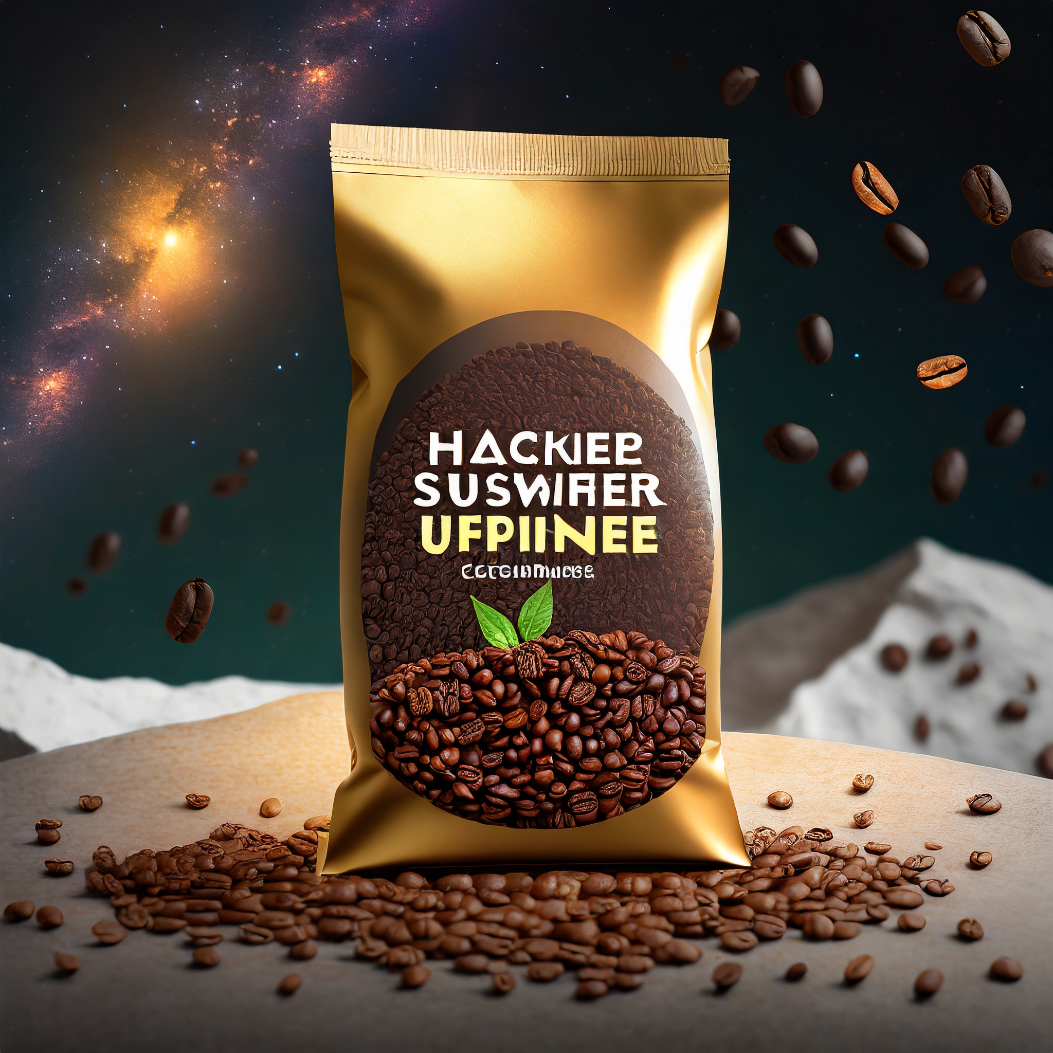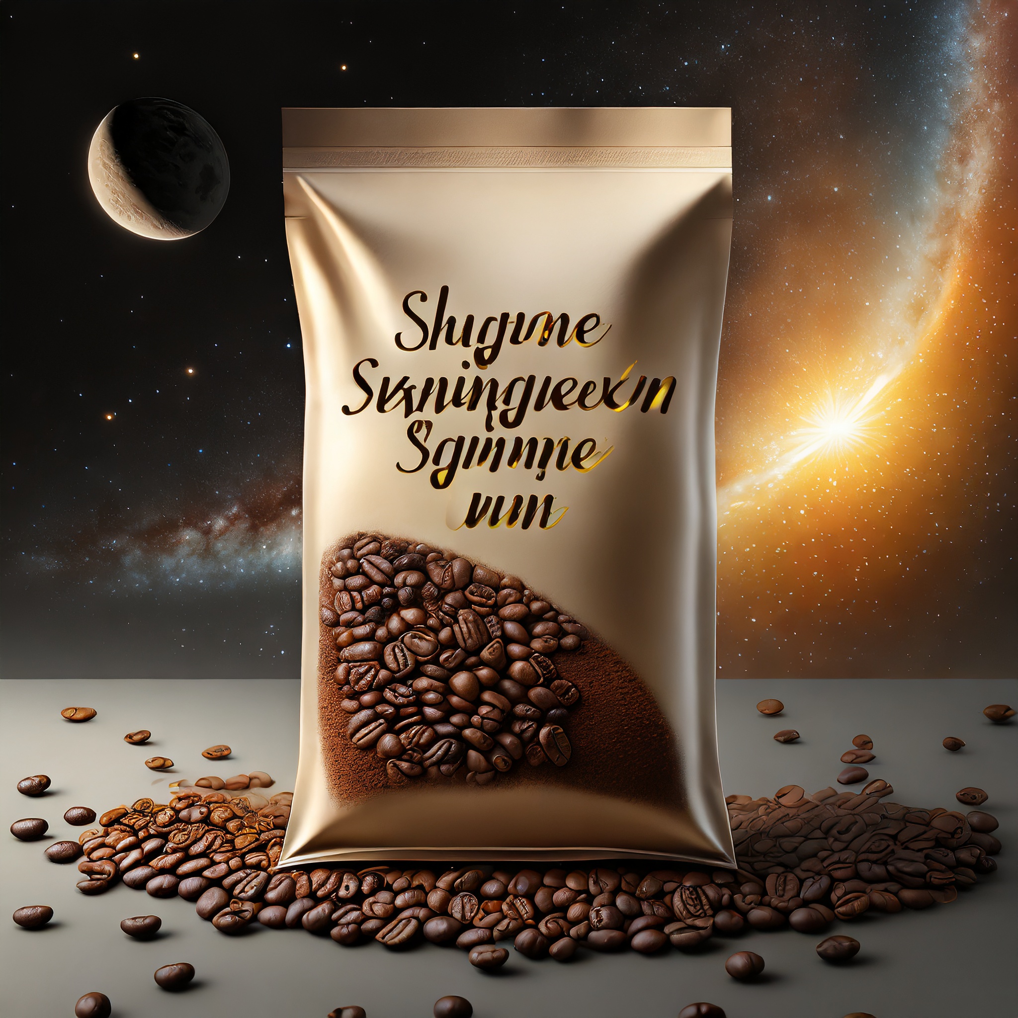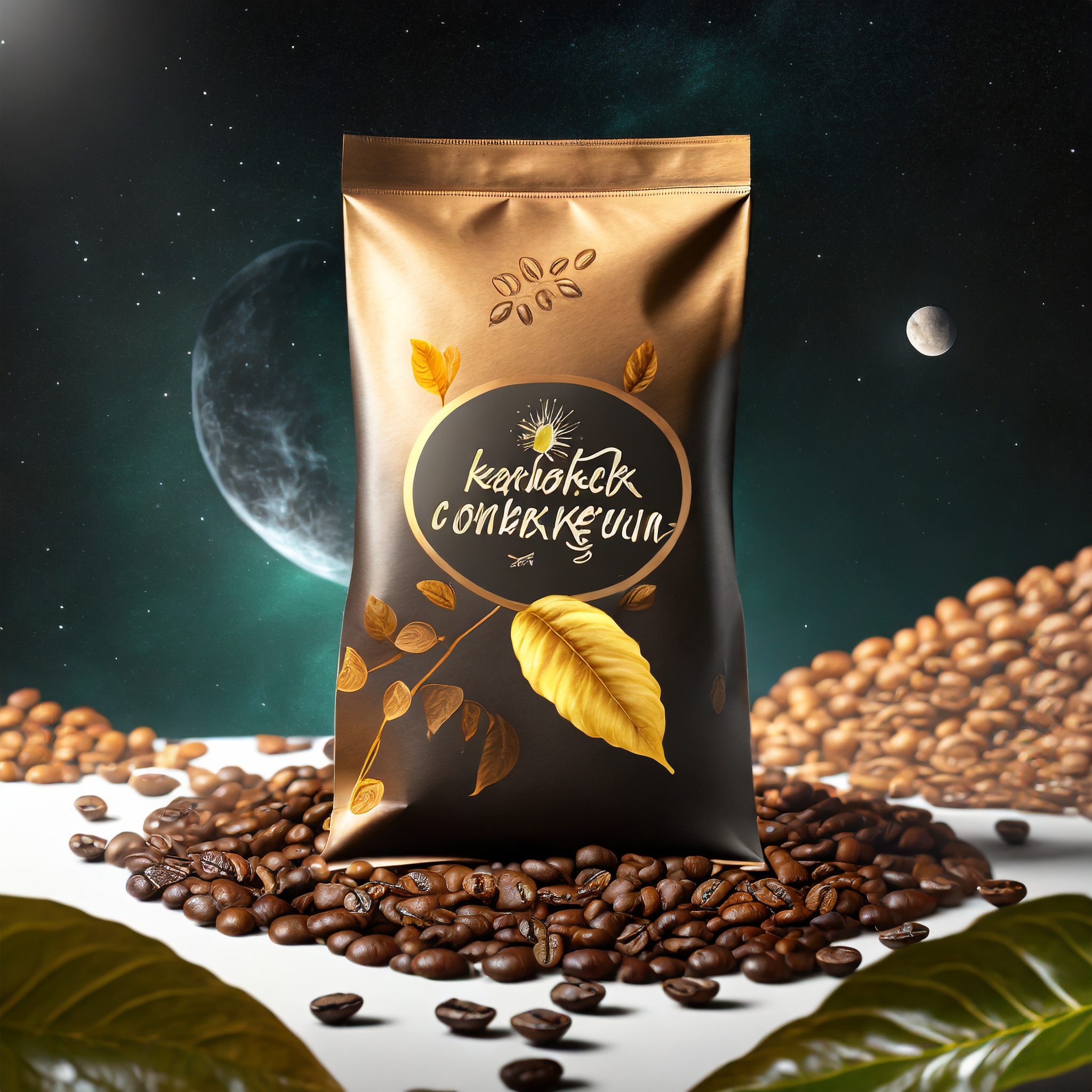 Prompt: a realistic standup pouch product photo mockup decorated with coffee beans and Coffee-leaves with the words „SCHWARZER KAFFEE JUNGE“ featured prominently, scifi, on the moon, space, stars, night
