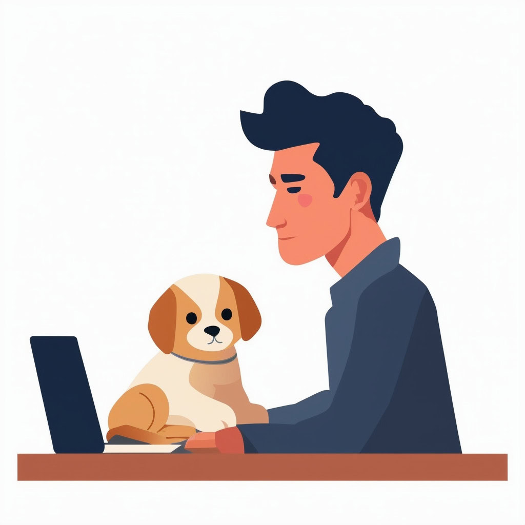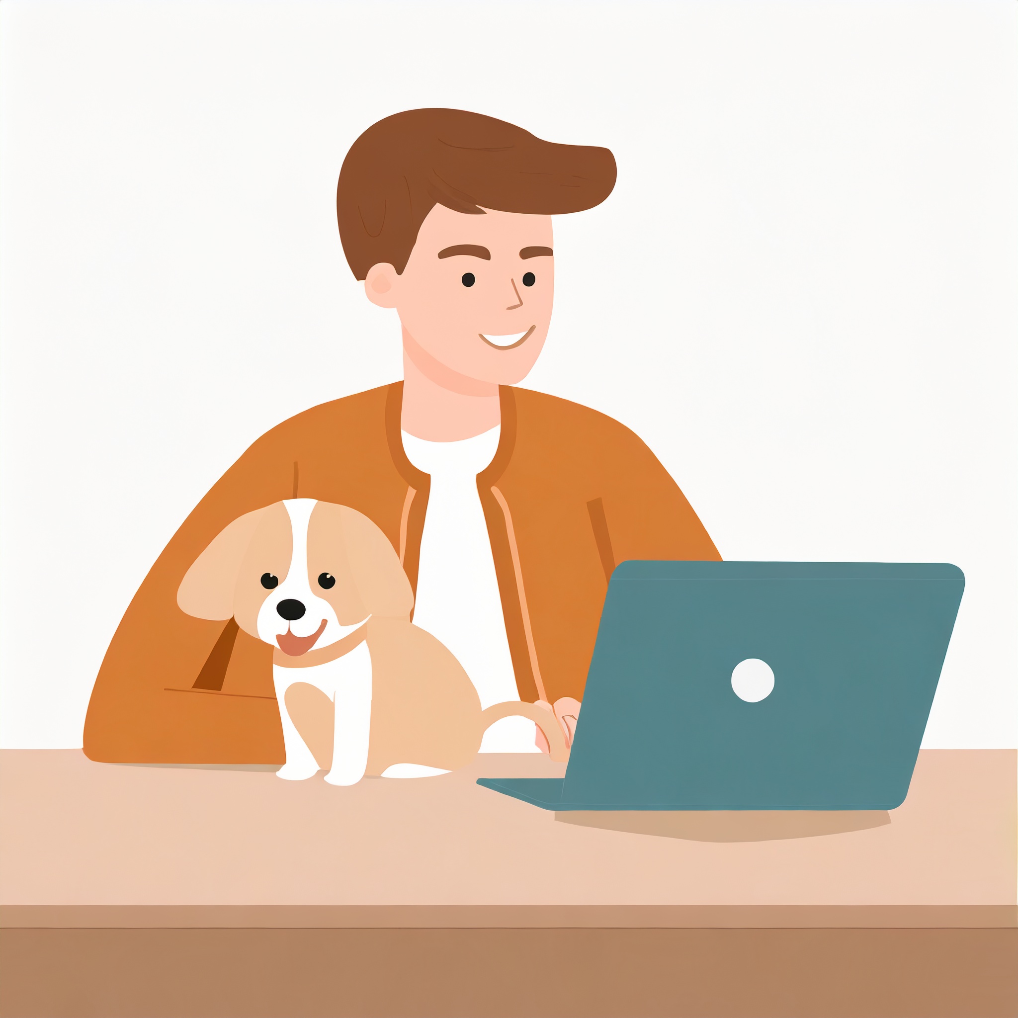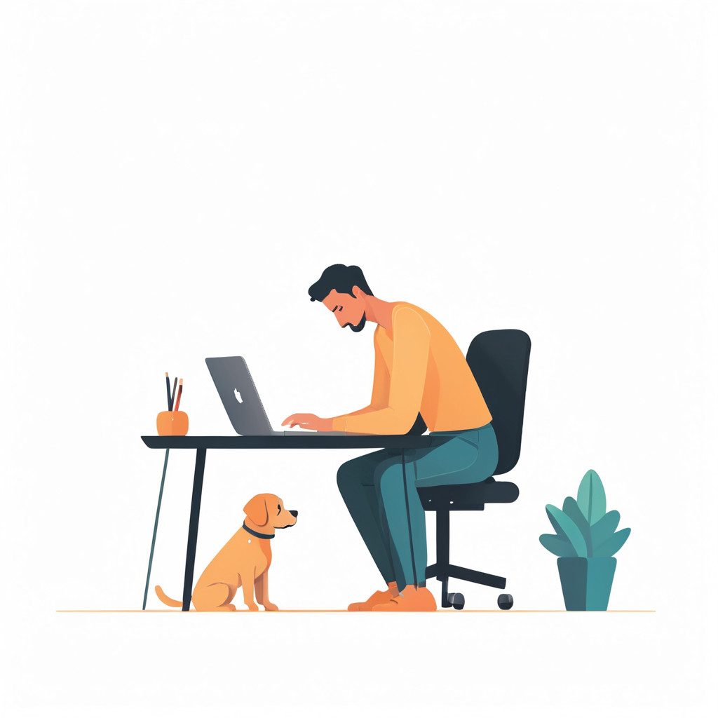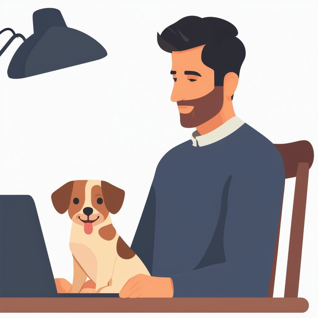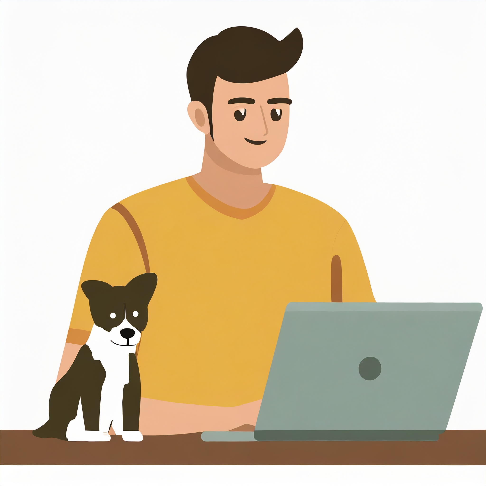 Prompt: flat vector illustration of a man sitting at a desk with his laptop, puppy, isolated on a white background, simple, minimalistic, closeup