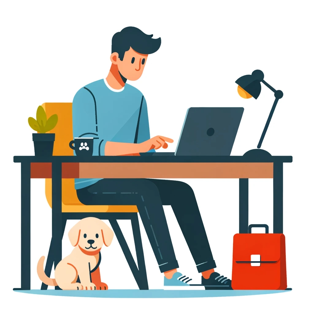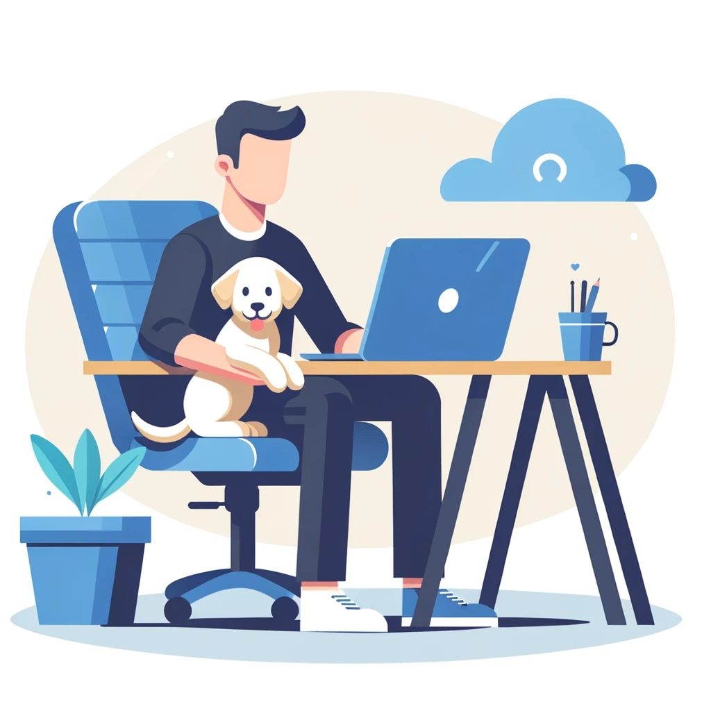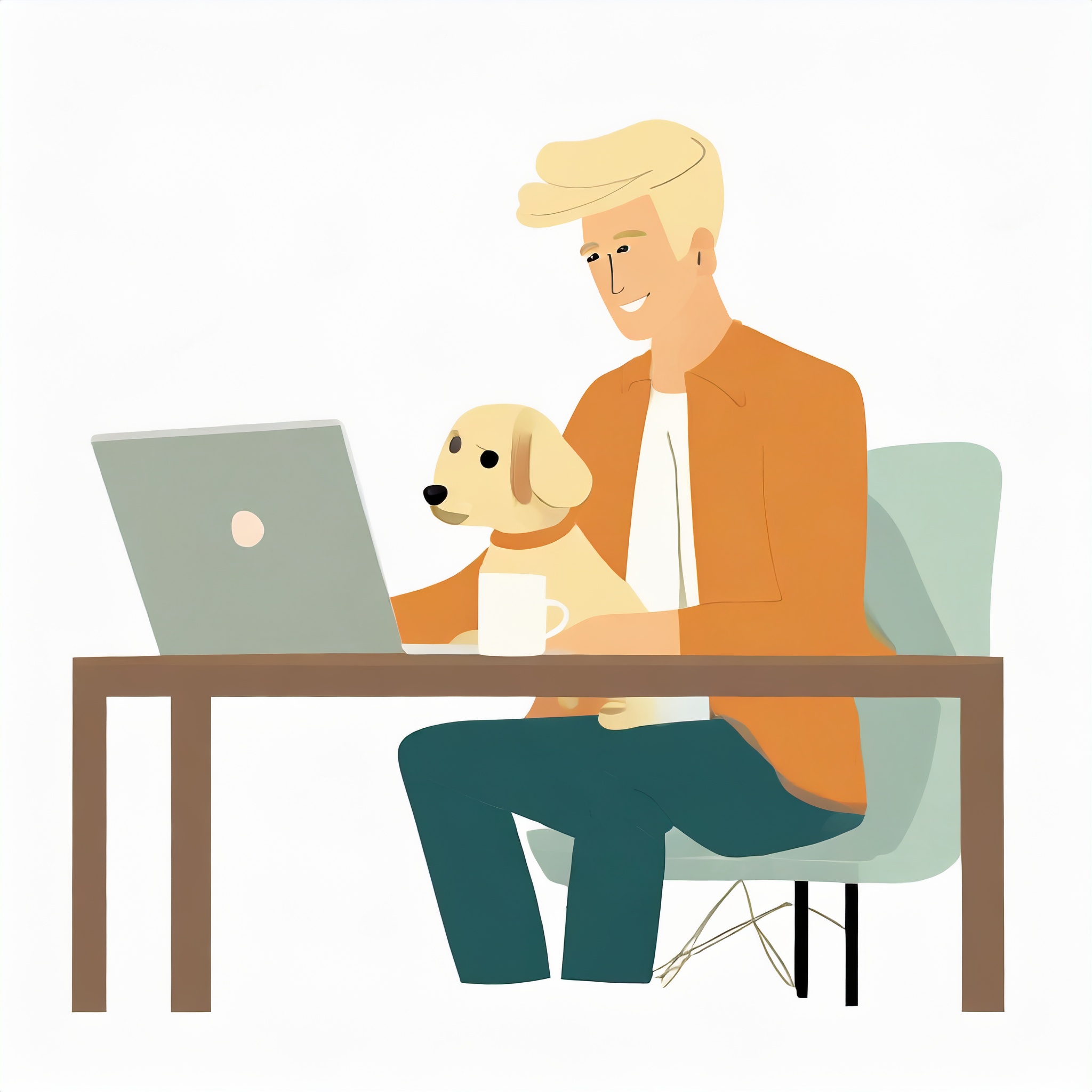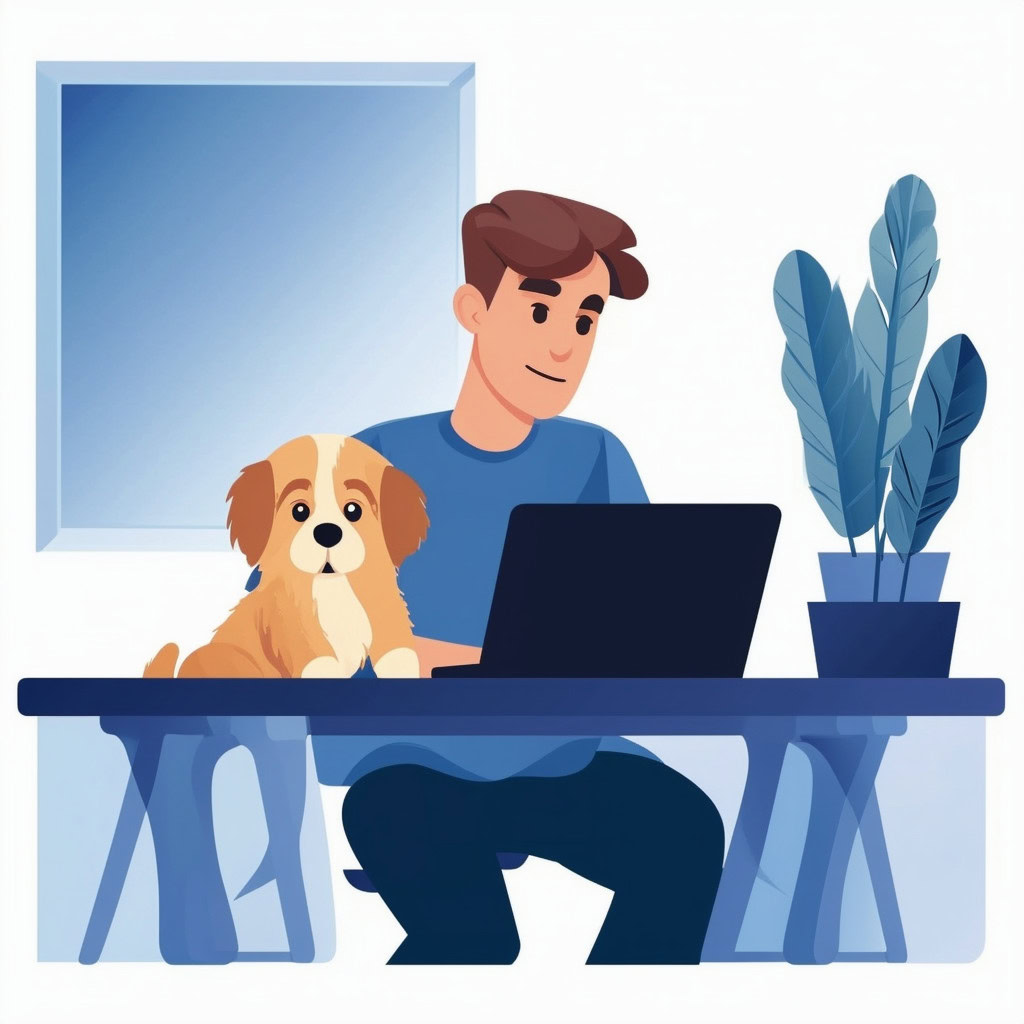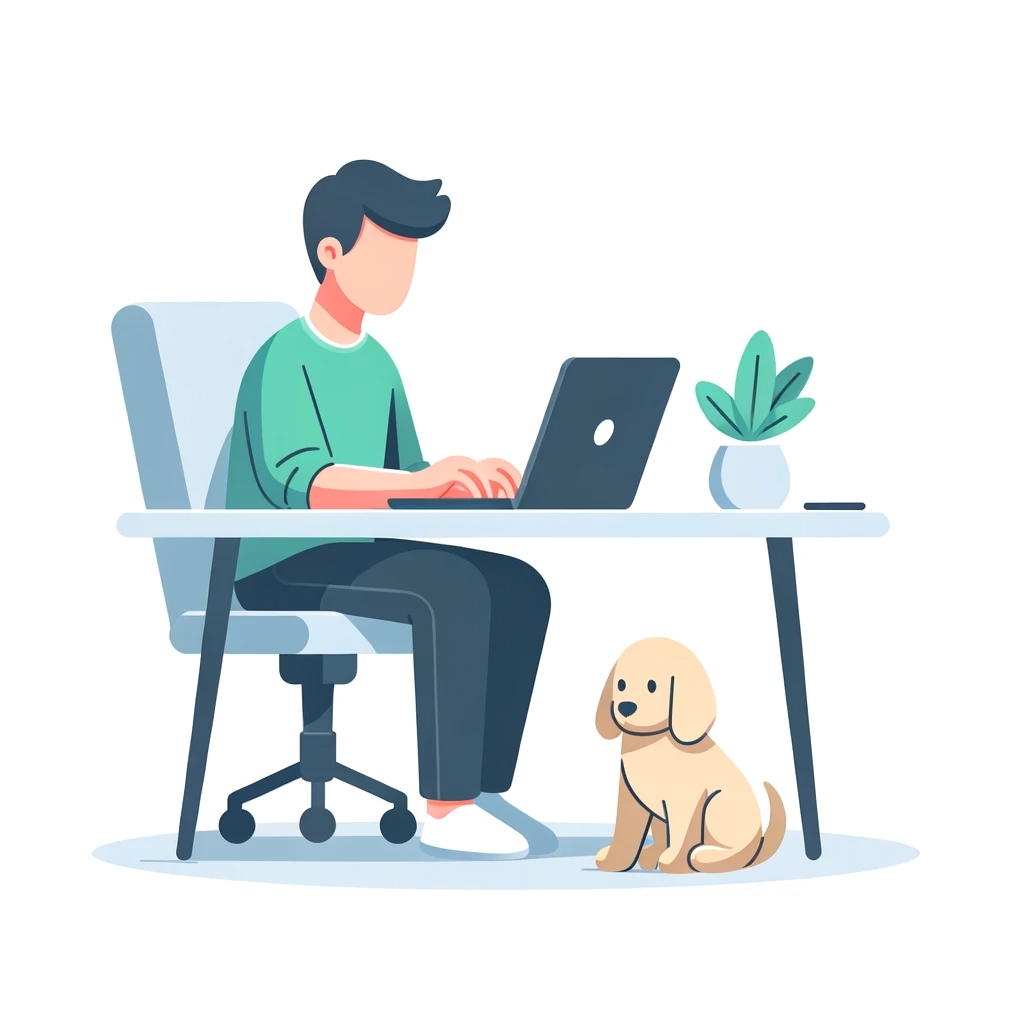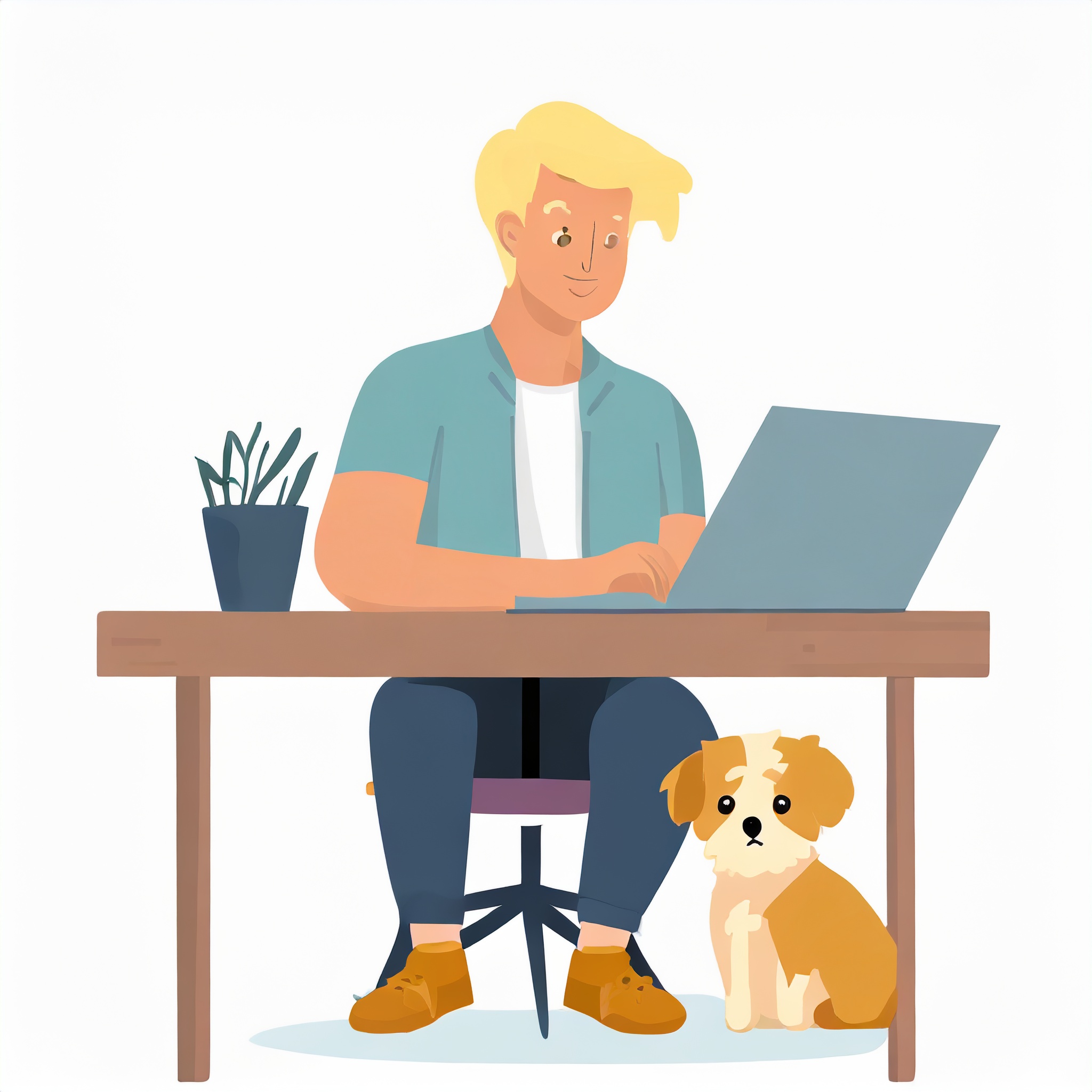 Prompt: flat vector illustration of a man sitting at a desk with his laptop, puppy, isolated on a white background, simple, minimalistic, closeup