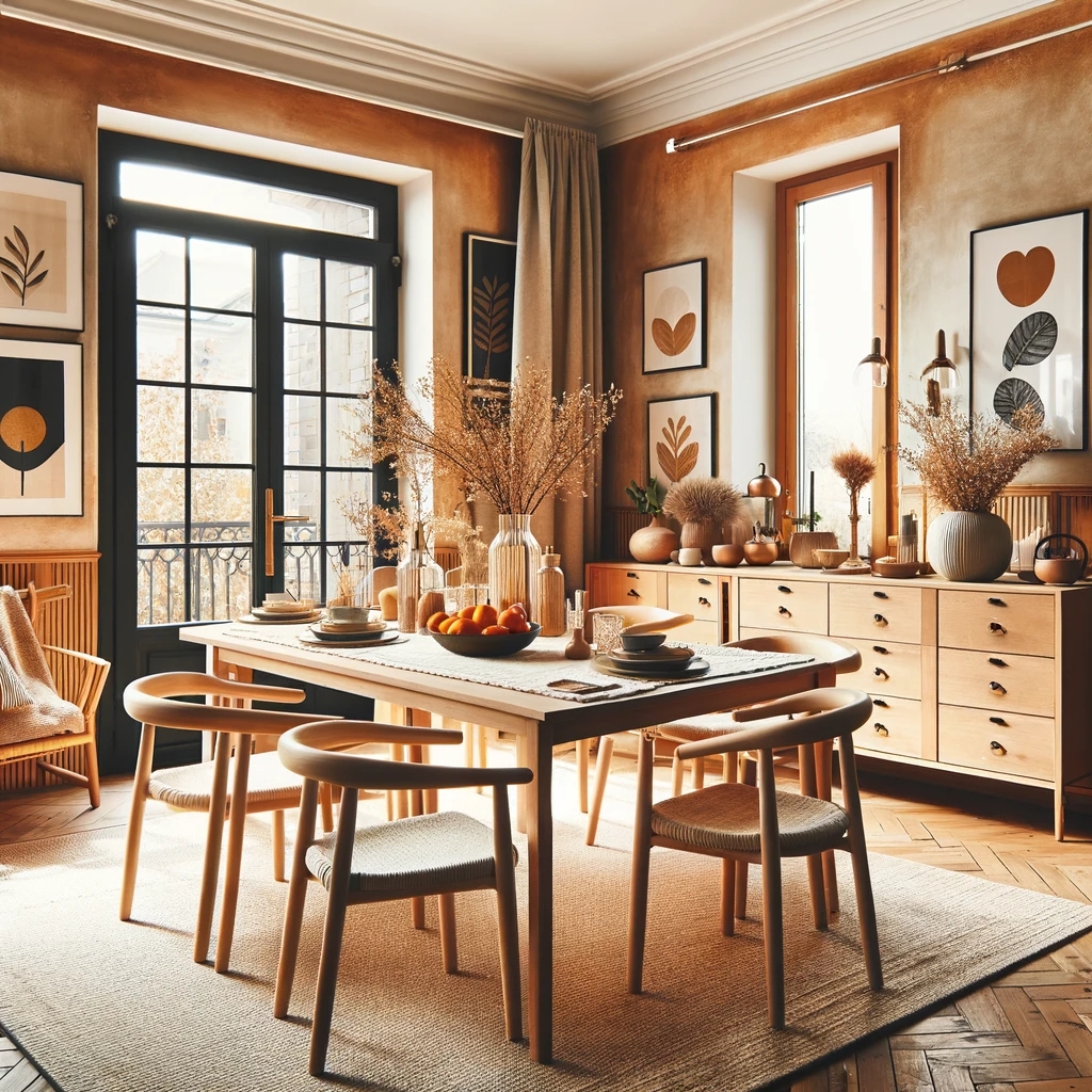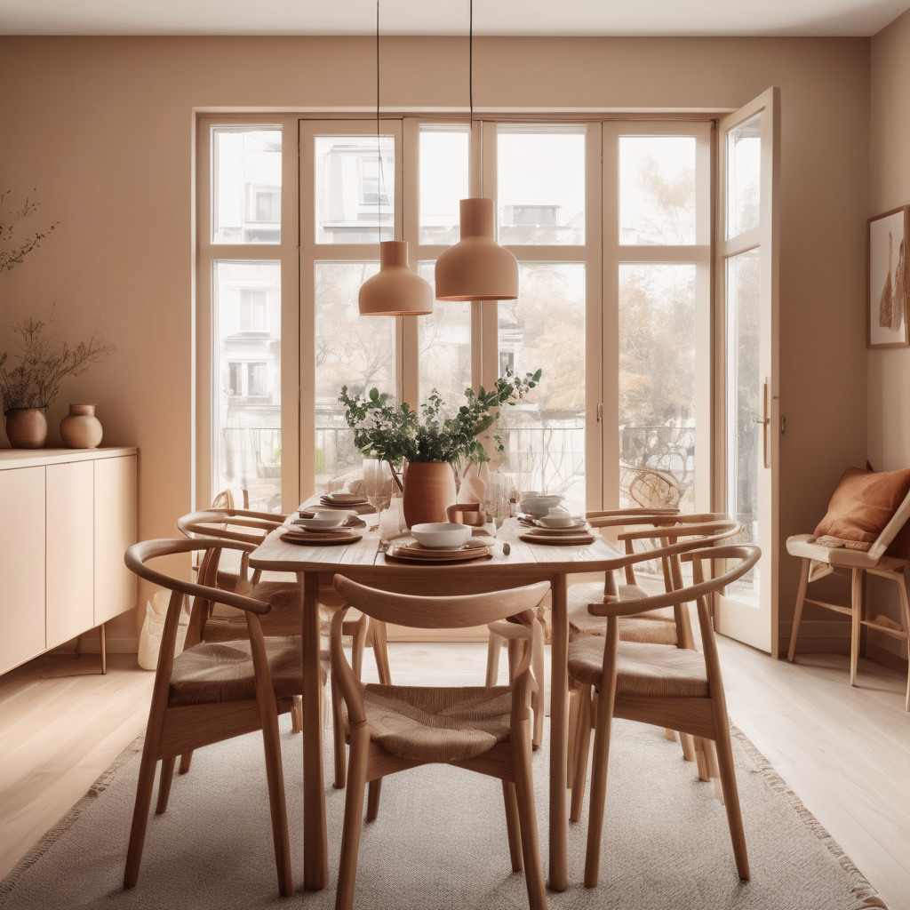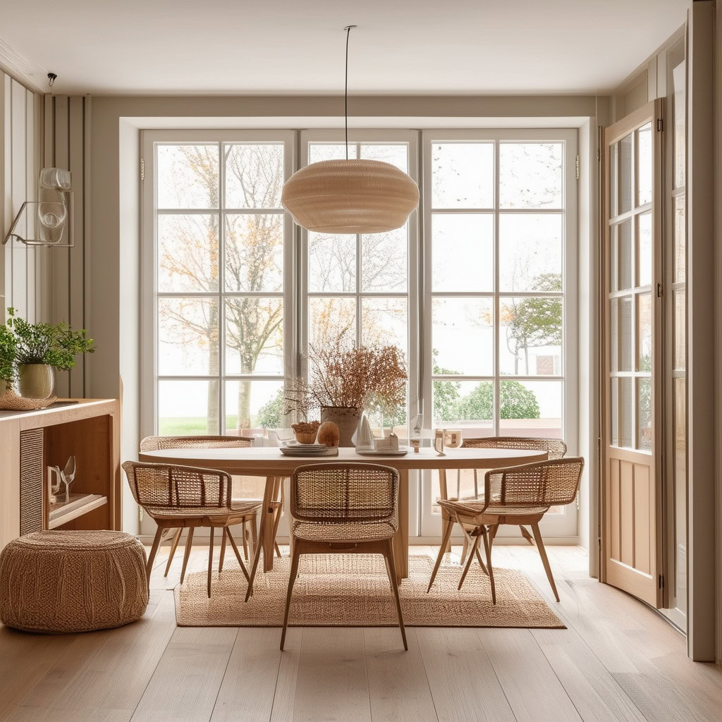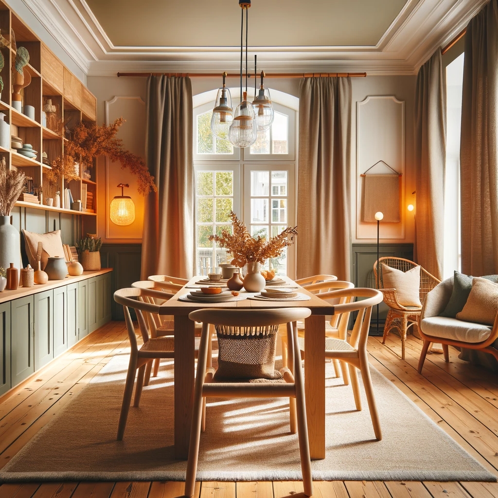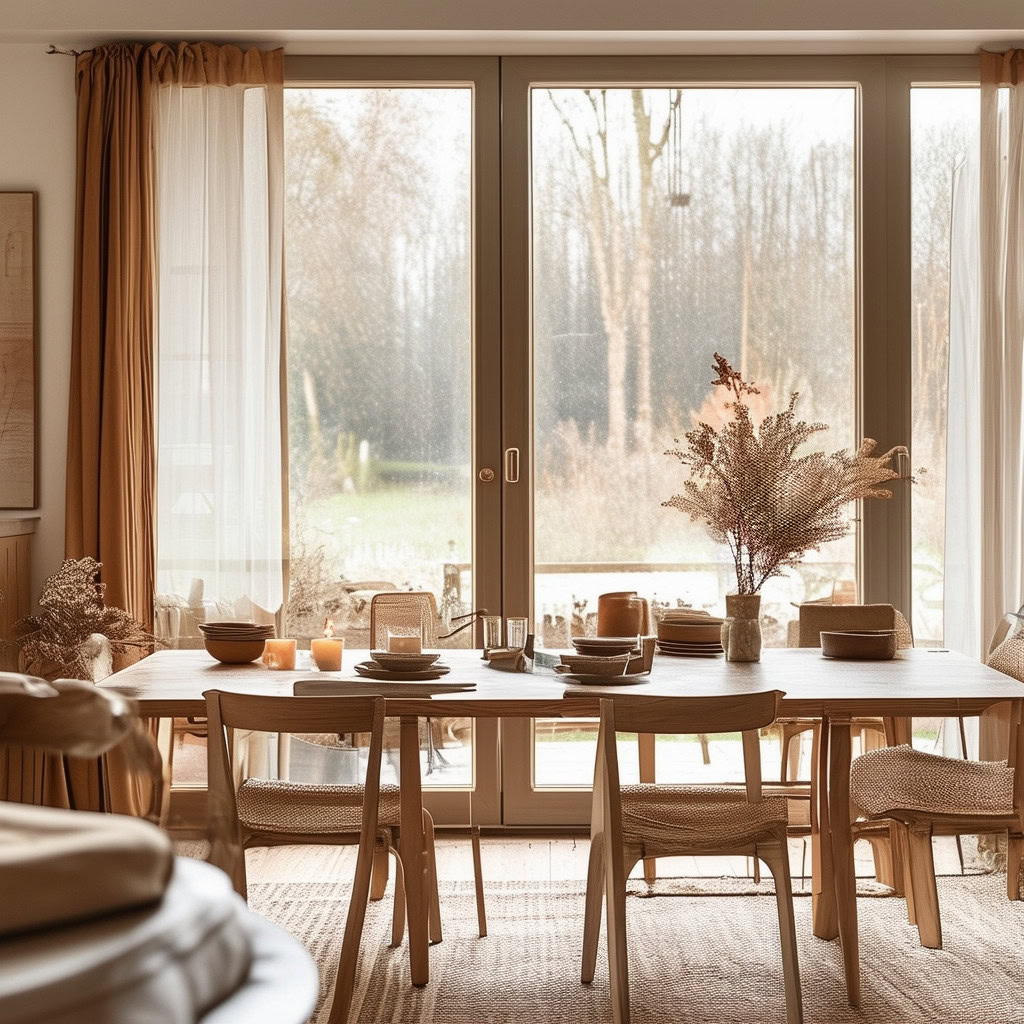 Prompt: photo of a dining room with large doors and modern swedish furniture, decorated in a bright warm and earthy color scheme, hygge style