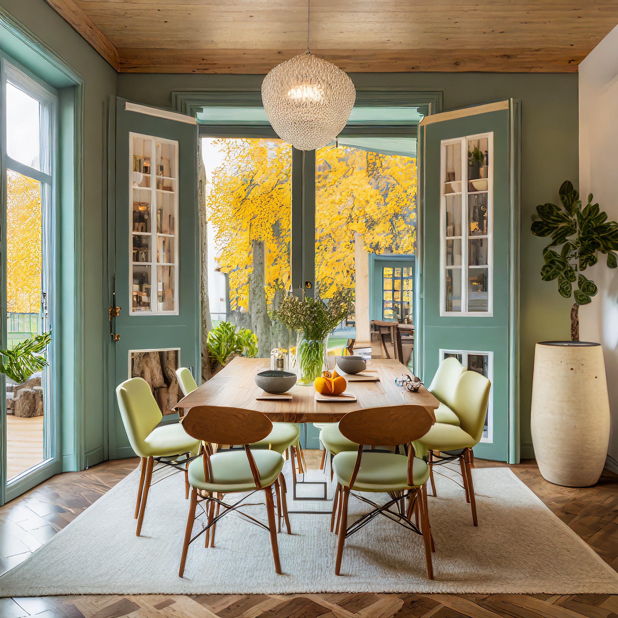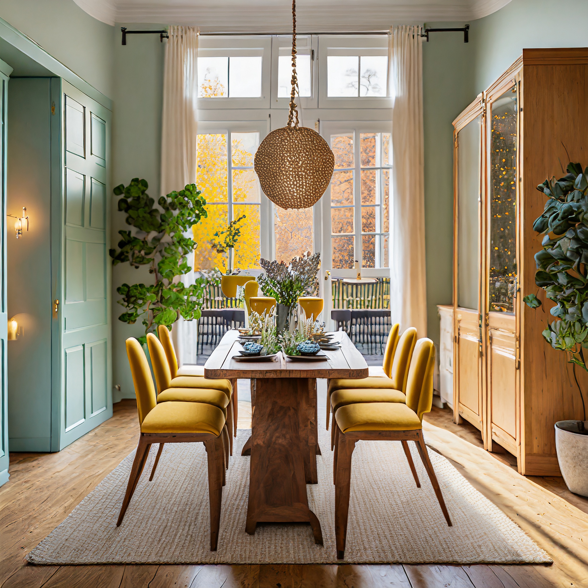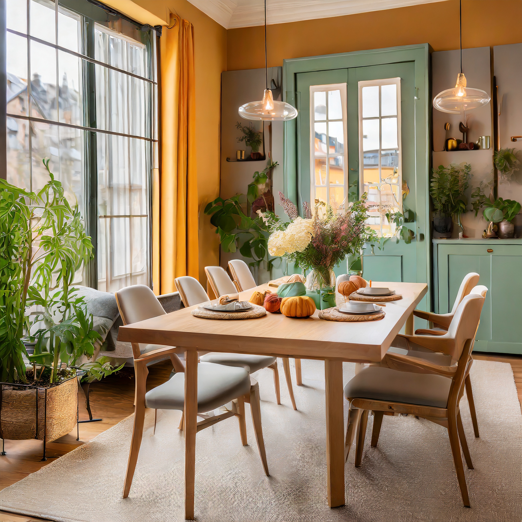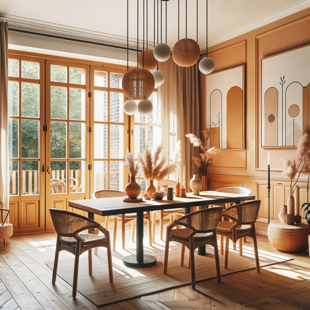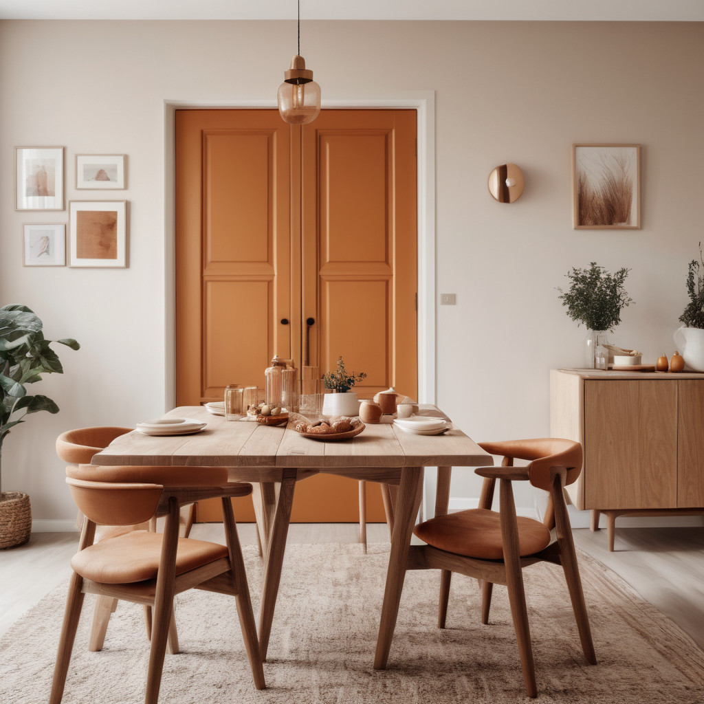 Prompt: photo of a dining room with large doors and modern swedish furniture, decorated in a bright warm and earthy color scheme, hygge style