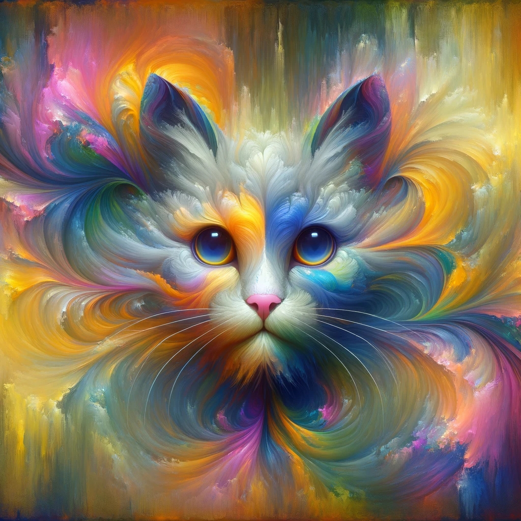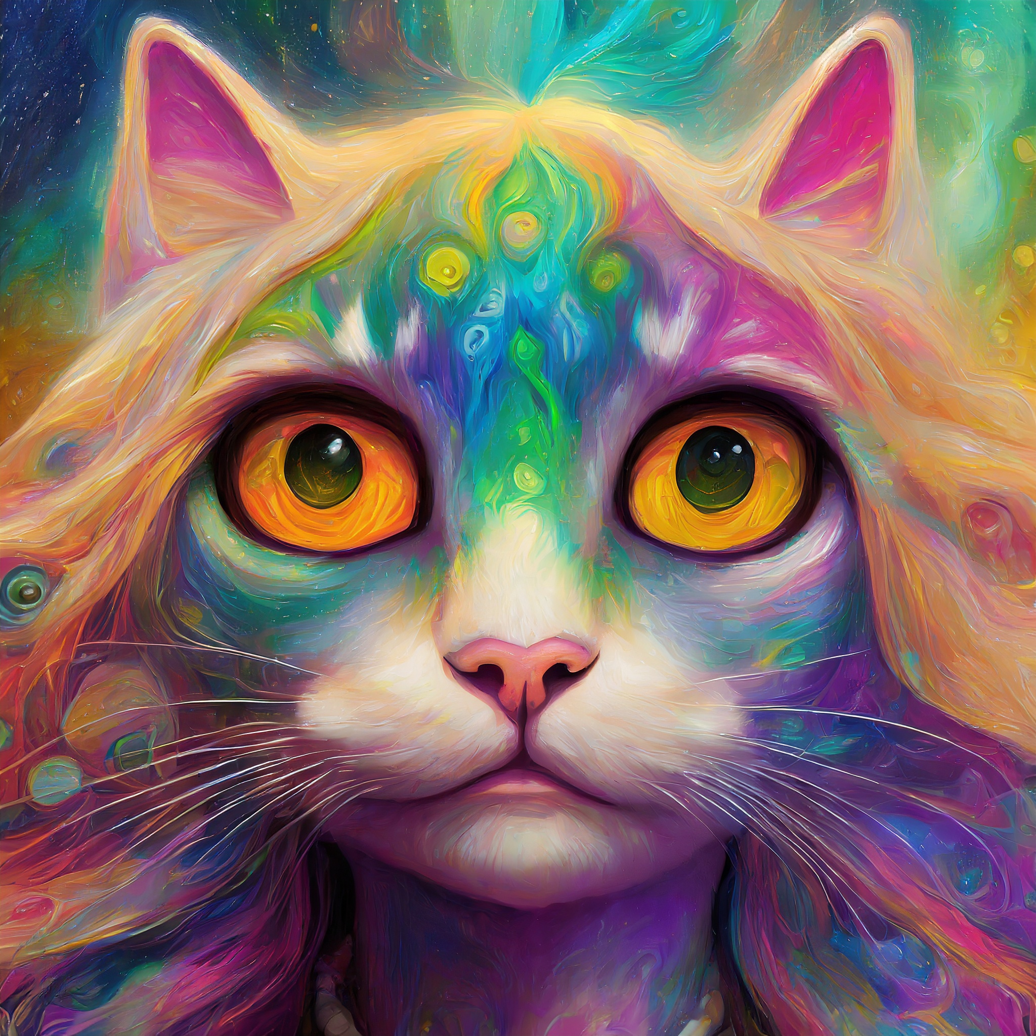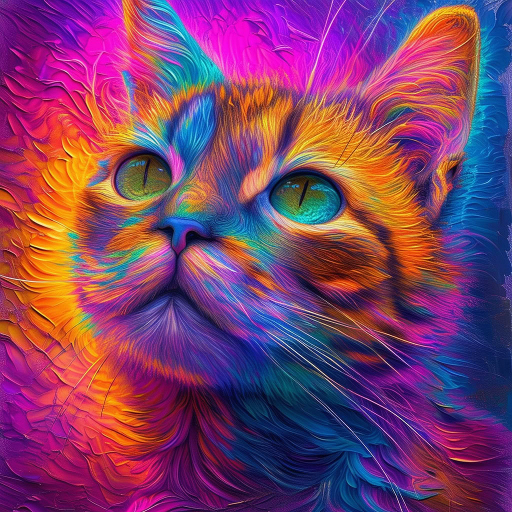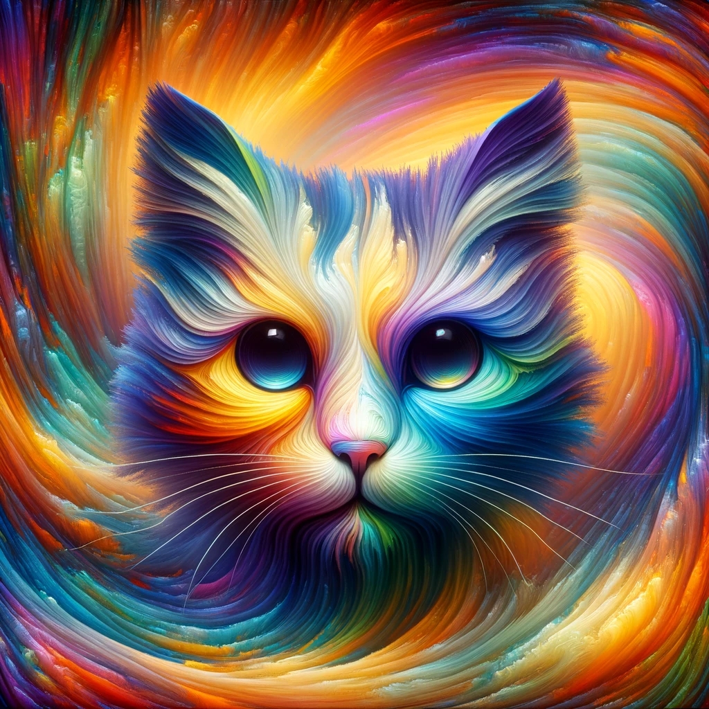 Prompt: fantasy 3d illustration of a colorful cat, centered, looking at viewer, psychedelic art, abstract, ehemeral, elusive and unstable, psychedelic background, oil painting texture
