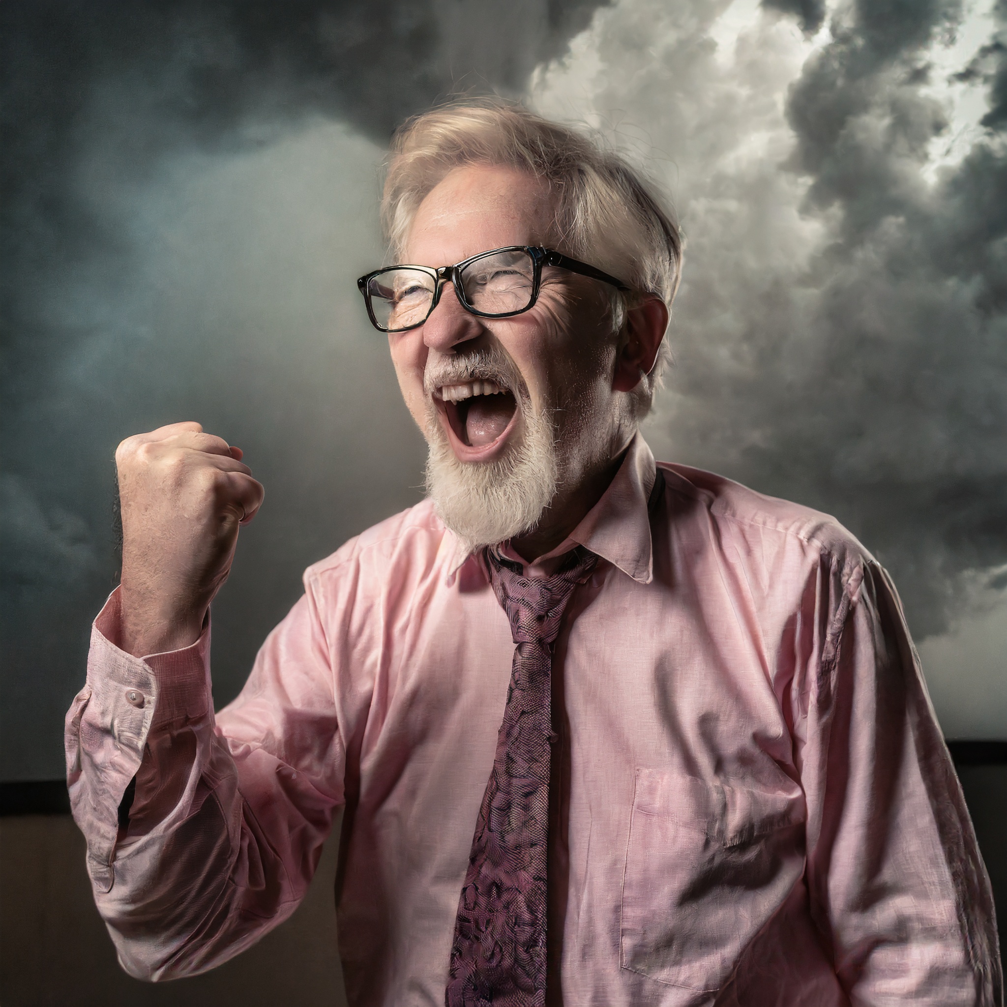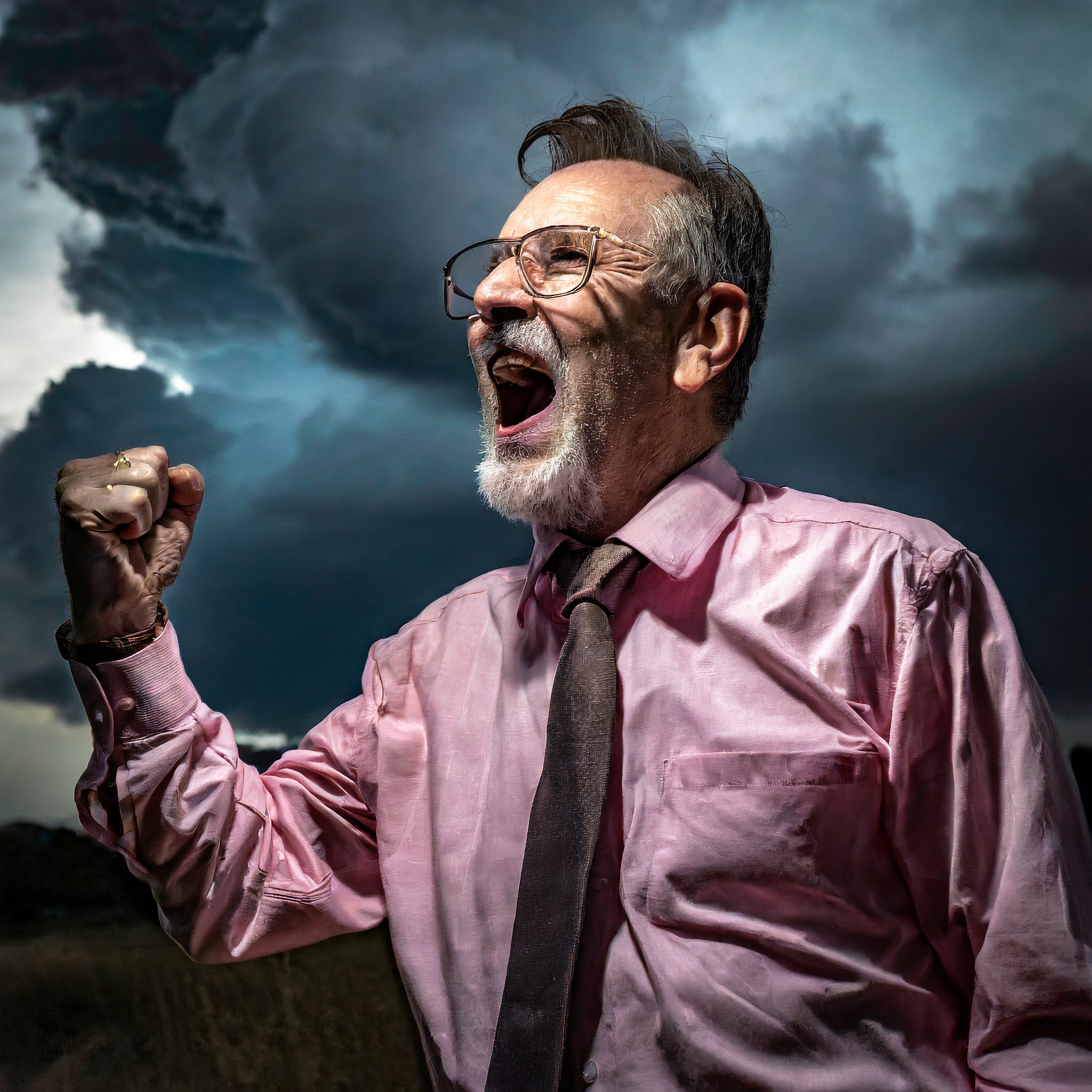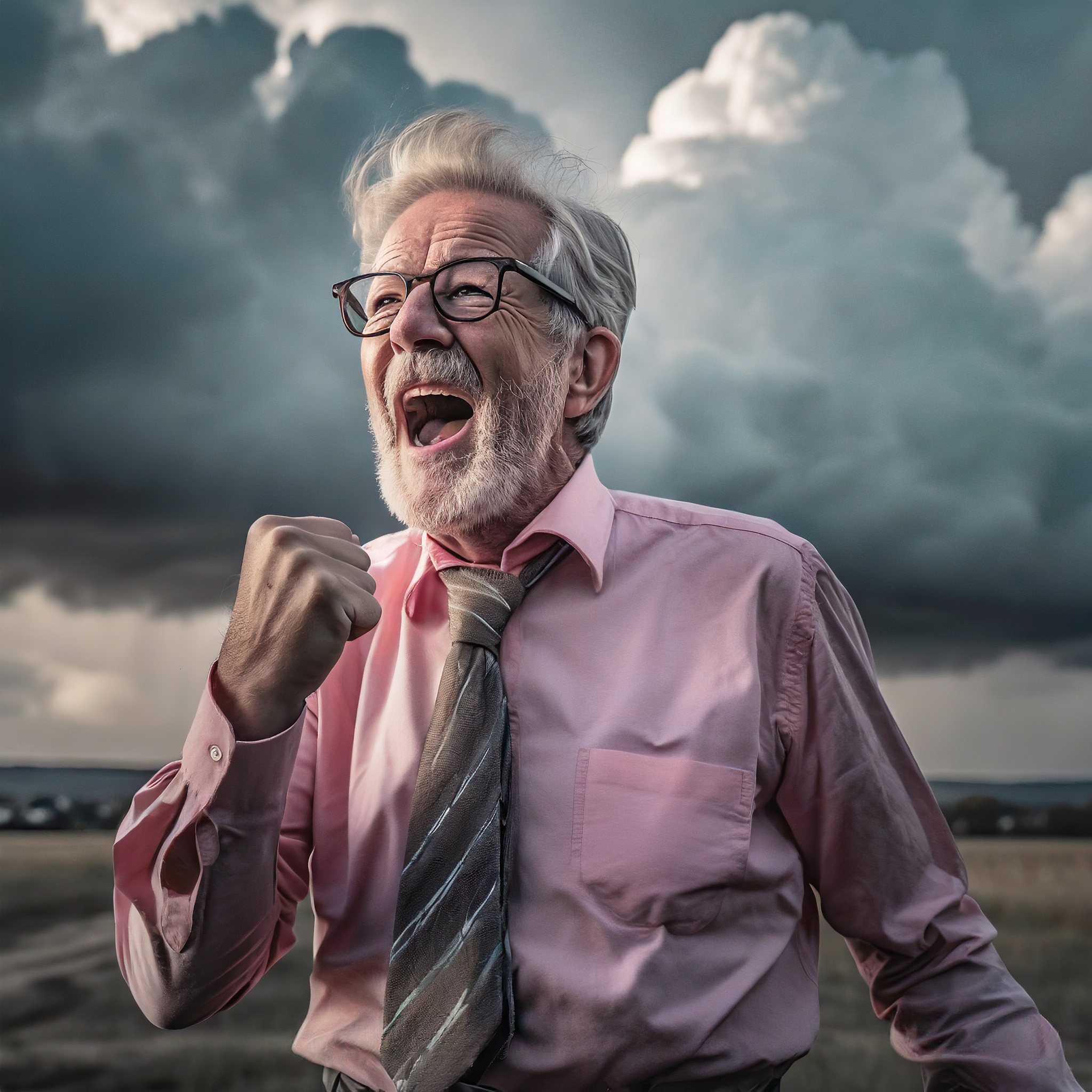 Prompt: photo of a frail old man with clenched fist yelling wearing glasses and an old faded pinkish shirt with a tie around his neck and looking at a threatening storm cloud, cinematic, detailed, atmospheric, dramatic light