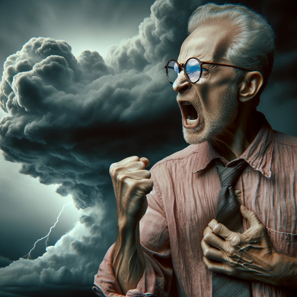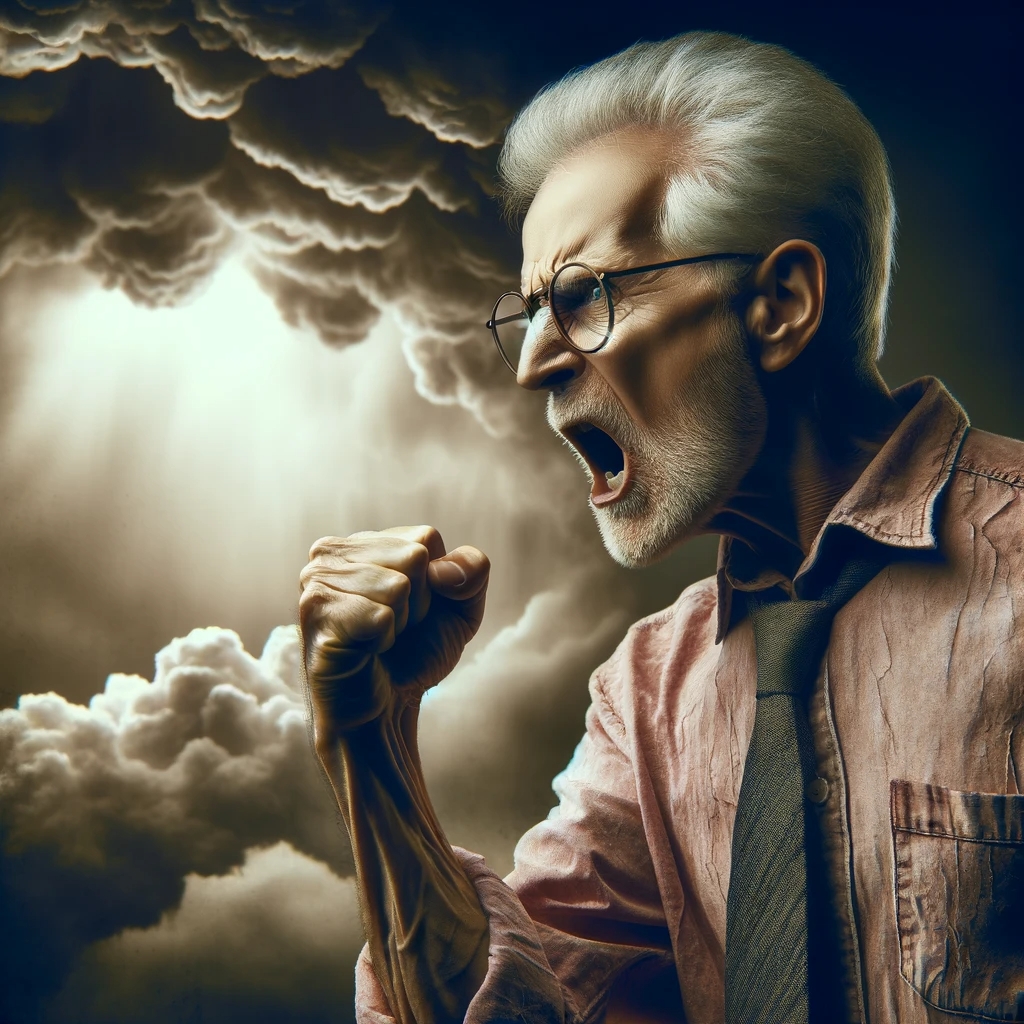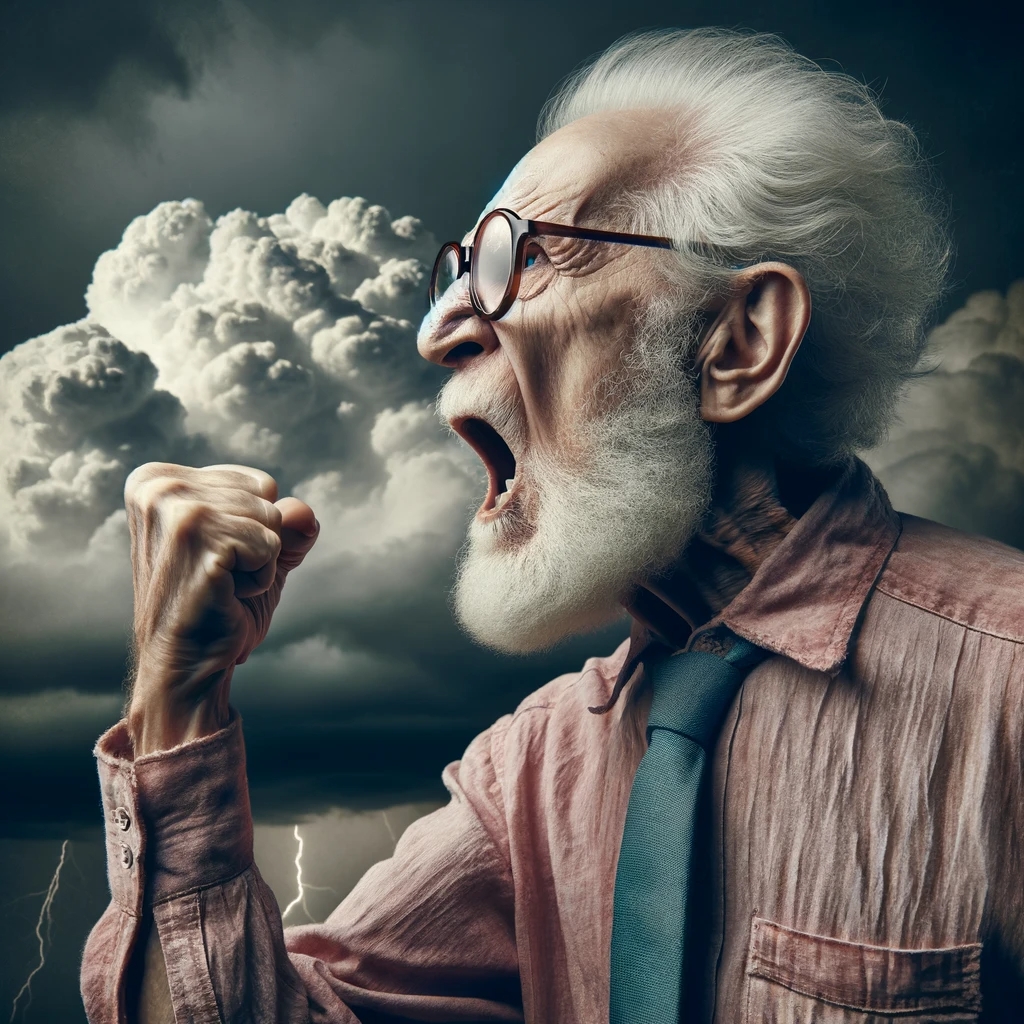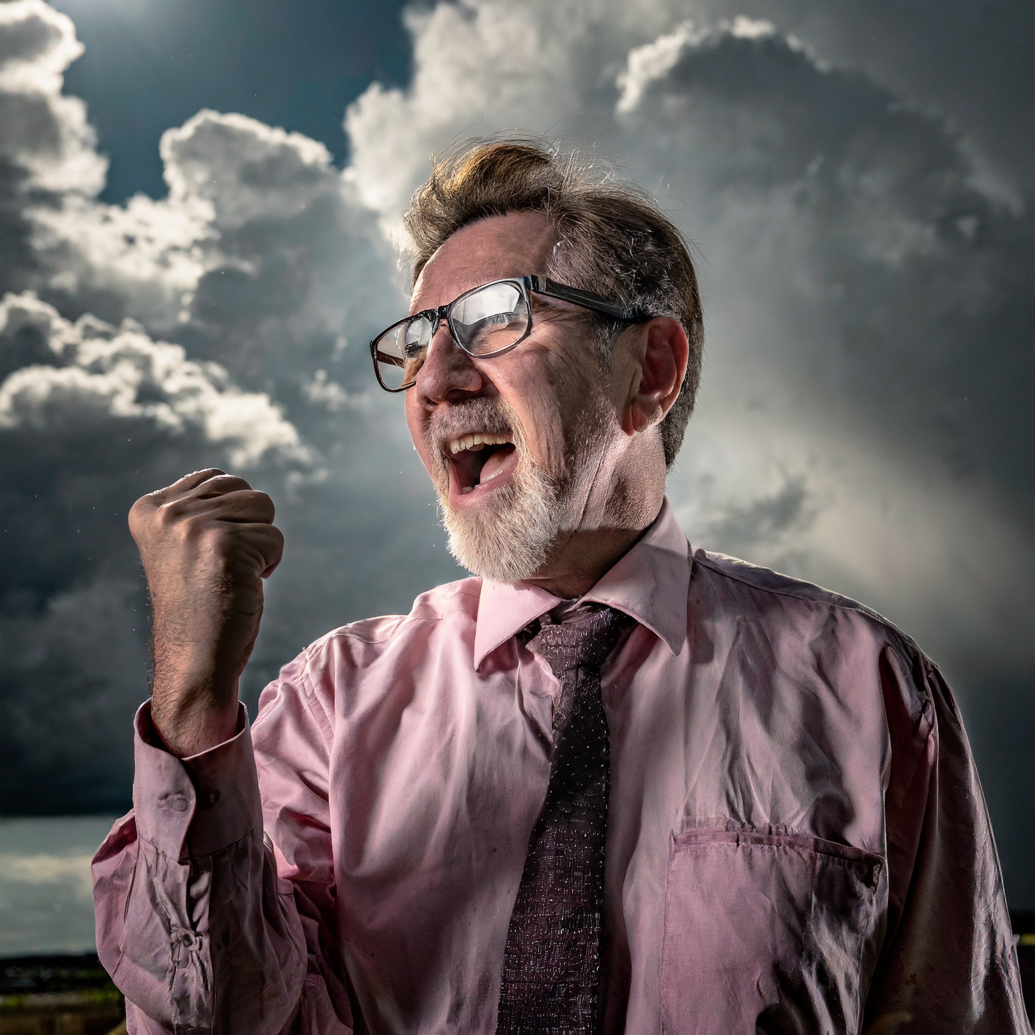Prompt: photo of a frail old man with clenched fist yelling wearing glasses and an old faded pinkish shirt with a tie around his neck and looking at a threatening storm cloud, cinematic, detailed, atmospheric, dramatic light