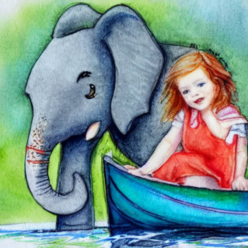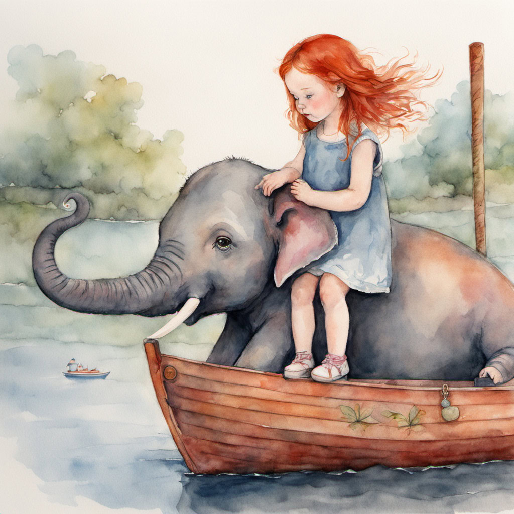 Prompt 1 : illustration of a redhaired little girl with a elephant on a boat, watercolor, pastell